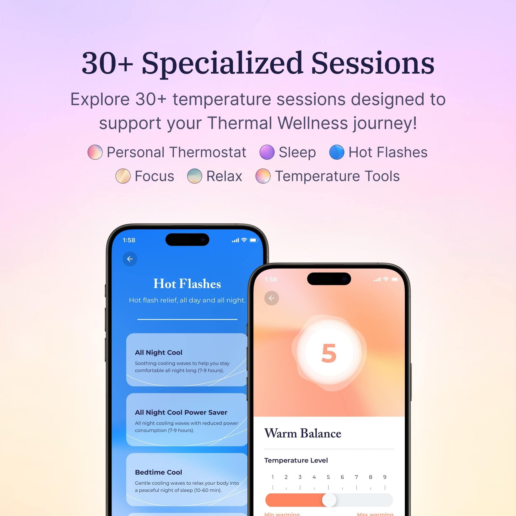 Connect to the Embr Wave 2 app to unlock dozens of ways to benefit from your device. Explore expanded cooling and warming sessions, including categories like Focus, Temperature Tools, hot flashes, sleep, tension, and relaxation. Enjoy all-day and all-night relief tailored to your needs. Quickly soothe heat with Turbo Chill, unwind with Bear Hug mode, customize durations, reprogram device buttons, and track usage patterns for optimized comfort.