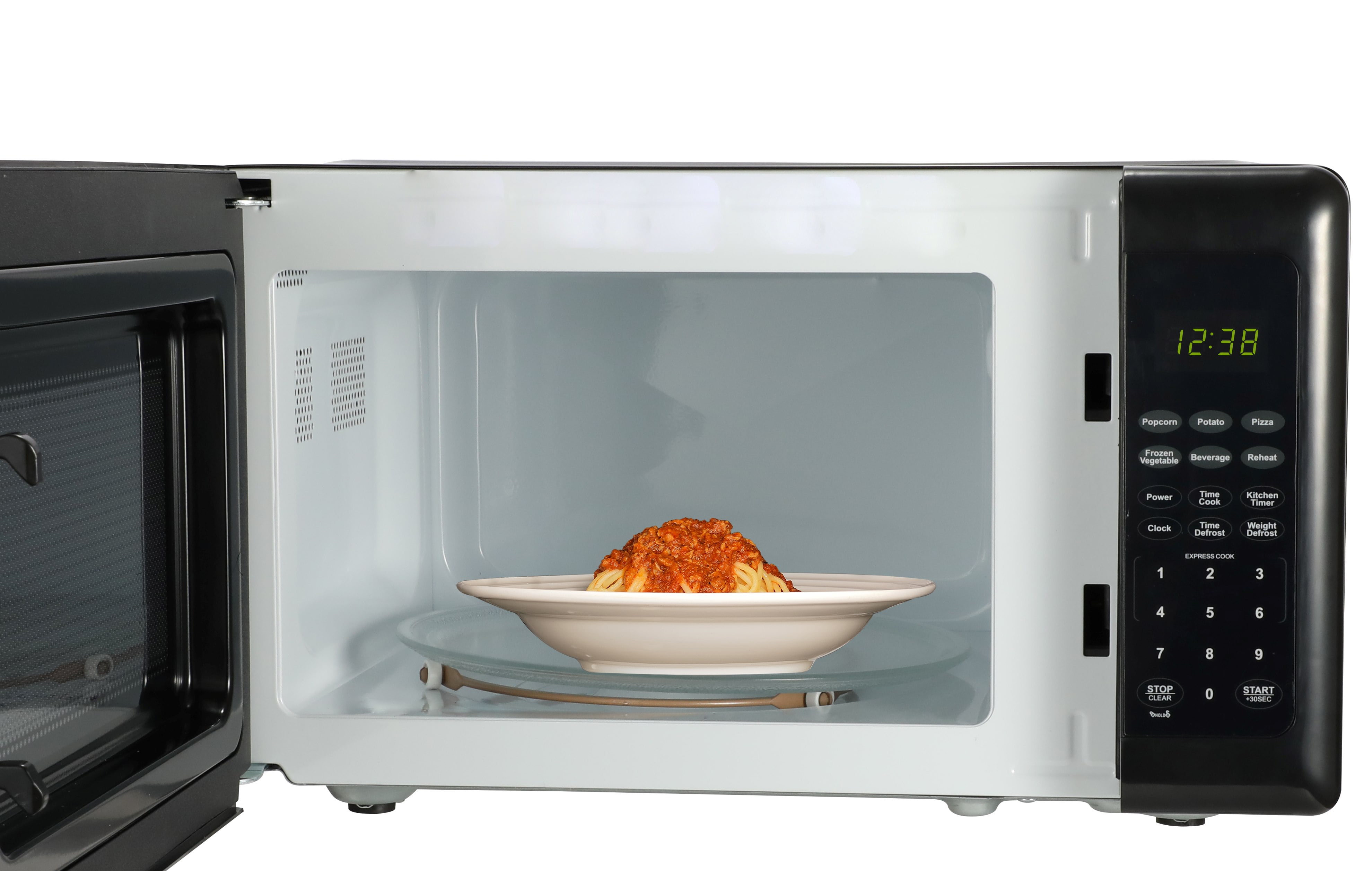 Microwave Output Power: 700 Watts 0.7 Cu Ft of Cooking Space Black Front & Cabinet 10 Power Levels Time and Weight Defrost Express Cooking 99-Minutes, 99-Second Digital Timer Kitchen Timer Function 6 Pre-programmed Recipes (Popcorn, Potato, Pizza, Frozen Vegetable, Beverage, Reheat) LED display, Digital clock Removable Glass Turntable for Complete, Even Cooking Child-Safe Lock-Out feature End-of-Cooking Signal 17.8”W x 13.2”D x 10.2”H Net Weight/ Gross Weight: 21.8 lb/ 24.3 lb