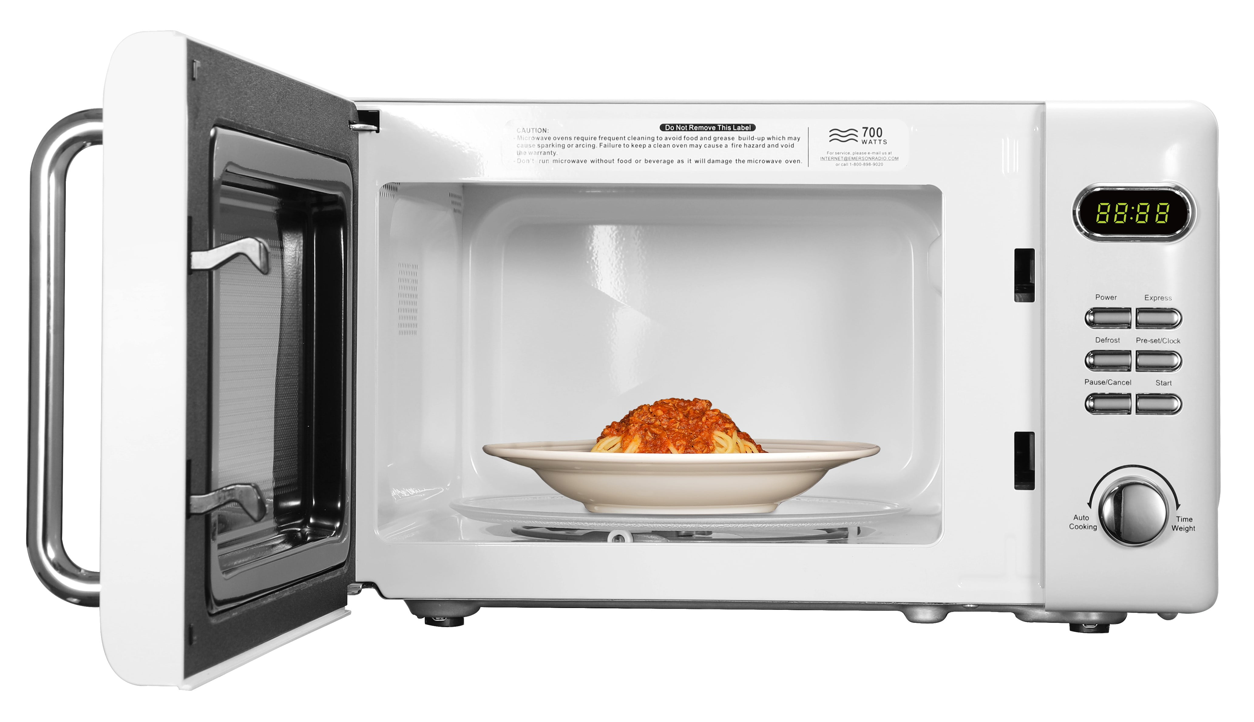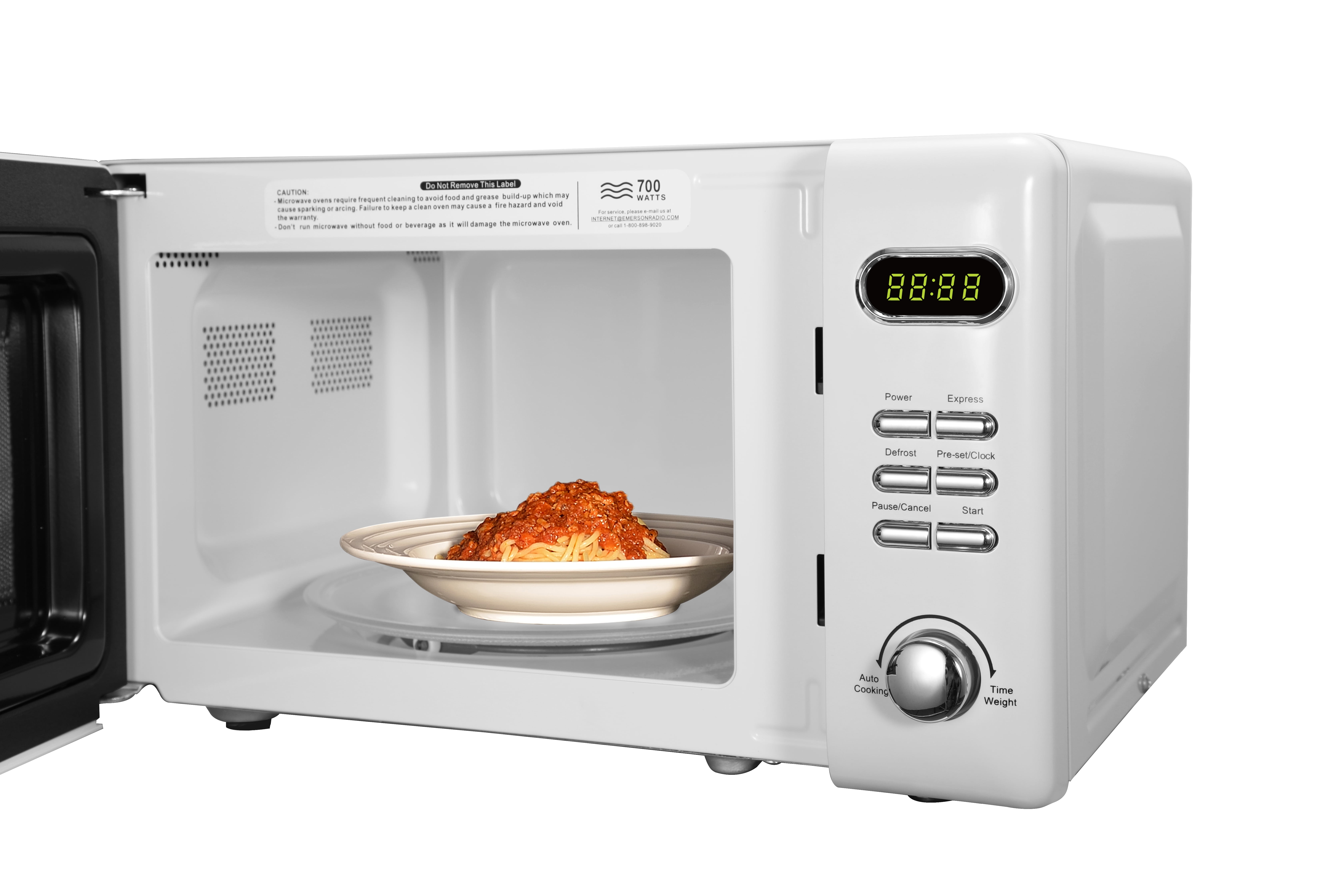Microwave Output Power: 700 Watts 0.7 Cubic Feet of Cooking Space Stylish Retro White design Chromed Handle and Control Button for easy operation 5 Power Levels for versatile cooking options Pre-programmed Settings for Popcorn, Reheat, Beverage, Pizza, Potato, Vegetable, Meat, and Fish Express and Defrost functions for quick meal preparation 60-minute cooking timer for precise cooking LED Display with Digital Clock for easy readability