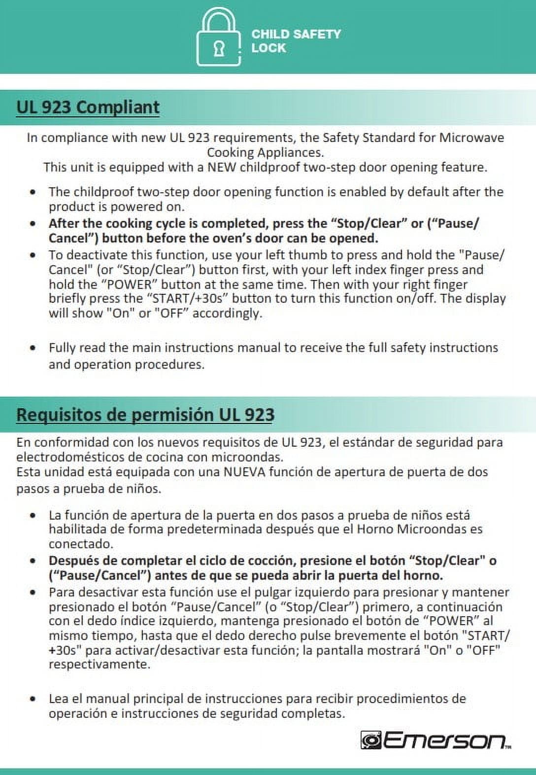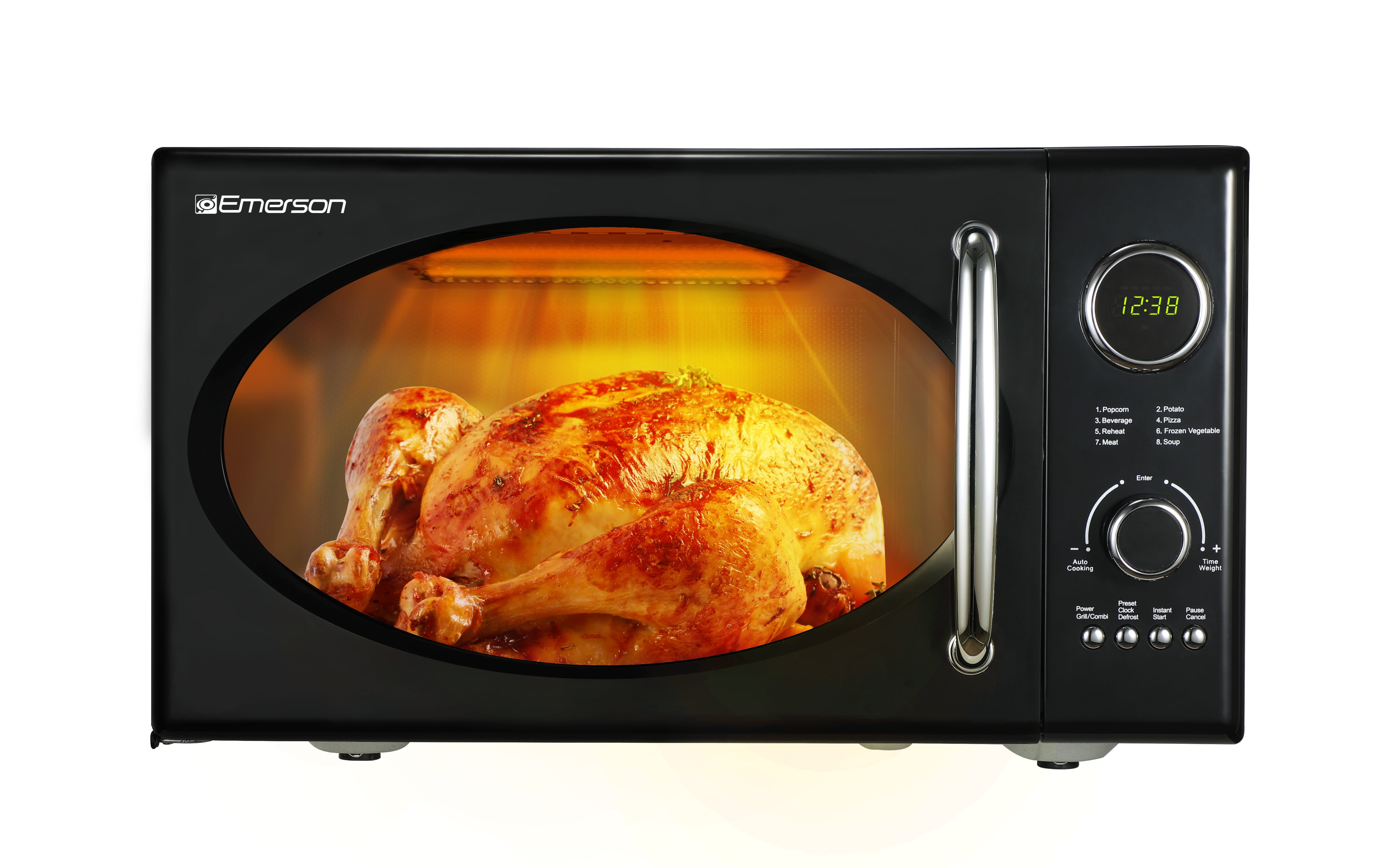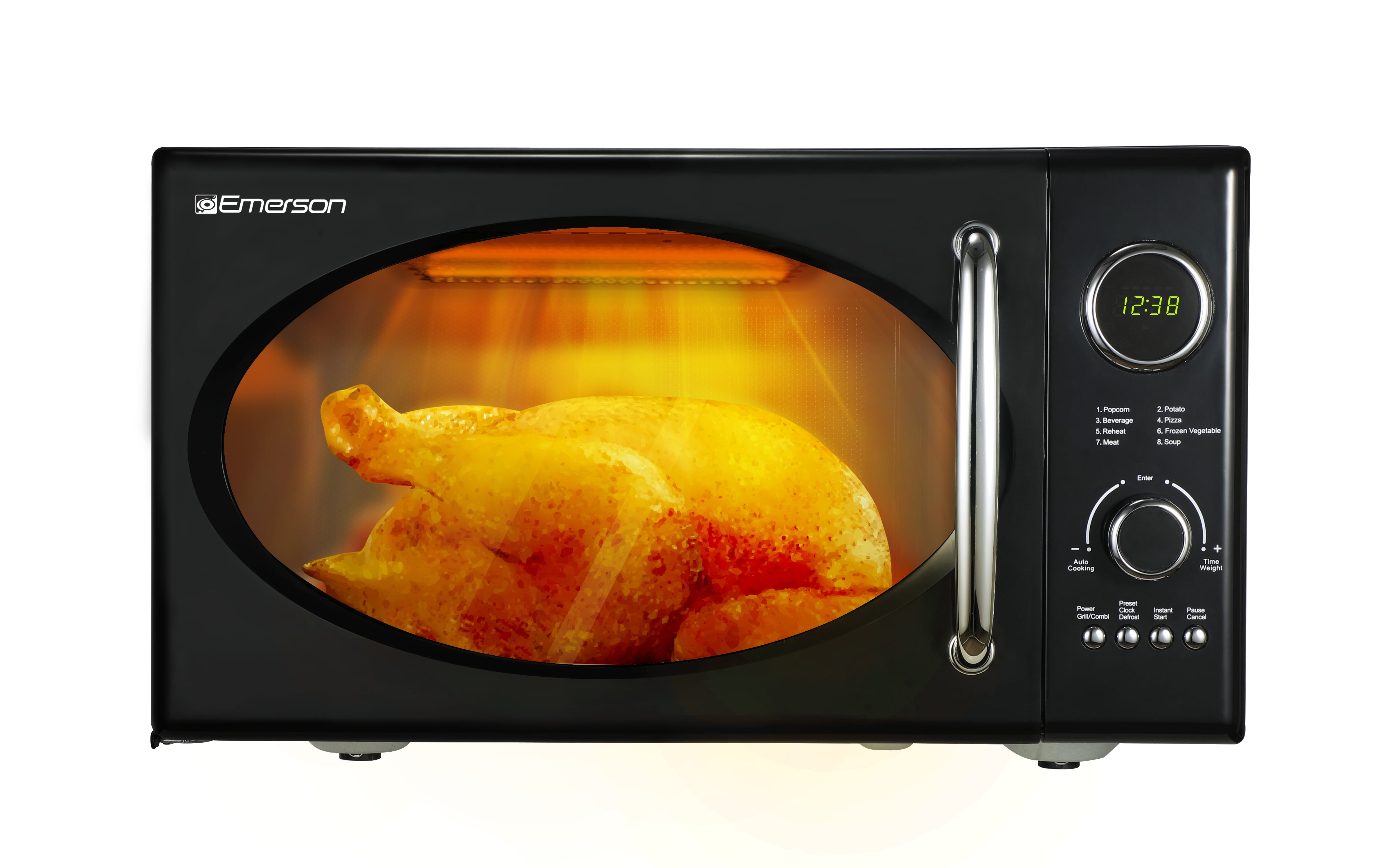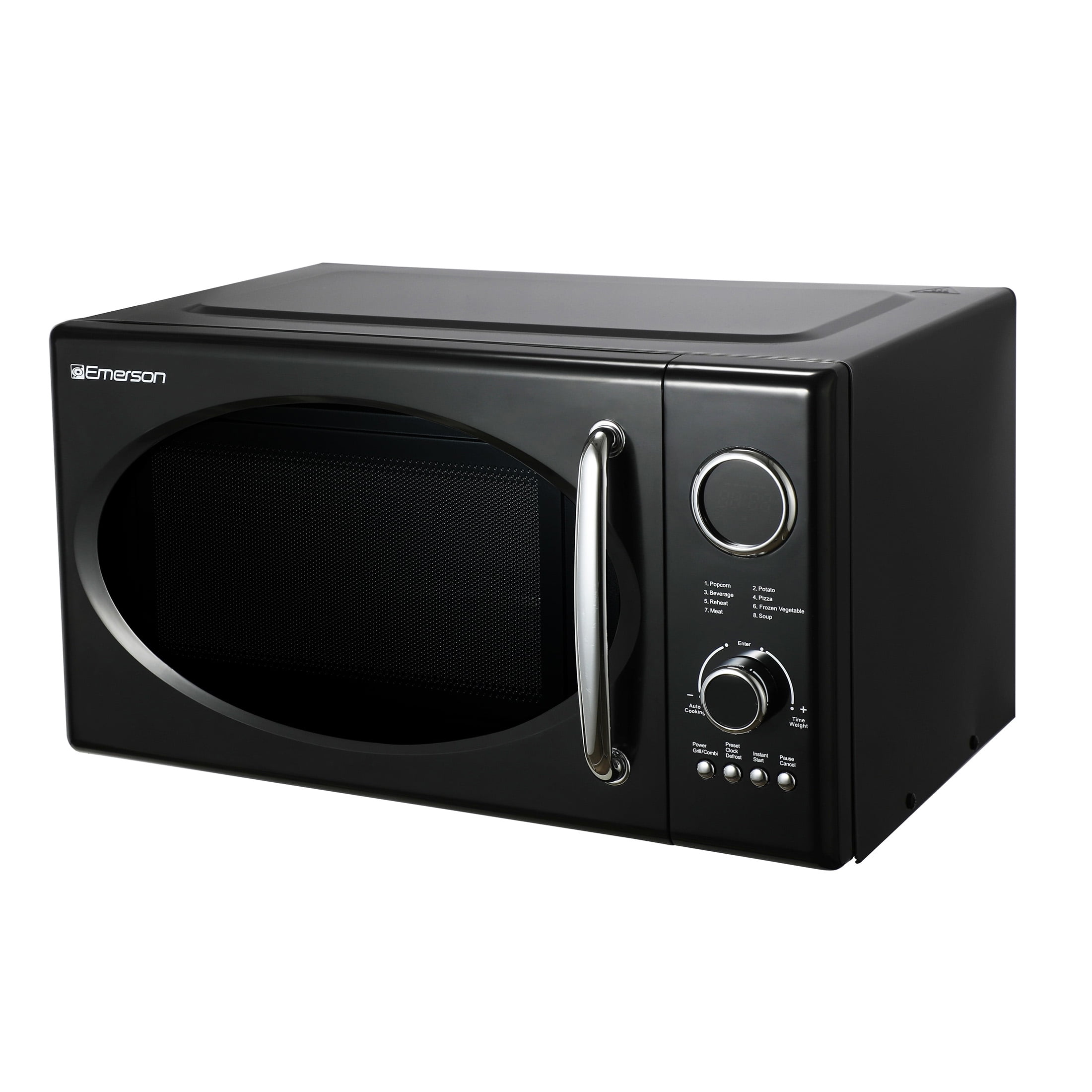 Emerson Radio 0.9 cu ft Countertop Microwave Ovens in Black Powerful Cooking: 800W microwave and 1000W grill with 0 9 cu ft of space for versatile cooking Retro Design: Features a black retro design with chromed handle and control buttons for a stylish look Multiple Options: Offers 5 power levels, 8 pre-programmed settings, and time/weight defrost functions for convenience User-Friendly: Equipped with an LED display, digital clock, removable glass turntable, and a 99-minute timer Safety Features: Includes a child-safe lock-out feature and an end-of-cooking signal for added security and convenience