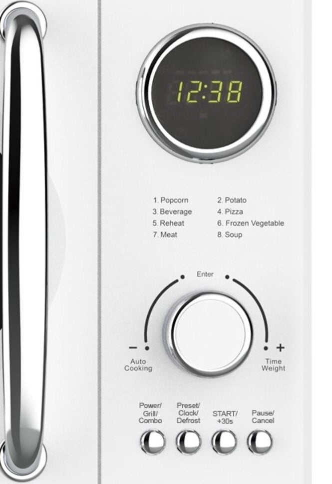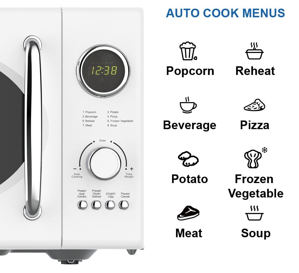 Microwave Output Power: 800 Watts Grill Output Power: 1000 Watts 0.9 Cubic Feet of Cooking Space Retro White Design Front and Cabinet Chromed Handle and Control Buttons 5 Power Levels 8 Pre-programmed Settings (Popcorn, Potato, Beverage, Pizza, Reheat, Frozen Vegetable, Meat, Soup) Time and Weight Defrost 99-Minutes, 99-Second Digital Timer LED Display, Digital Clock Removable Glass Turntable Child-Safe Lock-Out Feature End-of-Cooking Signal