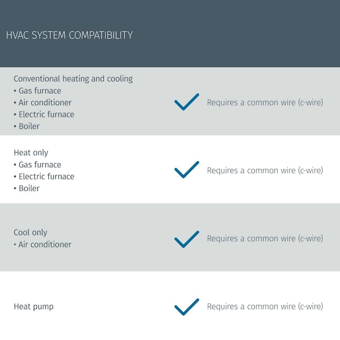 - Compatibility requires C-wire: extensive compatibility with HVAC equipment found in most homes – all system types require a common wire (C-wire); check compatibility on our website