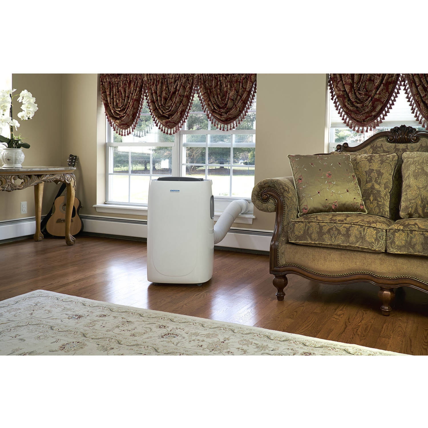 Emerson Quiet Kool 3 inch 1 Portable Air Conditioner, Dehumidifier & Fan with Remote Control, for Rooms up to 350-Square Feet EAPC10RD1: Quiet Cooling For Medium Rooms: This 10,000 BTU (ASHRAE)/6,100 BTU (DOE) portable air conditioner efficiently cools and heats up to 350 sq. ft. At 50dB, this unit is among the quietest in the industry, making it ideal for bedrooms and other medium-sized rooms. Included window kit and hose fit windows from 26.6 to 50.7 inches in width. Buckets Design: The auto-evaporation system efficiently removes water created by the natural dehumidification process, allowing for a bucket less design that doesn’t routinely need draining (except on the most humid days of the year). Flexible Functionality: Three modes (fan, cool, dry, and heat) give you ultimate flexibility for year-round use. Three fan speeds give you control over your comfort. Powerful dehumidification (up to 3.2 pints per hour) dries your space quickly. Programmable Timber And Sleep Mode: Integrated 24-hour timer can be set via onboard controls or remote control. Intelligent sleep mode takes it one step further by slowly adjusting the temperature and fan speed to keep you comfortable overnight while saving you energy and money. For cooling a room up to 350 sq. ft. 10000 BTU ASHRAE/6000 BTU DOE 2 Auto-evaporation technology and single-hose exhaust system for hassle-free spot cooling A 24-hour timer allows you to preset the time to turn on or off the machine Flexible options include Cool, Dry, and Fan modes Dehumidification up to 3.2 pints per hour Sleep function adjusts temperature for overnight comfort Digital display and variable electronic temperature control from 62°F to 86°F Choice of 3 fan speeds (low, medium, and high) to achieve and maintain your comfort level Remote control for convenient operation from anywhere in the room During a power outage, Auto-Restart resumes operating at its previous settings when power is restored An easy-to-access filter reduces bacteria, room odors, and other airborne particles for a healthier, more comfortable environment 4 caster wheels easily roll the unit from place to place, plus side handles for easy lifting and carrying 5.9-ft. long LCDI power cord with NEMA 5-15 plug uses standard 115V electrical outlet Includes for quick and easy setup in double-hung or sliding windows Window Dimensions Height (minimum): 7.2 inches Window Dimensions Width (min/max): 26.6 – 50.7 inches U.L. listed