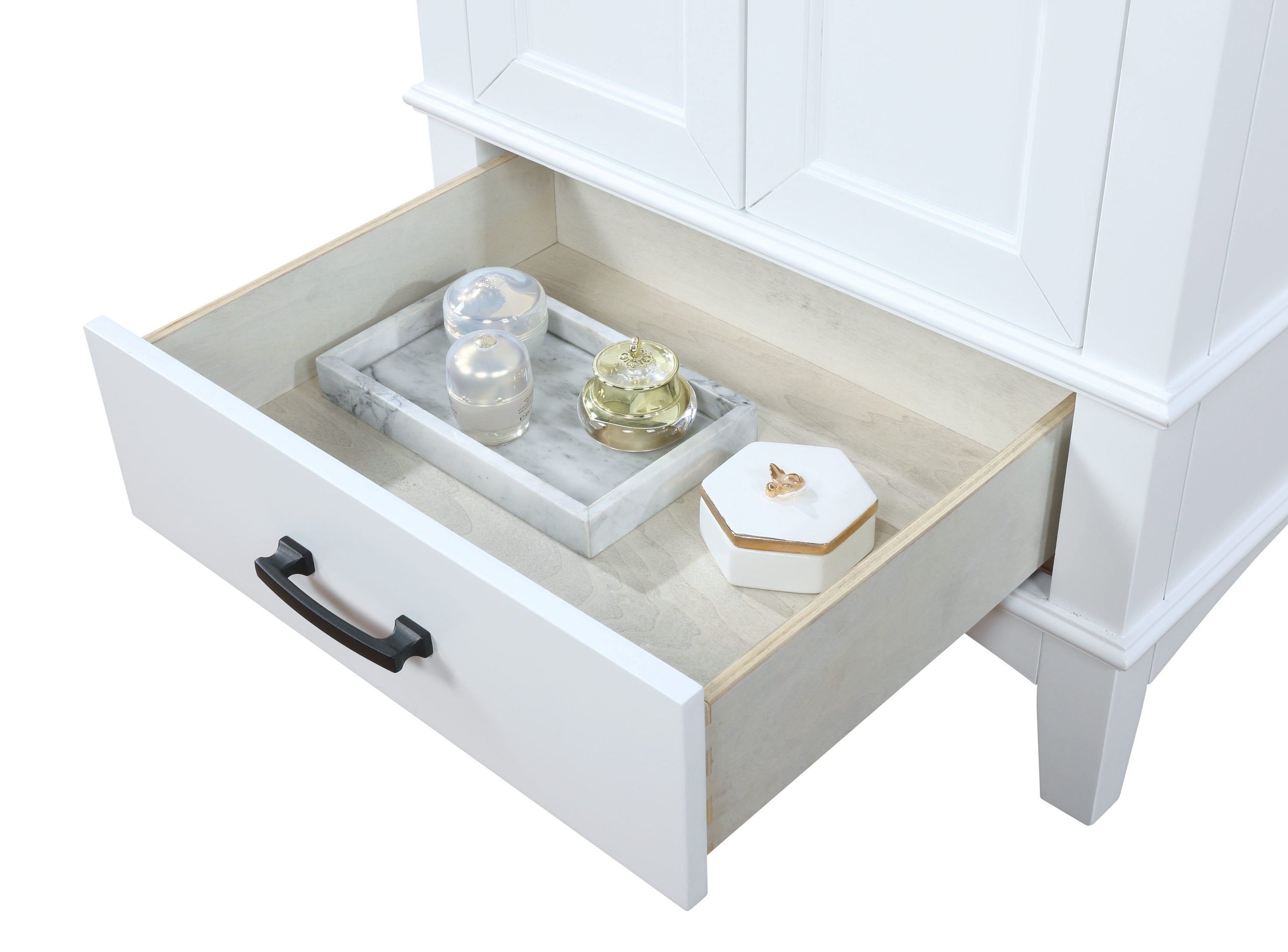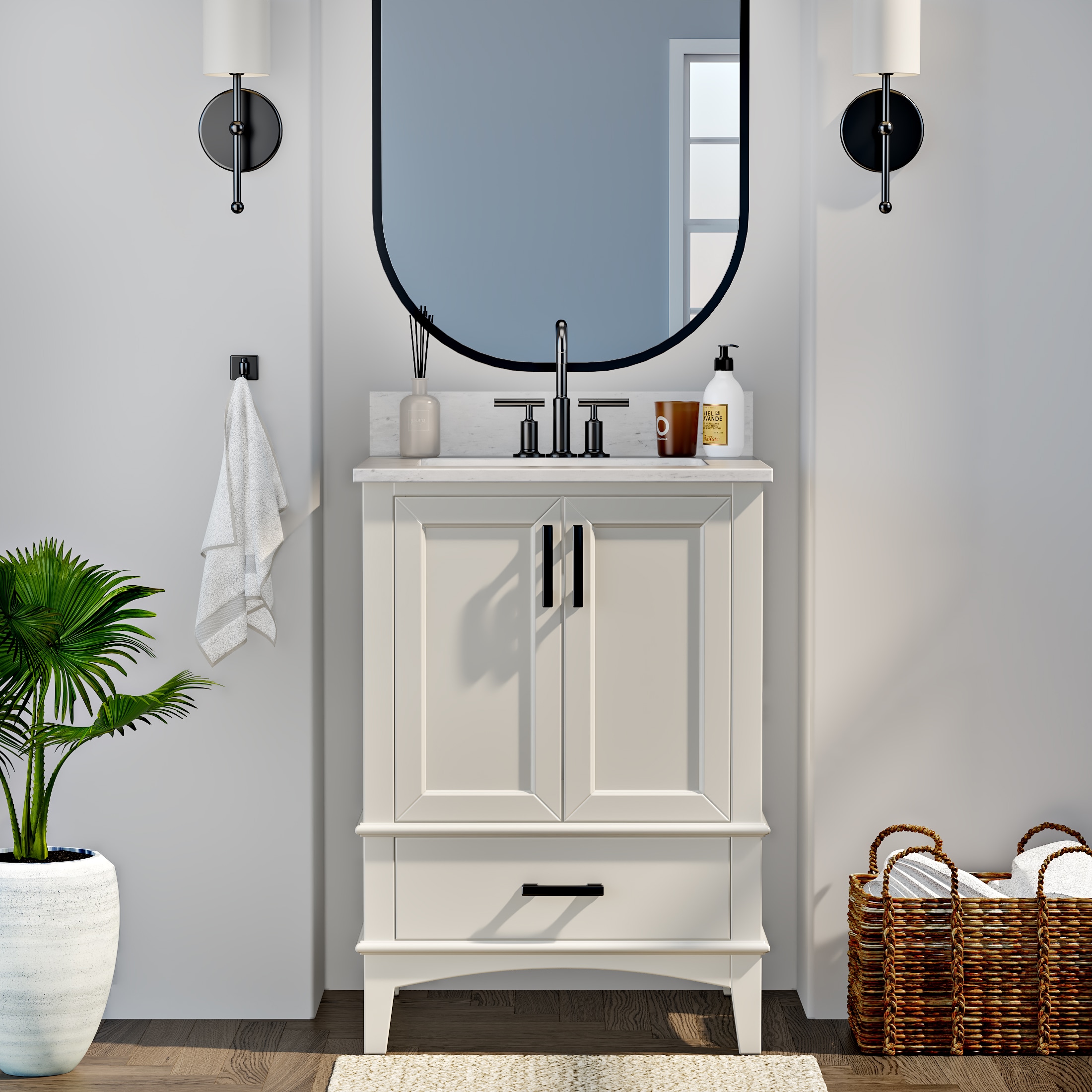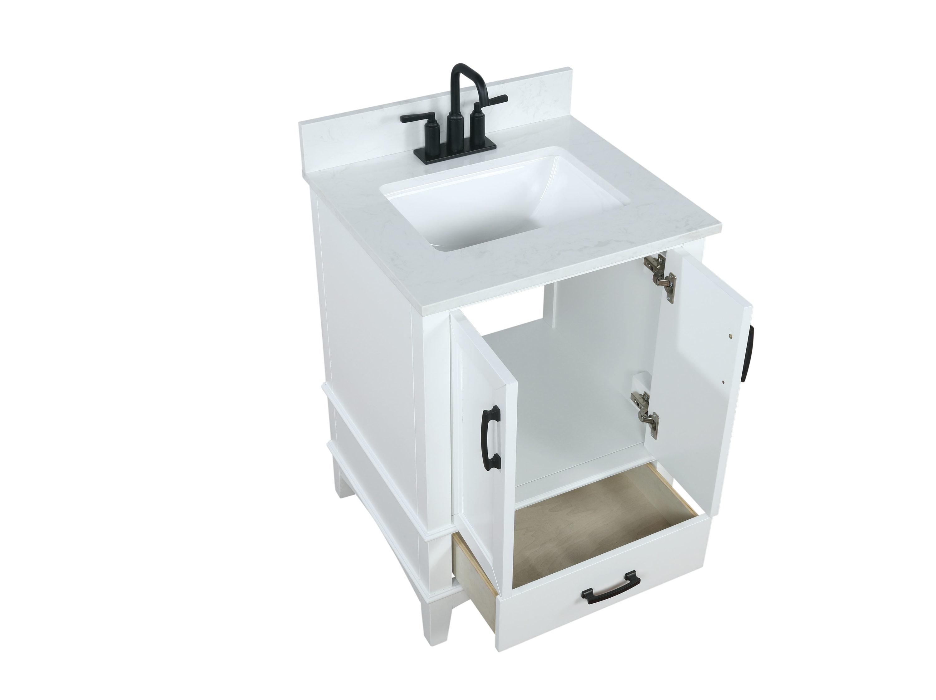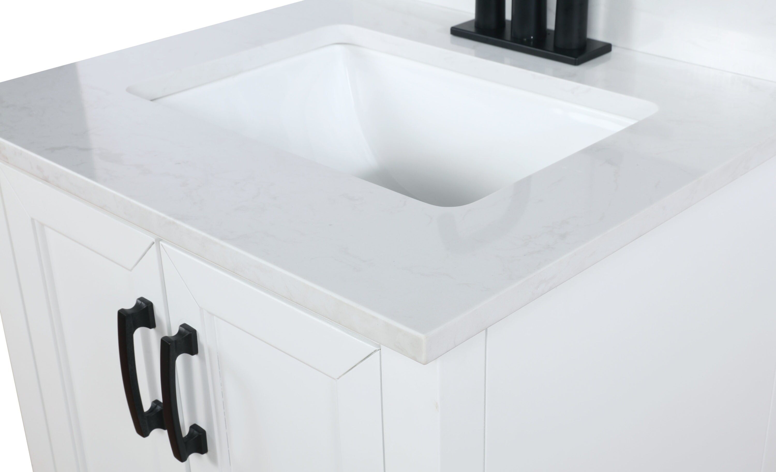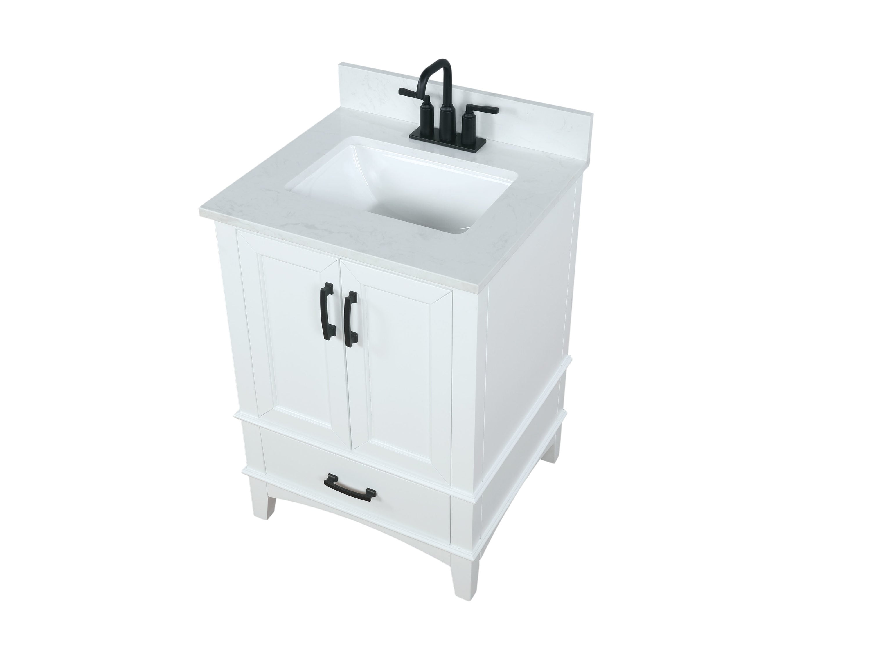 Contemporary elegance defines the Emily bath vanity collection by Runfine and its practical design offers a style with ample functional hidden storage.The modern cabinet design is complemented with a beautiful Carrara White cultured marble top with backsplash included.Recessed slow close doors and drawers finished off with tapered feet connected with a low rise arc apron complement the modern design with solid matte black hardware.The perfect vanity for any bathroom in your home if you are looking to add a level of modern sophistication and gain the additional storage you’ve always needed.The Emily bath vanity is available in multiple sizes.