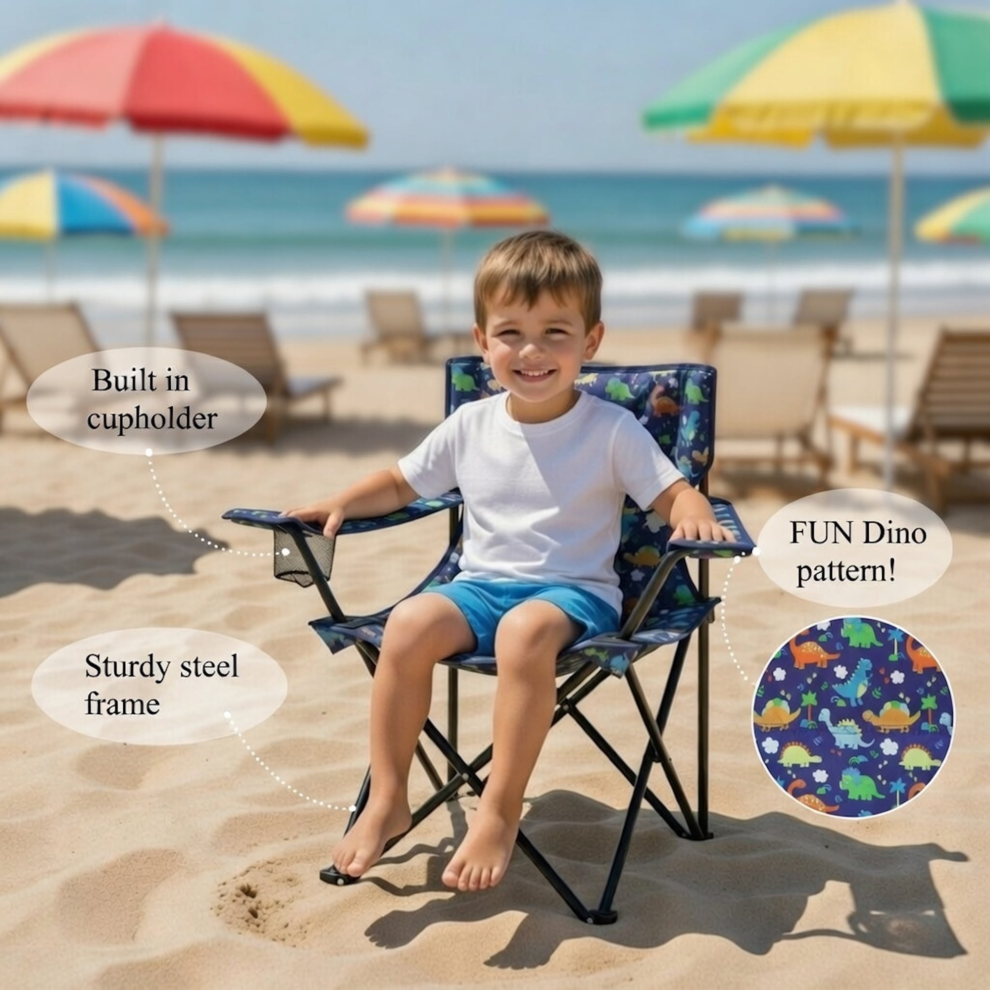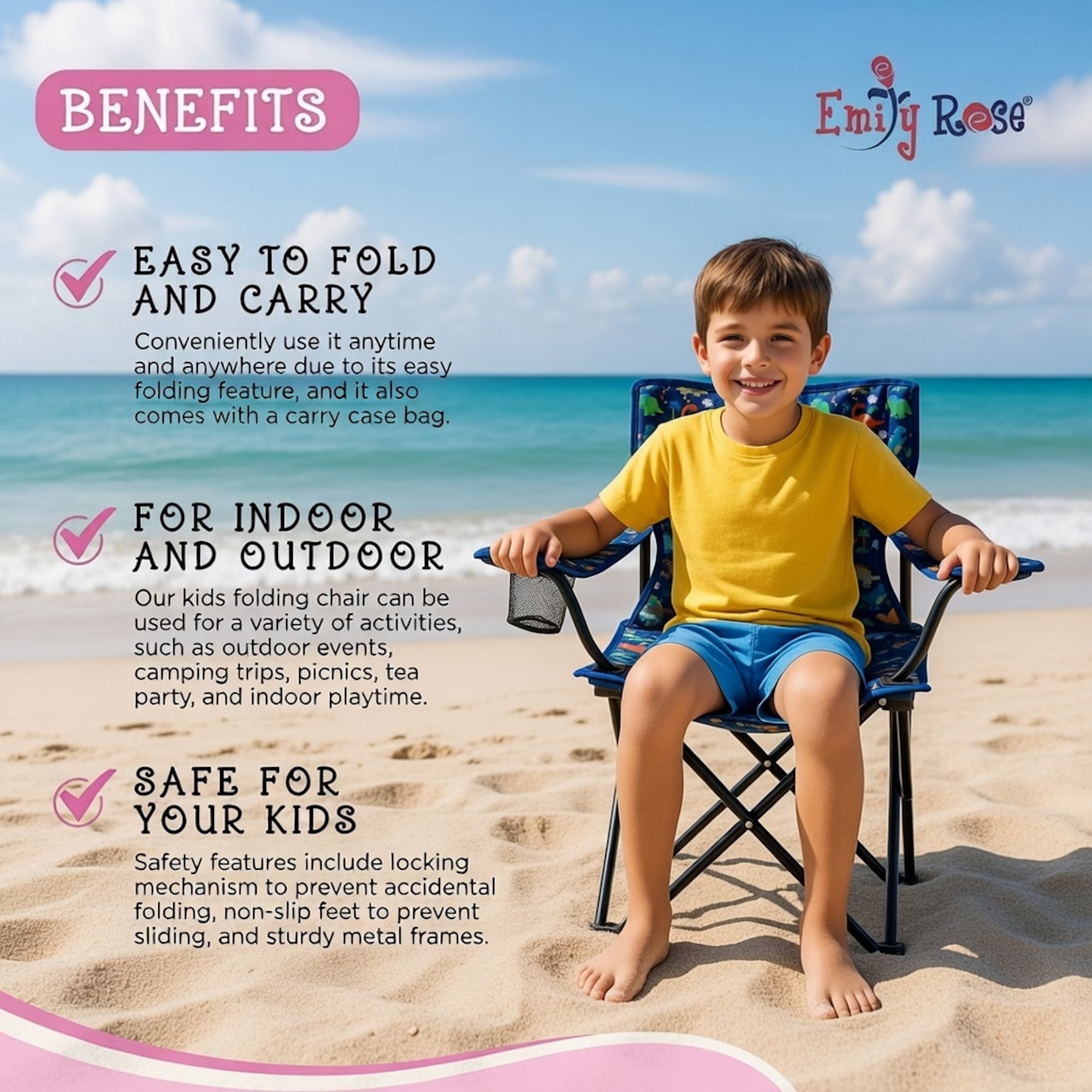 Unmatched Comfort: Designed for kids ages 2-7, this chair provides unparalleled comfort for seaside adventures, offering the perfect spot to rest and play Versatile and Portable: Lightweight and easy to carry, this chair is perfect for beach outings, camping trips, or relaxing in the backyard. Features a mesh cup holder to keep your child hydrated Easy to Fold and Carry: Equipped with a release button for easy folding, this chair comes with a matching carry case bag with a handle for convenient transport Durable & Safe: Built with sturdy construction and a child safety lock, ensuring security during outdoor adventures. The vibrant blue playful dinosaur design adds excitement to camping or beach trips Safety Certified: All Emily Rose products have passed CPSIA and ASTM child safety testing, ensuring they are phthalate and lead-free for peace of mind