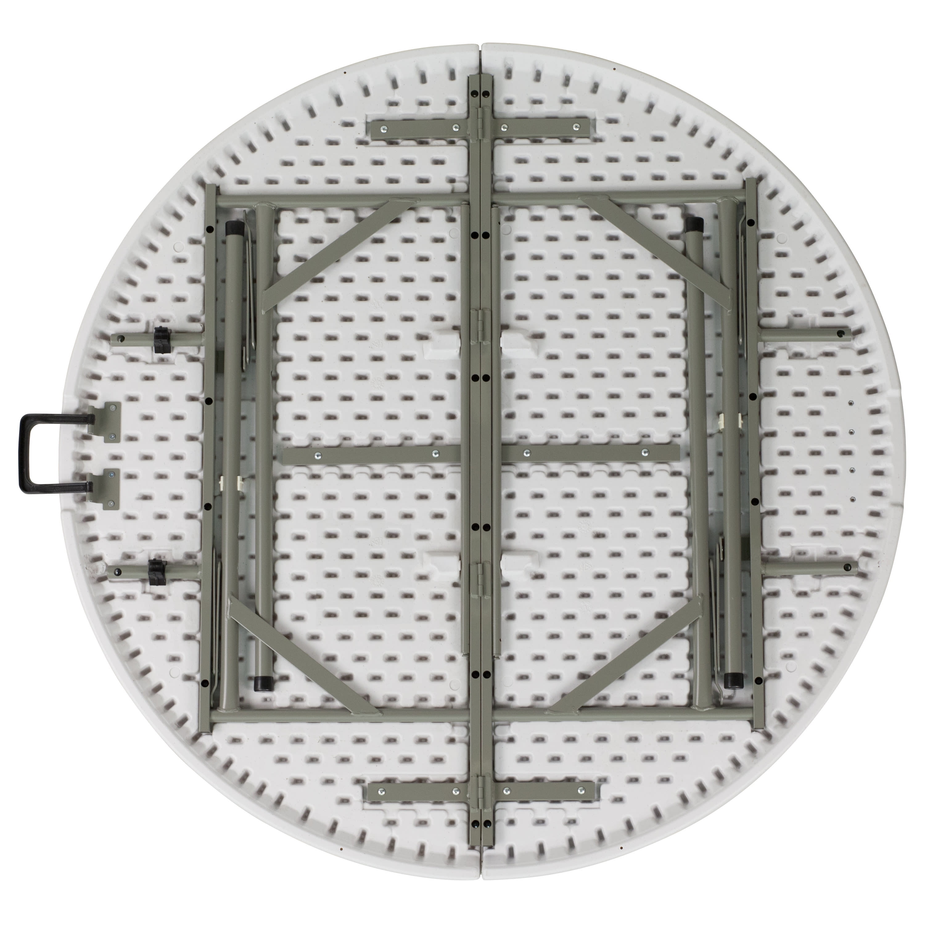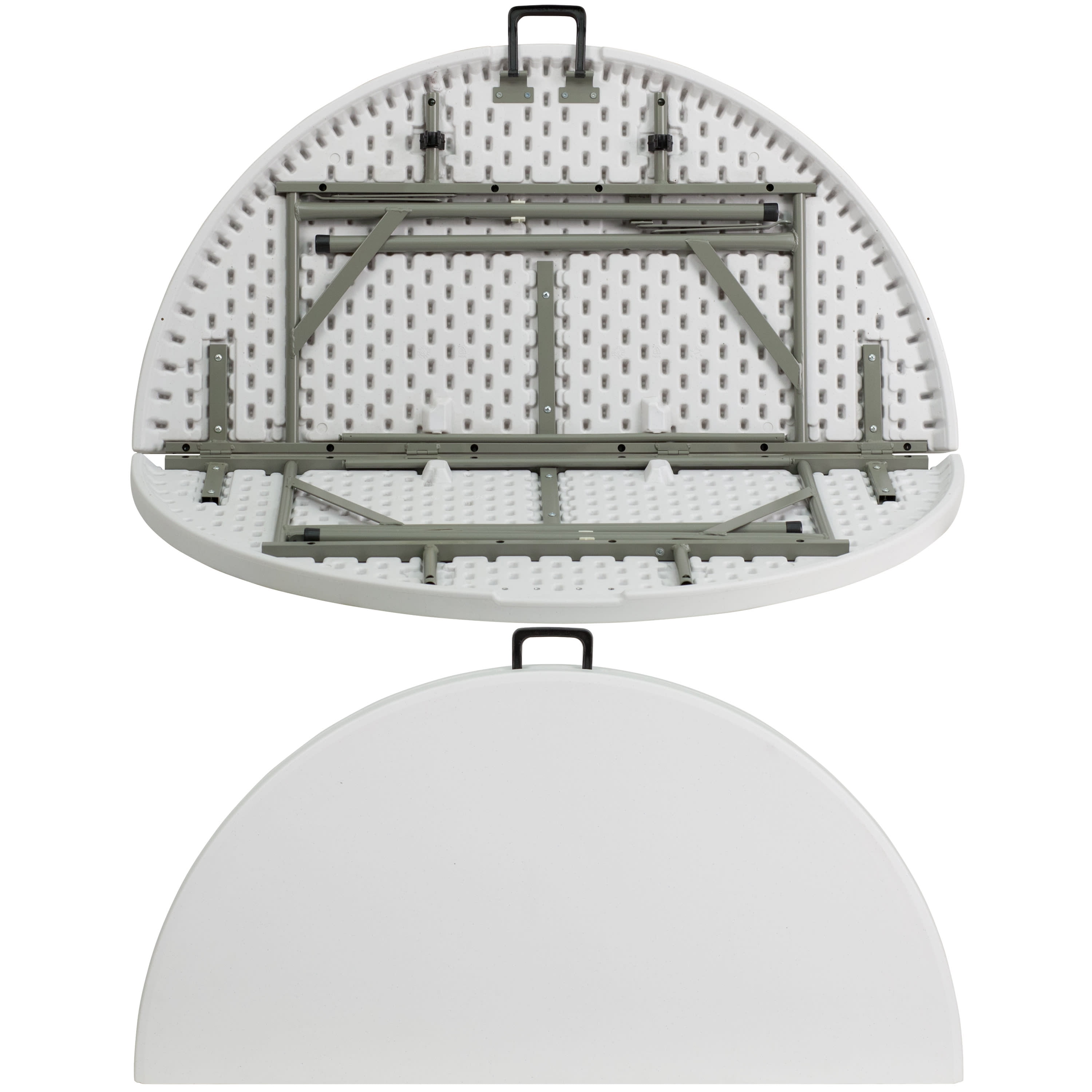 Emma + Oliver 4′ Round Plastic Event Folding Table with Carrying Handle, White Comfortably seats up to 4 people during any event Foldable design and carrying handle for easy transportation and compact storage Can be used as is or dressed up with a tablecloth to achieve a custom look Durable powder-coated legs with protective non-marring floor caps Waterproof and impact and stain-resistant tabletop No assembly required; clean with a solvent and water-based cleaner as needed Overall size: 47.75″ W x 47.75″ D x 29.5″ H; Supports 440 lbs. static weight PRODUCT MEASUREMENTS: Overall Size: 47.75″W x 47.75″D x 29.5″H; Folded Size: 19″W x 4.5″D x 41″H
