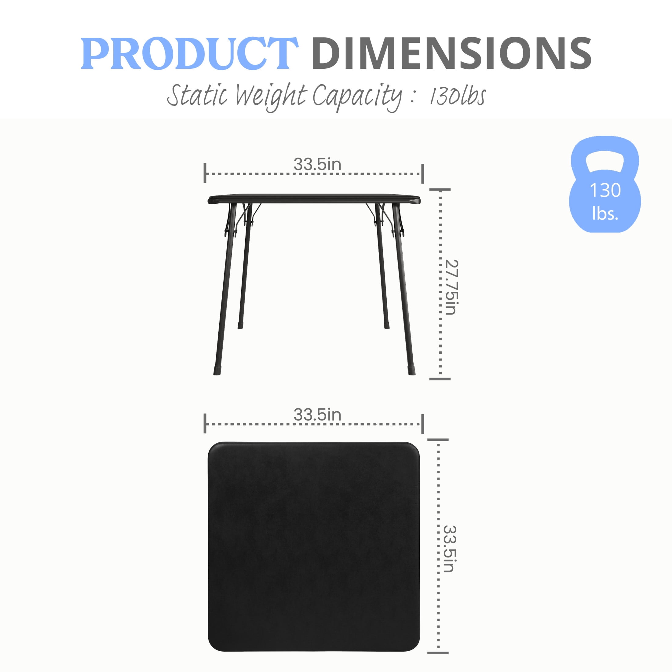 Emma + Oliver Vinyl-Covered Padded Folding Card Table for Game Rooms, Black Great for card or board games, weddings, arts and crafts, and more Vinyl-covered padded tabletop prevents cards from sliding off the table Legs fold underneath the tabletop for easy portability and storage Non-marring floor glides protect floor surfaces from damage 0.1875″ thick gray vinyl top with CAL 117 fire retardant sponge foam Supports up to 130 lbs. of evenly distributed static weight Overall size: 33.5″ W x 33.5″ D x 27.75″ H PRODUCT MEASUREMENTS: Overall Size: 33.5″W x 33.5″D x 27.75″H