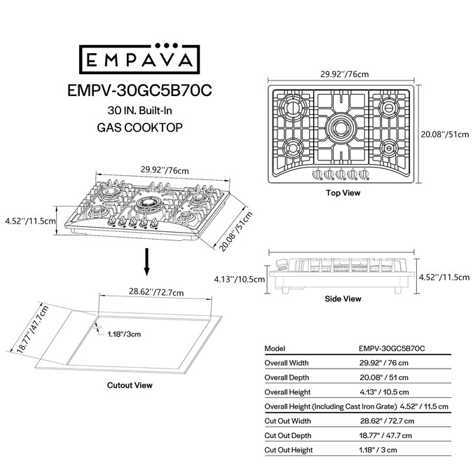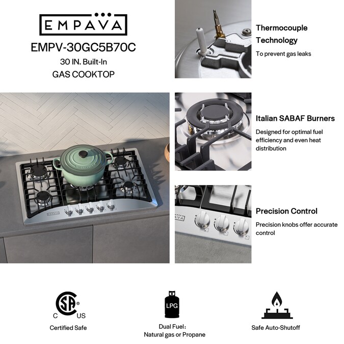 The Empava 30-inch gas cooktops with the CSA certified is a perfect combination of style and practicality. Constructed with 18-gauge stainless steel for exceptional resistance to corrosion and rust. Handcrafted brushed satin finish to prevent dents and scratches for long lasting use in your busy kitchen. The gas cooktops feature commercial-grade components (1x 12000-BTU burner, 1x 10200-BTU burner, 2x 6000-BTU burners and 1x 3400-BTU burner), the power burner designed to reach maximum temperatures quickly as well as a simmer burner for more delicate, controlled heat. The metal constructed knobs and the heavy-duty cast iron grates can be cleaned in the dishwasher. During the past years, 30-inch gas cooktops by Empava appliances have been a very popular choice for kitchen upgrades and new builds, allowing you to cook restaurant quality meals from the comfort of your own home.