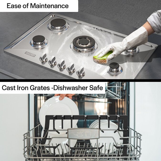- Continuous, edge-to-edge grates are dishwasher safe for easier clean-up, let you move heavy pots and pans across the cooktop without lifting