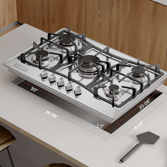 The Empava 30-inch gas cooktops with the CSA certified is a perfect combination of style and practicality. Constructed with 18-gauge stainless steel for exceptional resistance to corrosion and rust. Handcrafted brushed satin finish to prevent dents and scratches for long lasting use in your busy kitchen. The gas cooktops feature commercial-grade components (1x 13000-BTU burner, 1x 10200-BTU burner, 2x 6000-BTU burners and 1x 3400-BTU burner), the power burner designed to reach maximum temperatures quickly as well as a simmer burner for more delicate, controlled heat. The metal constructed knobs and the heavy-duty cast iron grates can be cleaned in the dishwasher. During the past years, 30-inch gas cooktops by Empava appliances have been a very popular choice for kitchen upgrades and new builds, allowing you to cook restaurant quality meals from the comfort of your own home.