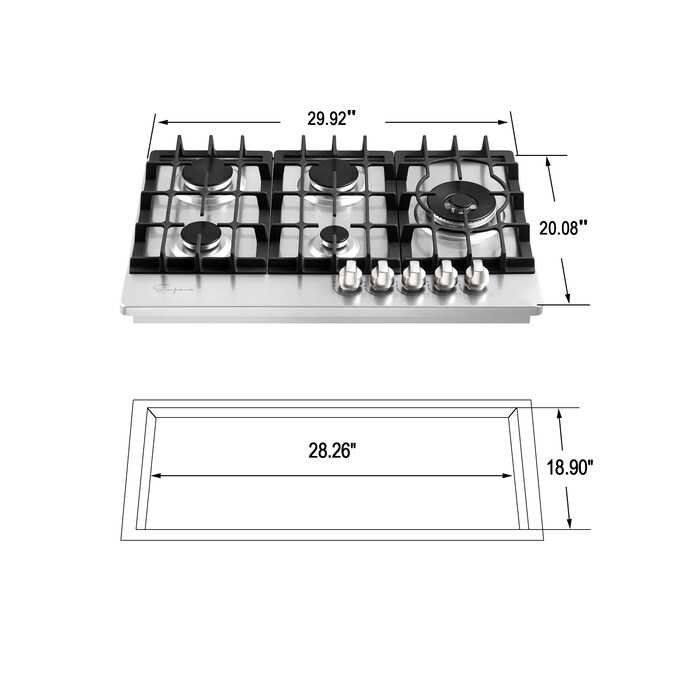 The Empava 30-inch gas cooktops with the CSA certified is a perfect combination of style and practicality. Constructed with 18-gauge stainless steel for exceptional resistance to corrosion and rust. Handcrafted brushed satin finish to prevent dents and scratches for long lasting use in your busy kitchen. The gas cooktops feature commercial-grade components (1x 18,000-BTUs, 2x 12,000-BTUs, 1x 9,500-BTUs and 1x 6,000-BTUs, total 57,500-BTUs), the power burner designed to reach maximum temperatures quickly as well as a simmer burner for more delicate, controlled heat. The knobs and the heavy-duty cast iron grates can be cleaned in the dishwasher. During the past years, gas cooktops by Empava appliances have been a very popular choice for kitchen upgrades and new builds, allowing you to cook restaurant quality meals from the comfort of your own home.