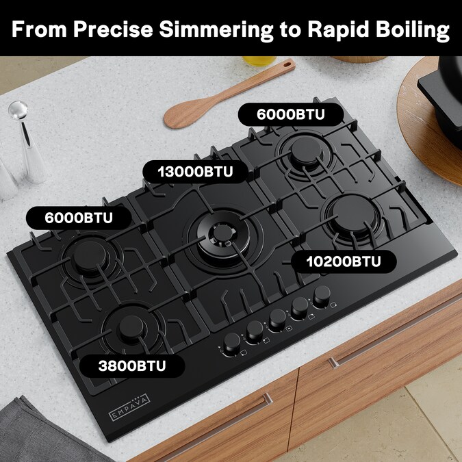 The Empava 36-inch gas cooktops with the CSA certified is a perfect combination of style and practicality. Constructed with tempered glass to prevent dents and scratches for long lasting use in your busy kitchen. The gas cooktops feature commercial-grade components (1x 13000-BTU burner, 1x 10200-BTU burner, 2x 6000-BTU burners and 1x 3800-BTU burner), the power burner designed to reach maximum temperatures quickly as well as a simmer burner for more delicate, controlled heat. The metal constructed knobs and the heavy-duty cast iron grates can be cleaned in the dishwasher. During the past years, 36-inch gas cooktops by Empava appliances have been a very popular choice for kitchen upgrades and new builds, allowing you to cook restaurant quality meals from the comfort of your own home.