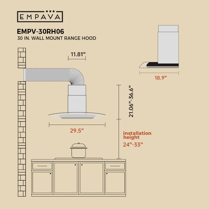 - Range hood dimensions: 29.5-inch W X 18.9-inch D X adjustable 21.06-inch – 36.6-inch H, aluminum flex duct dimension: 6-inch round, pre-installed US standard 120v power cord