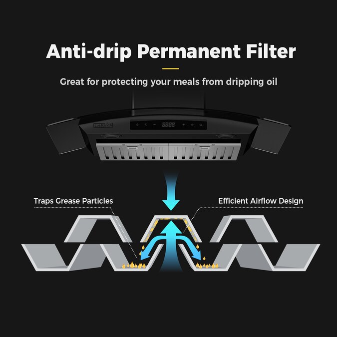The 30-in 400 CFM wall mount range hood with the USA and Canada ETL certified is a perfect combination of style and practicality. Constructed of high-quality stainless steel and clear tempered glass. The soft-touch controls and an LCD screen design creates a focal point with a distinctive modern look. The ultra-quiet motor do an incredible job at quickly remove smoke and other cooking odors from the air. Removable, reusable, dishwasher-safe stainless-steel filter for easy cleaning and maintenance. Two bright LEDs shine light on your stove top for better cooking visibility. During the past years, Empava range hoods have been a very popular choice for kitchen upgrades and new builds.