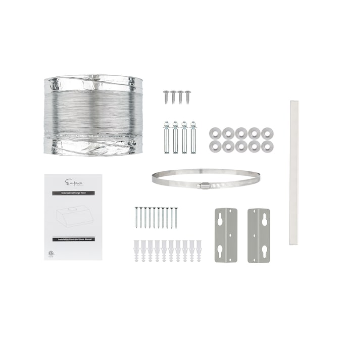 - Package Contents: Range hood, damper, baffle, duct, power cord, hardware, installation kit, bulbs, filters, 8″ damper