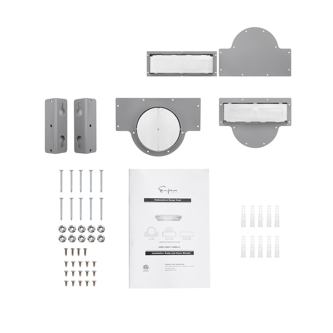 - Package Contents: Range hood, damper, baffle, power cord, hardware, installation kit, bulbs, filters, a Top Cover and 3 Adapters