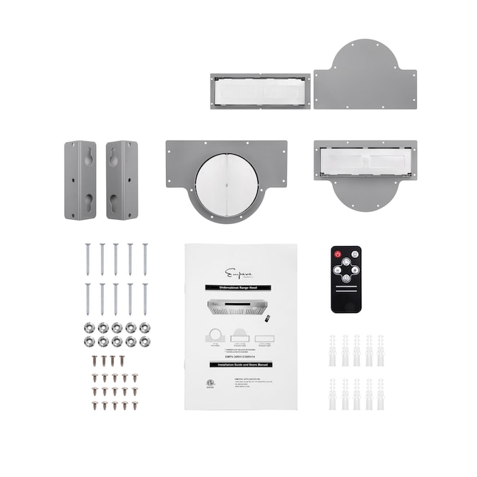 - Package Contents: Range hood, damper, baffle, power cord, hardware, installation kit, bulbs, filters, a Top Cover and 3 Adapters