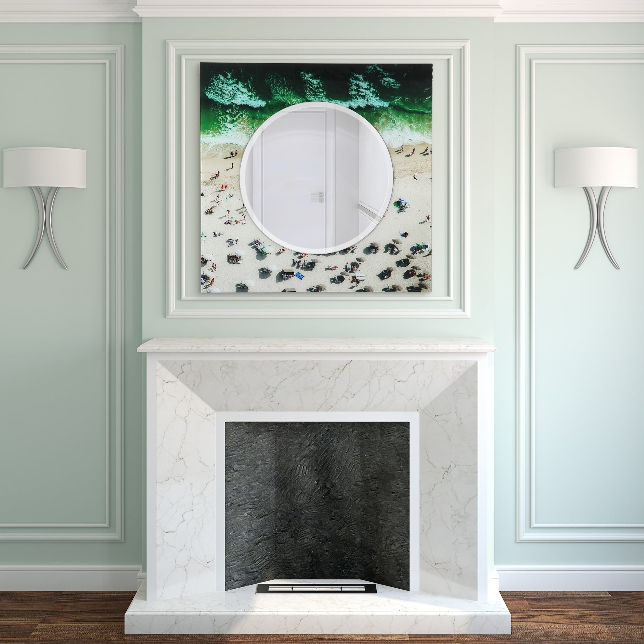 With the mirror projected forwards on a slight bevel, it seems to float above this beach image. The photography is very high detail and taken from a birds-eye view of a beach, from a rich green of the ocean to the warm white sands. There are many details to spy out in this interesting frame, which will suit any playful room or summer house. Whole Size: 36″ x 36″ x 0.4″ Middle Round Mirror Size: 24″ x 24″ x 0.4″