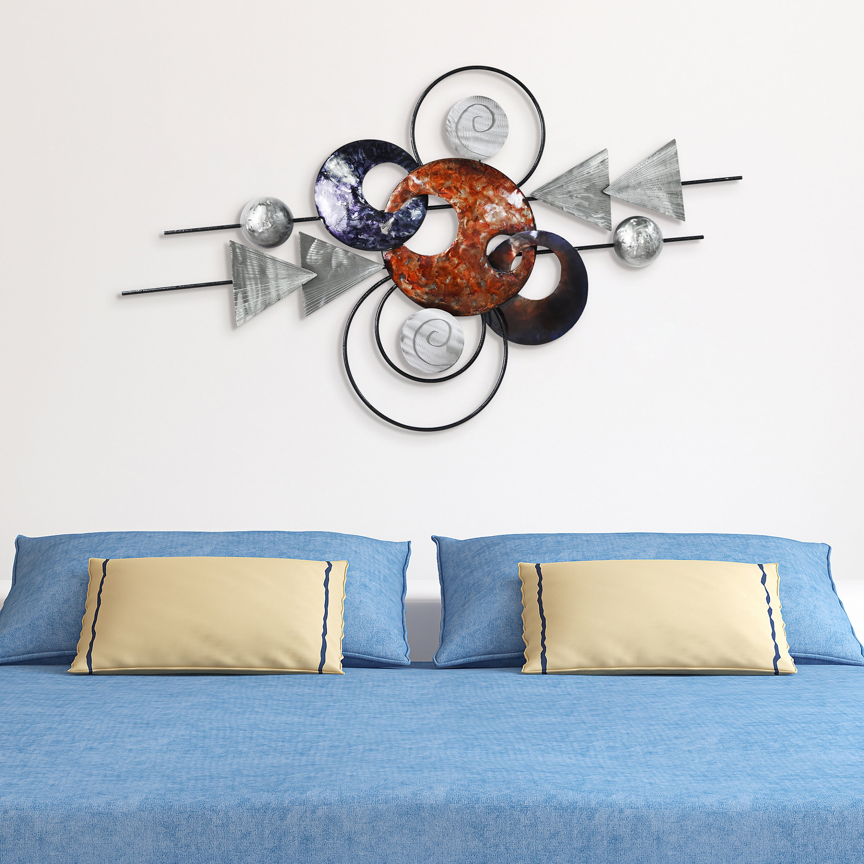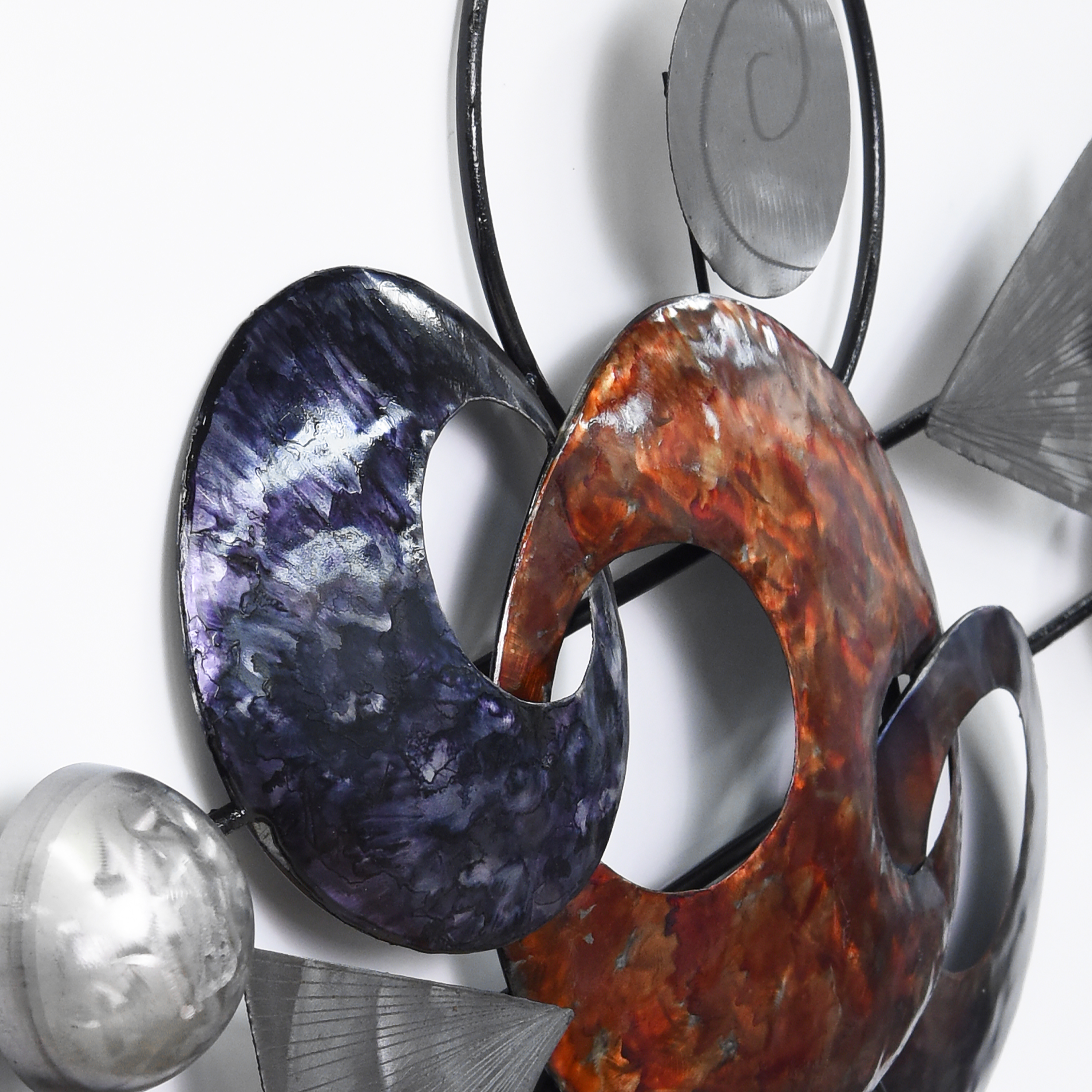 Made of geometric metal sheets with a hand-grinded finish, feature hand-painted and burned designs. O-rings are attached to the back for quick and easy installation either vertically or horizontally. Our high-quality packaging will protect your art from any possible damage or bending in transit.