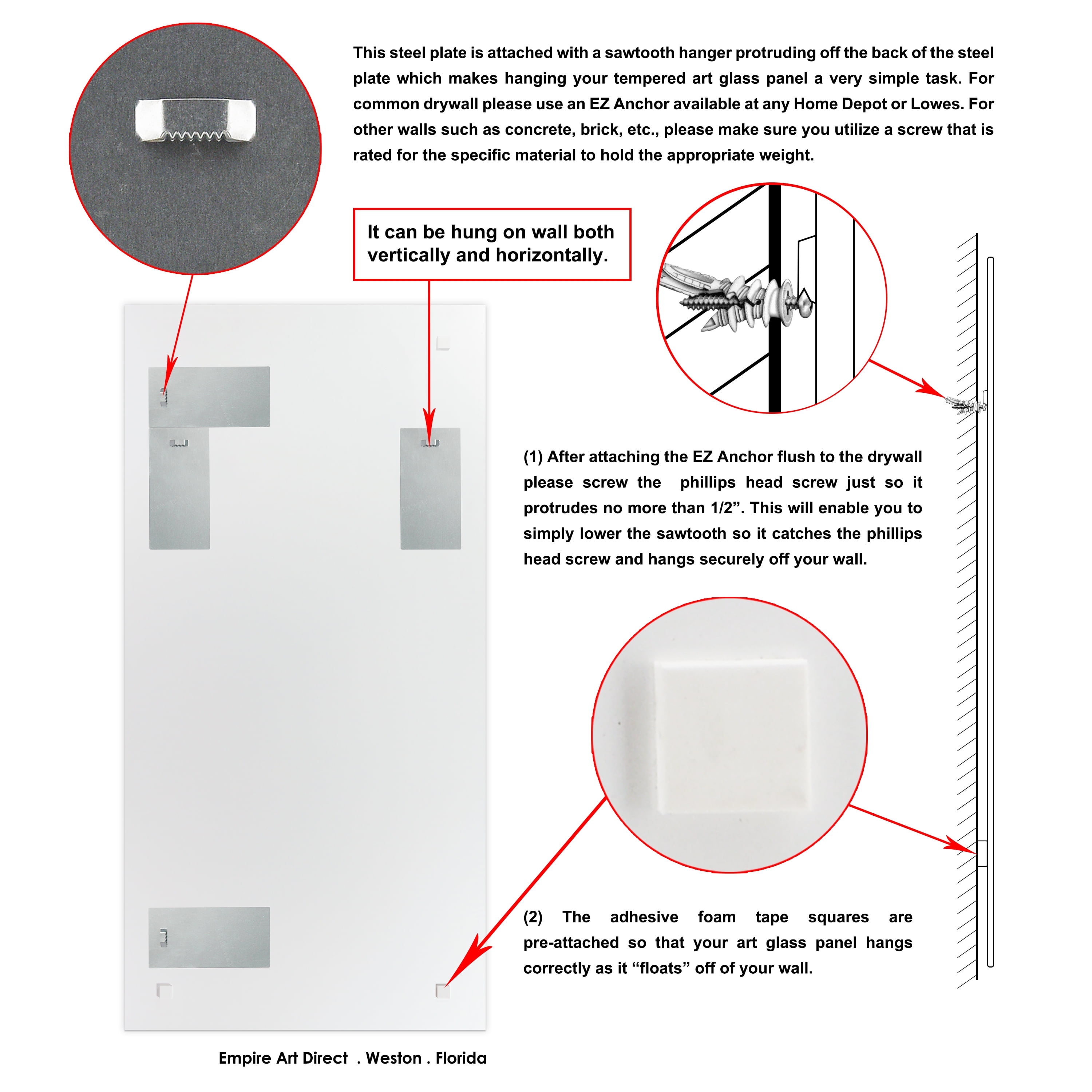 1. This frameless, free-floating, reverse printed, tempered art glass translates to incredible oversized leaner art that can also be hung on any wall vertically or horizontally. 2. Super high resolution HD printing is manufactured on the reverse side of the ultra white glass. 3. Featuring Crystallus™ ultra white tempered glass that is designed to enhance depth and colors unlike conventional commercial glass. 4. Comes pre-installed with heavyweight steel hangers that makes it simple to hang on the wall with just two EZ Anchors and a drill that are commonly available at Lowes,Home Depot, or your local hardware store. 5. Comes with 2 pre-installed steel hangers for vertical or horizontal installations.
