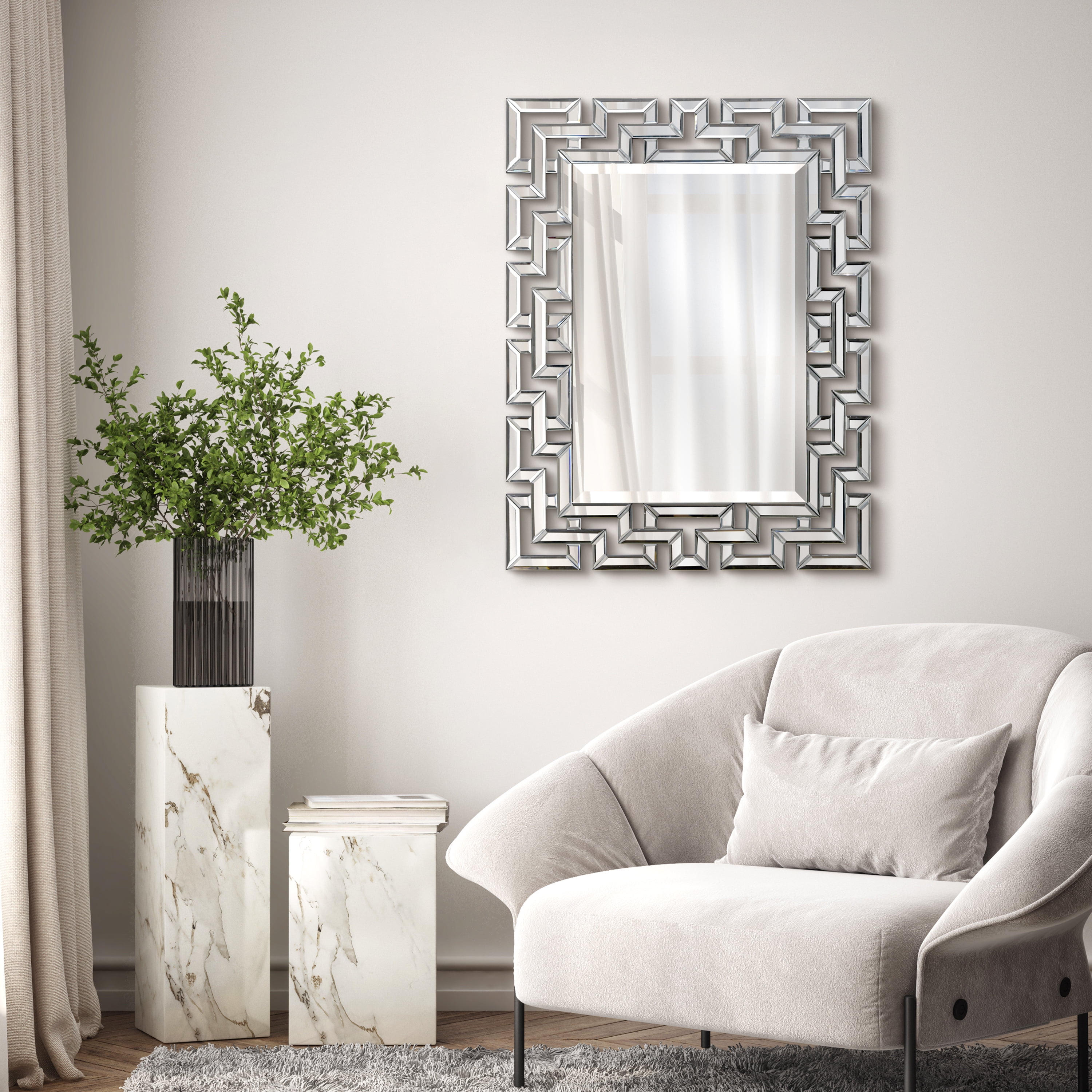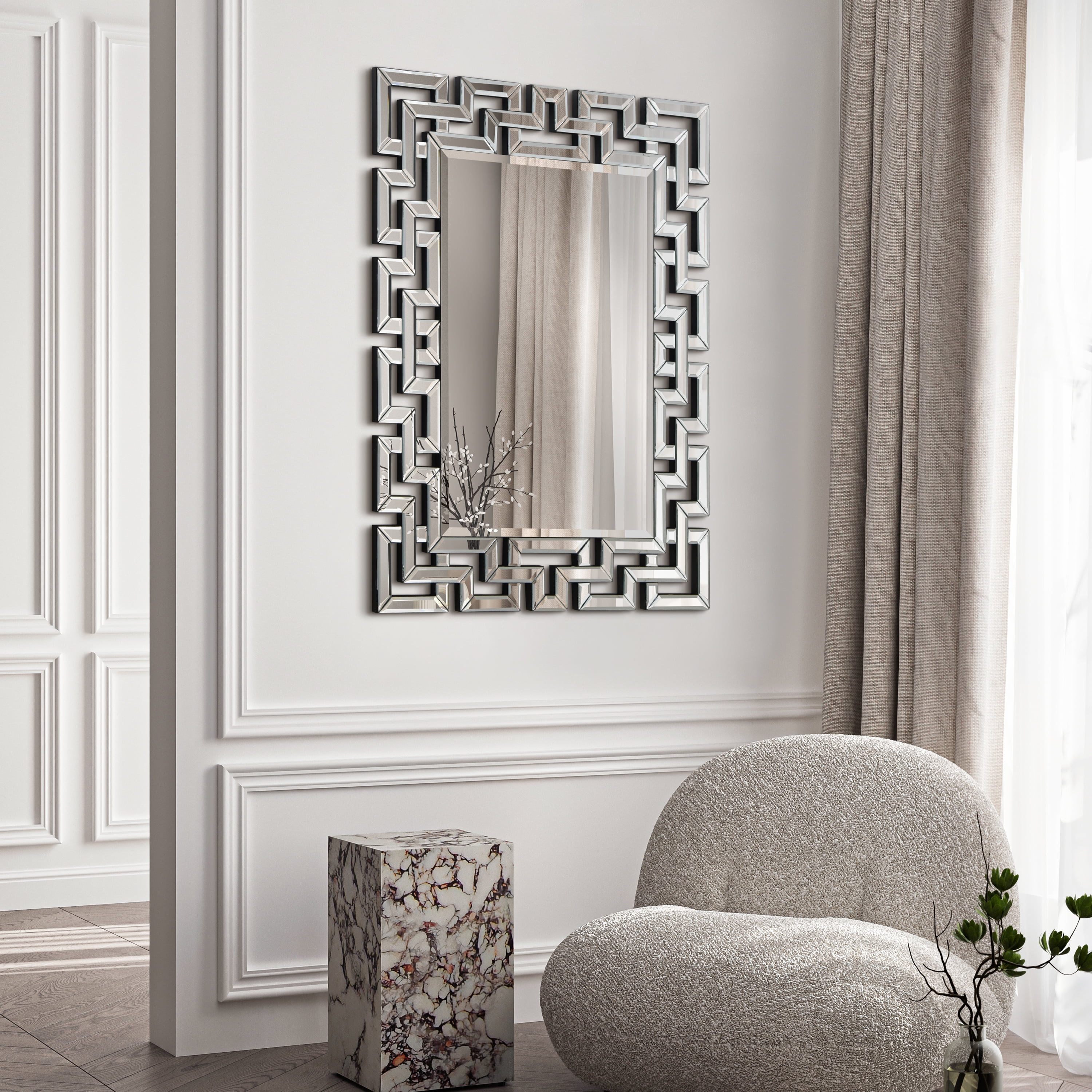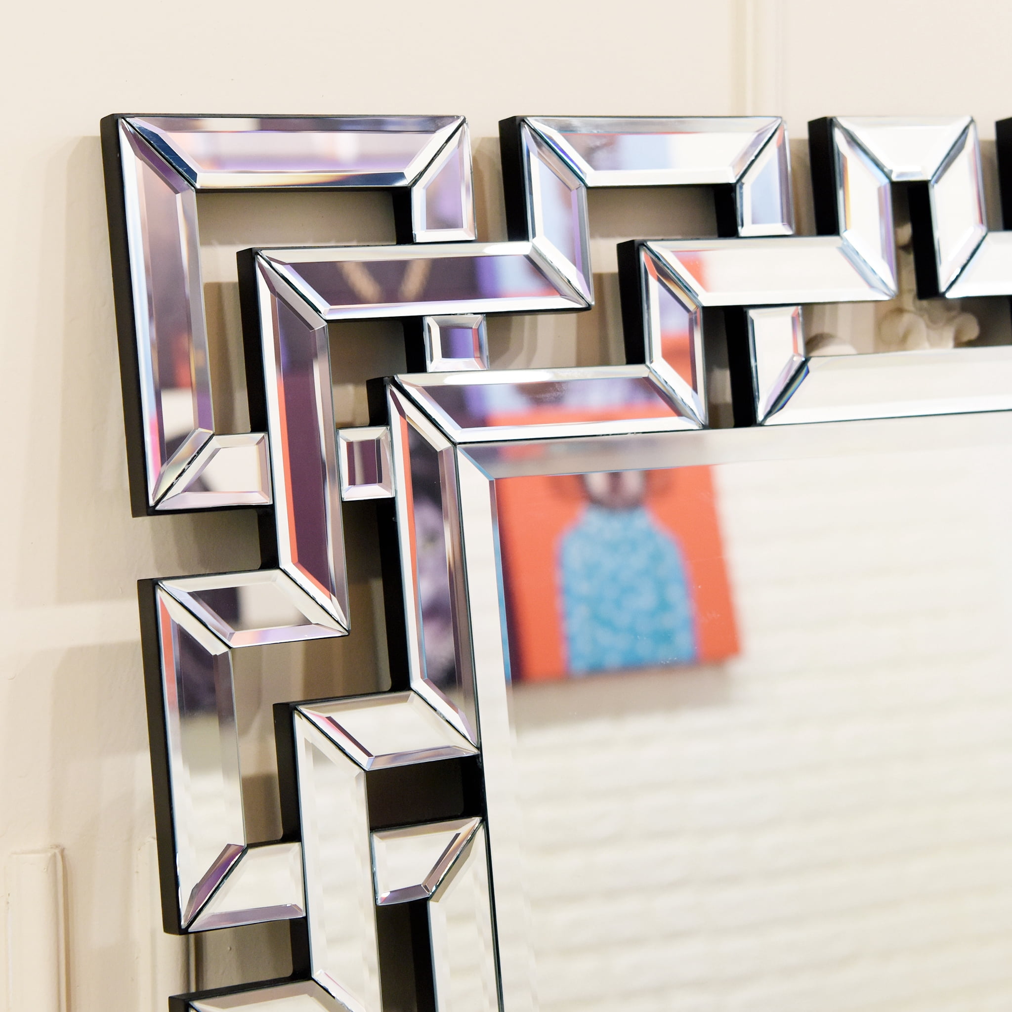 Network of interlocking mirrored squares Beveled glass on mirror Measures 31 inches wide x 40 inches high x 0.8 inches thick