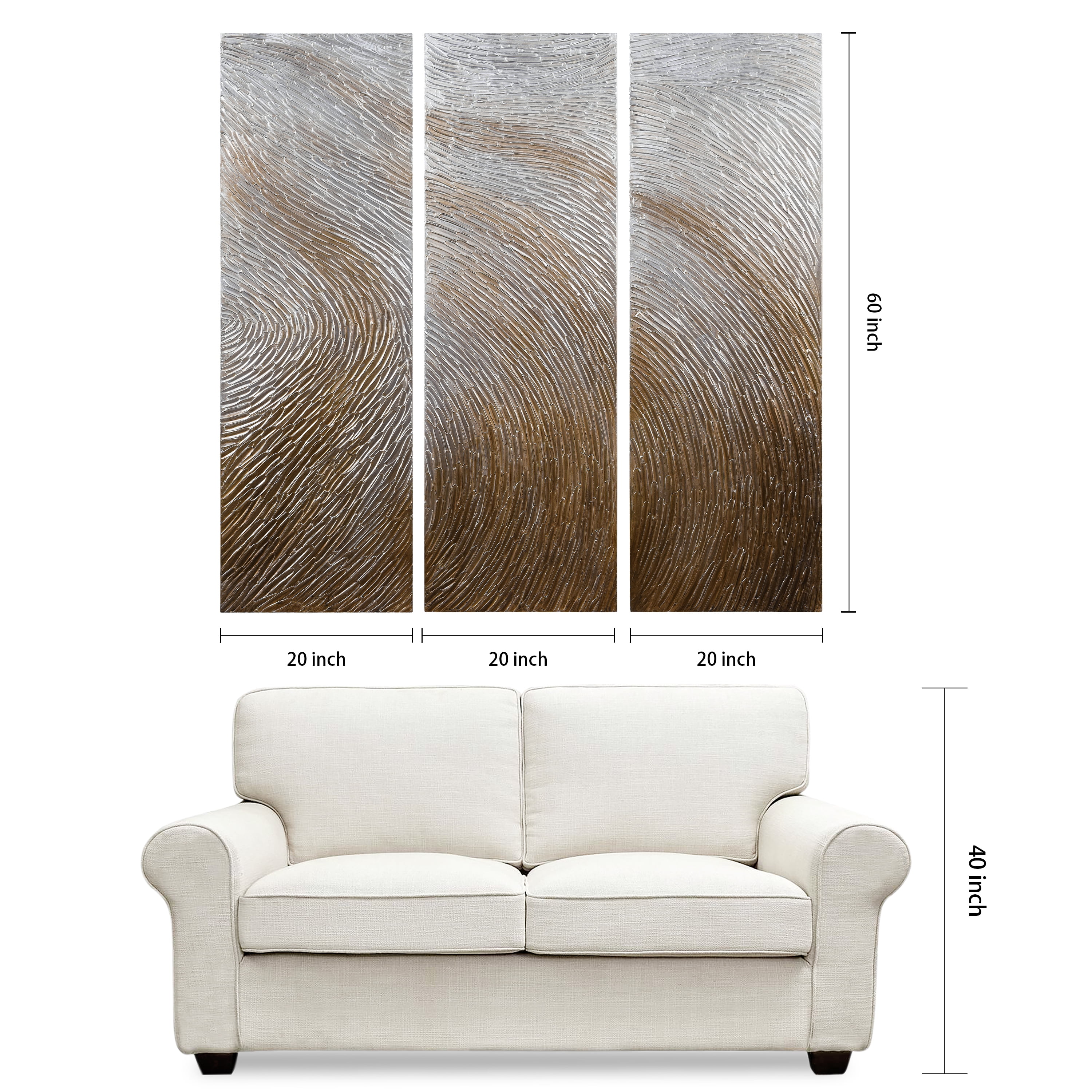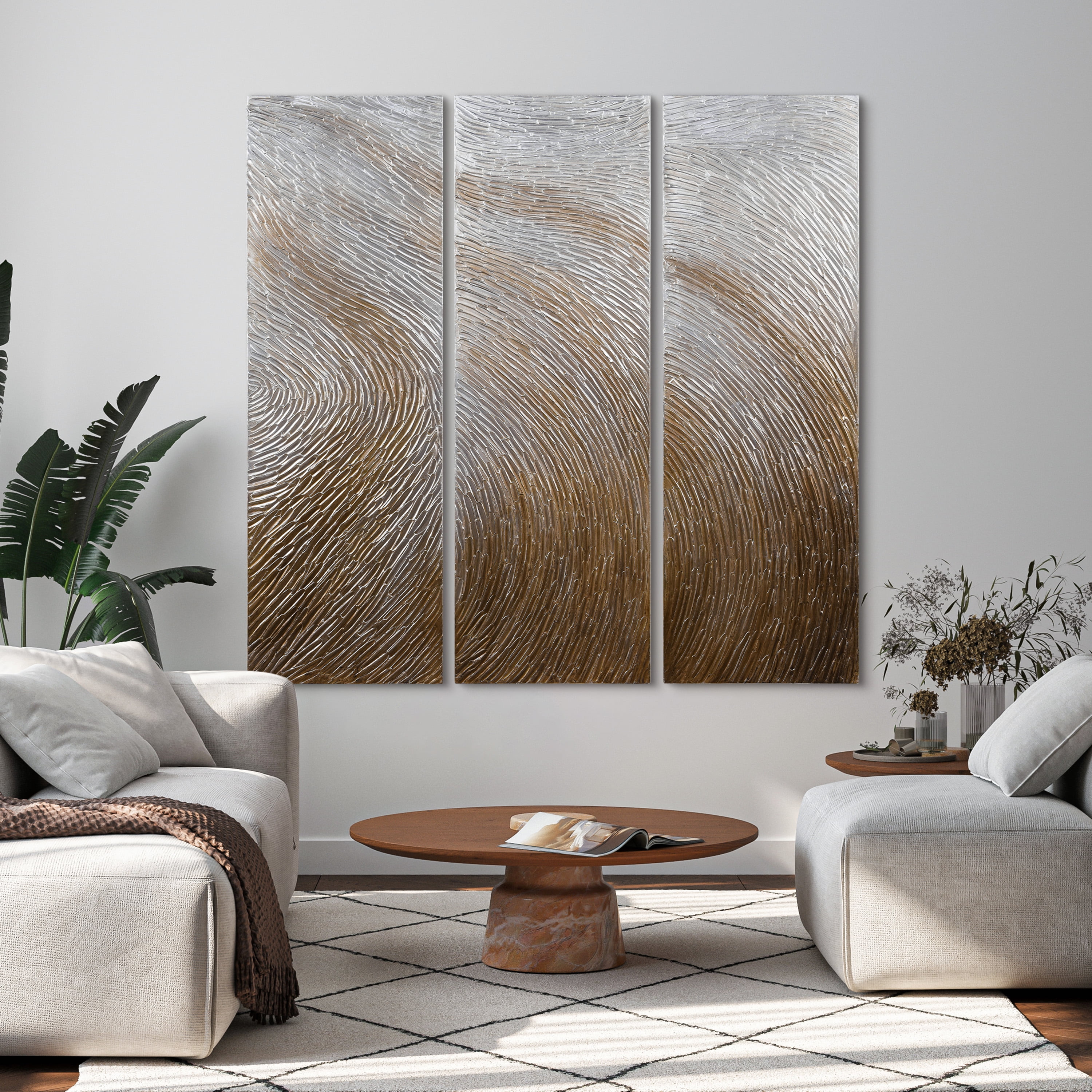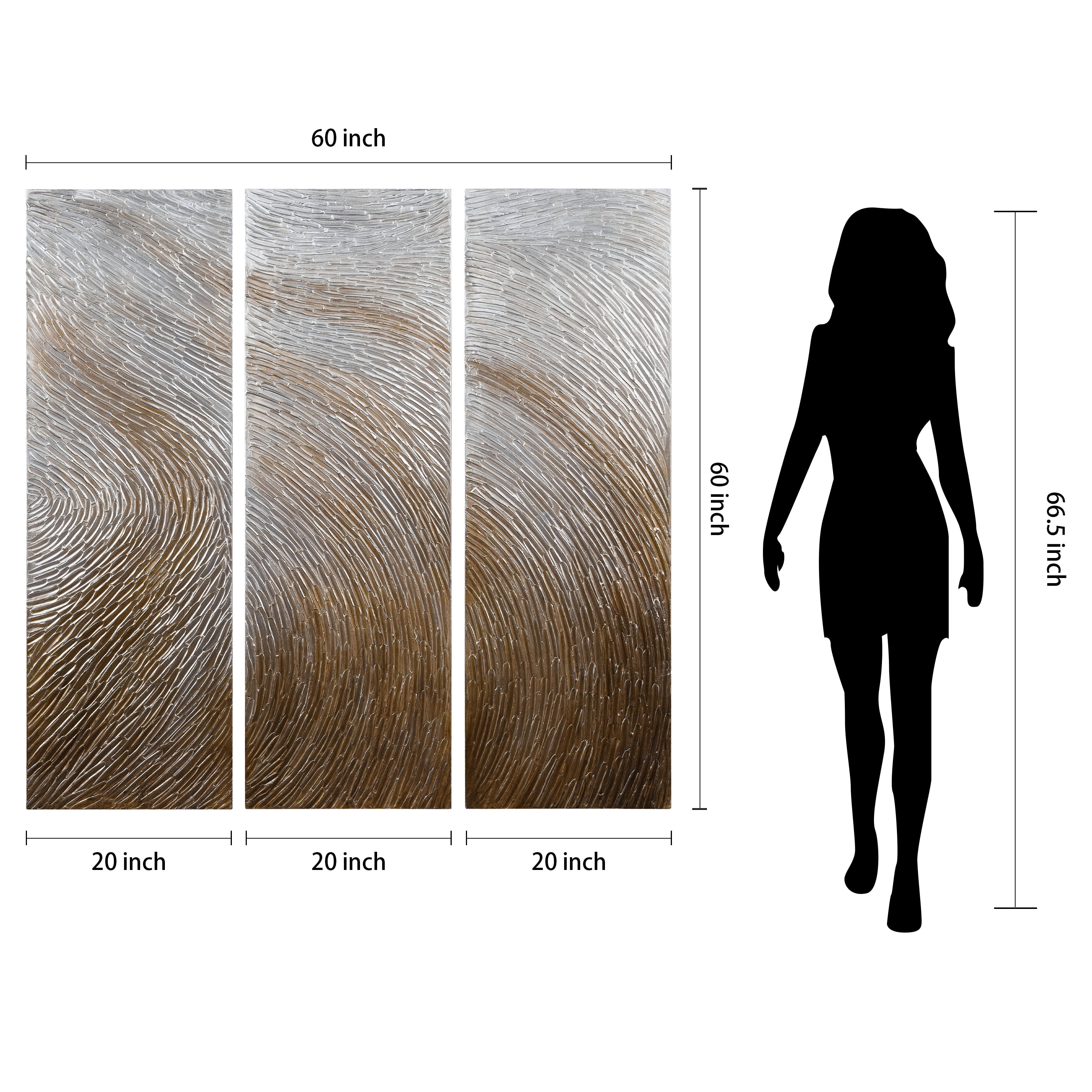 Are bare walls getting the better of you? Brighten up that stuffy study or lifeless living room with a piece of wall art that contributes to your home’s decor and shows off your personal style, like this piece! A bold accent on any wall, this hand-painted, three-panel piece showcases an undulating wave pattern with a deep gold and silver color pattern, as well as lines that add a gleaming touch of texture to your home. Each panel of this triptych measures 60” H x 20” W x 2” D and is crafted from canvas wrapped around a wood frame.