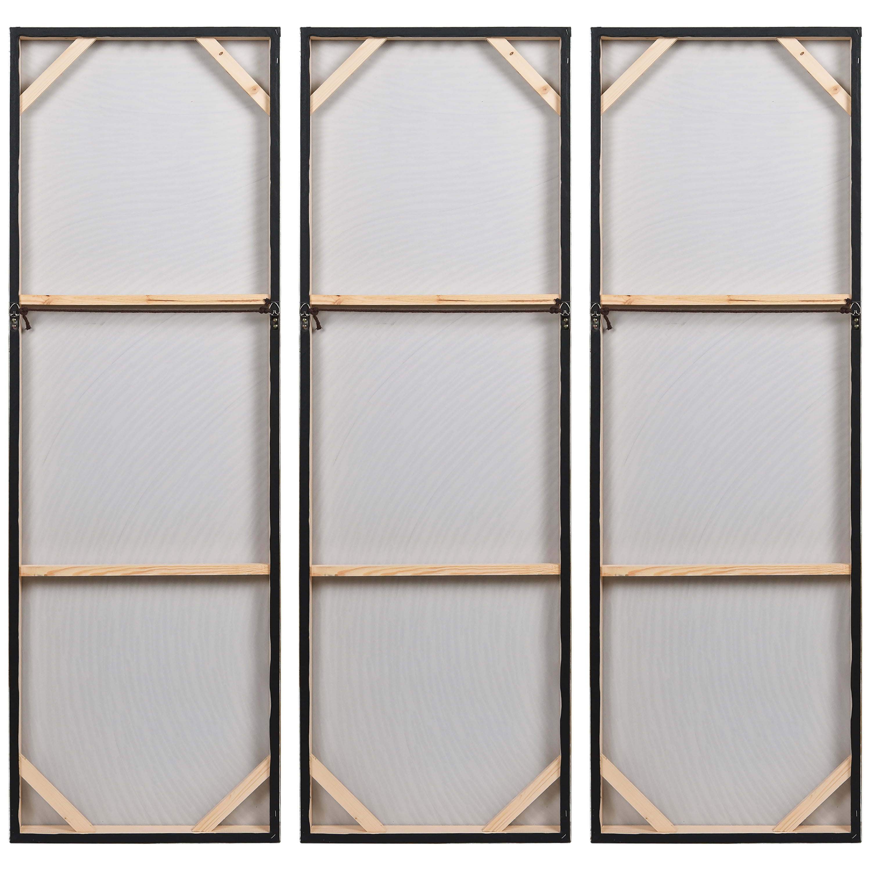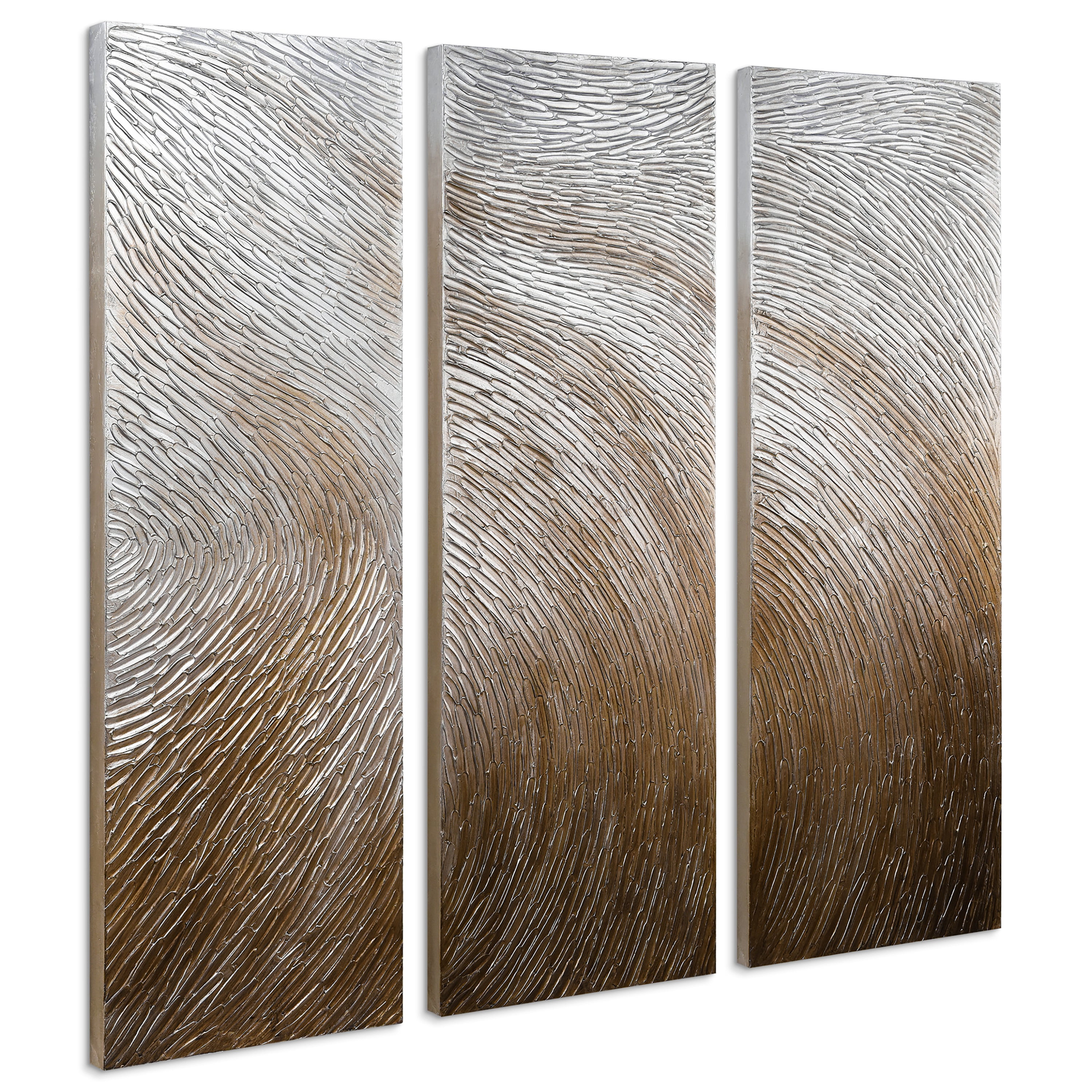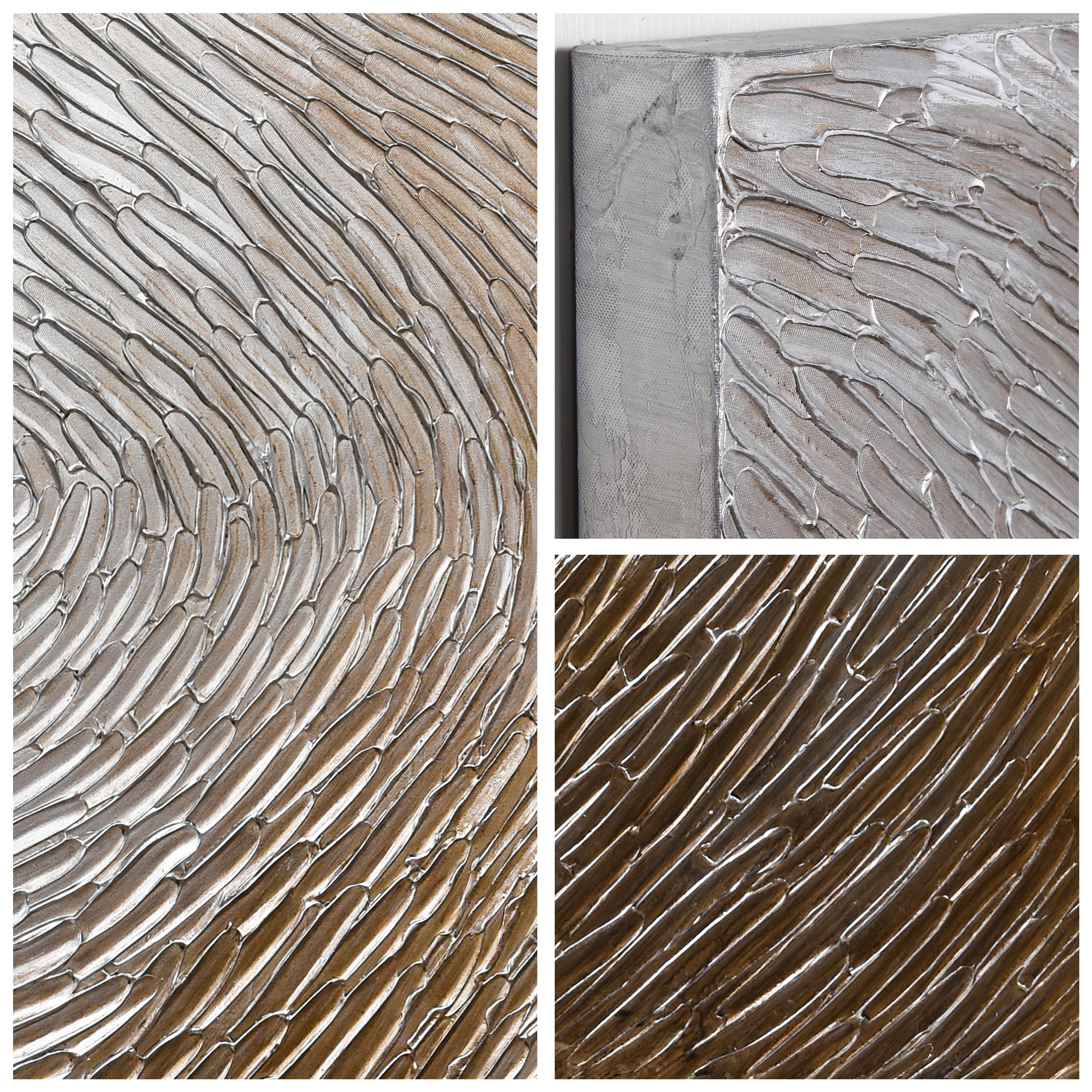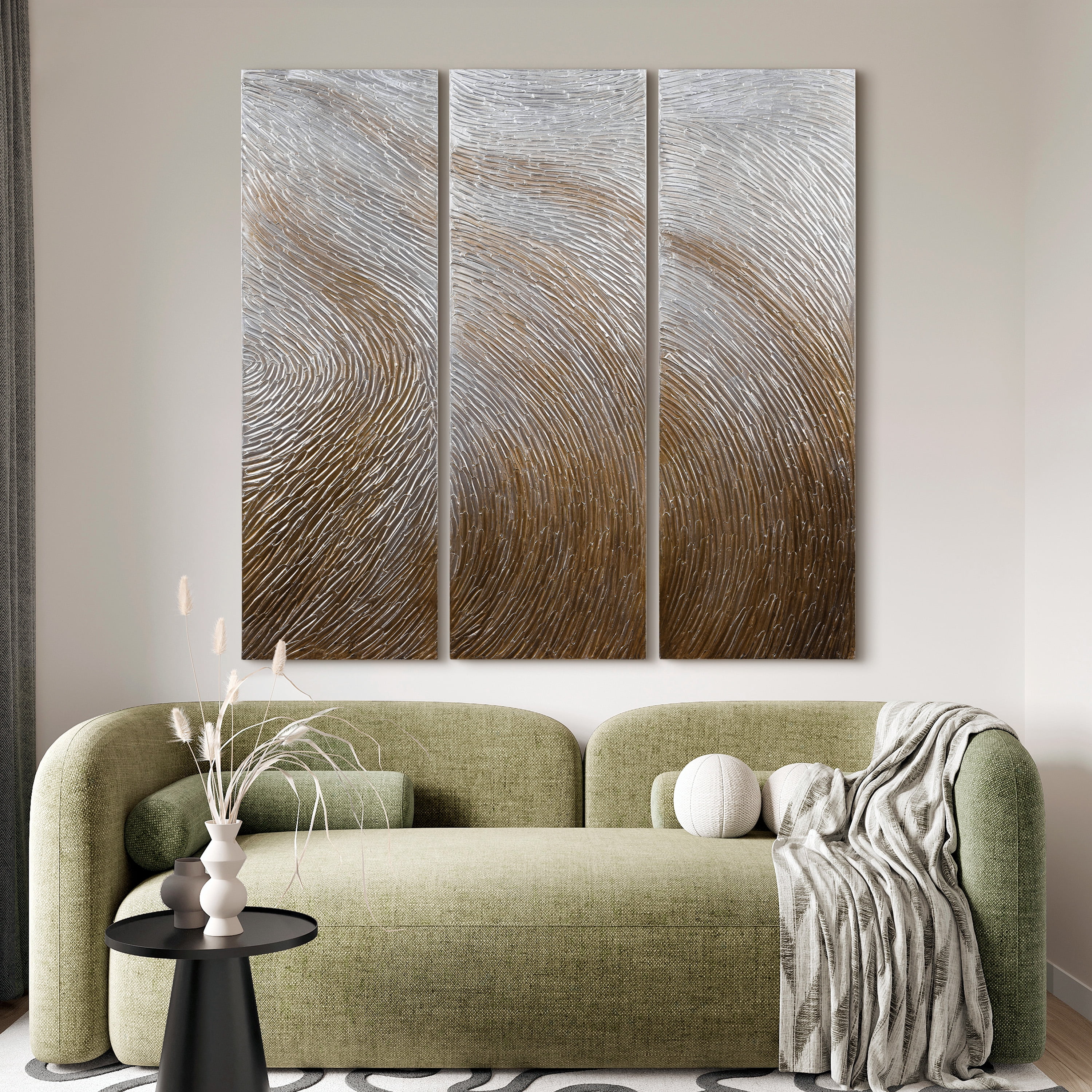 Are bare walls getting the better of you? Brighten up that stuffy study or lifeless living room with a piece of wall art that contributes to your home’s decor and shows off your personal style, like this piece! A bold accent on any wall, this hand-painted, three-panel piece showcases an undulating wave pattern with a deep gold and silver color pattern, as well as lines that add a gleaming touch of texture to your home. Each panel of this triptych measures 60” H x 20” W x 2” D and is crafted from canvas wrapped around a wood frame.