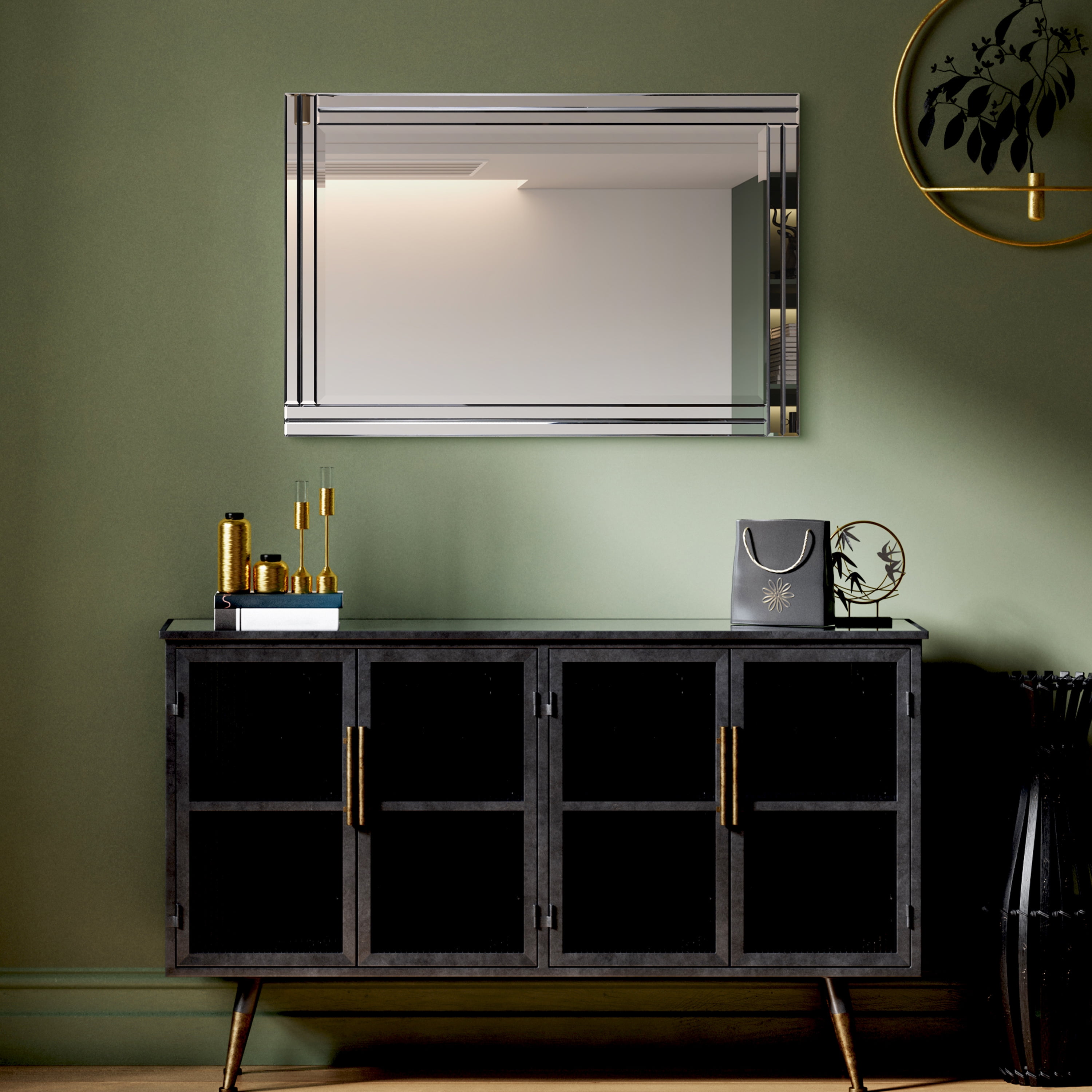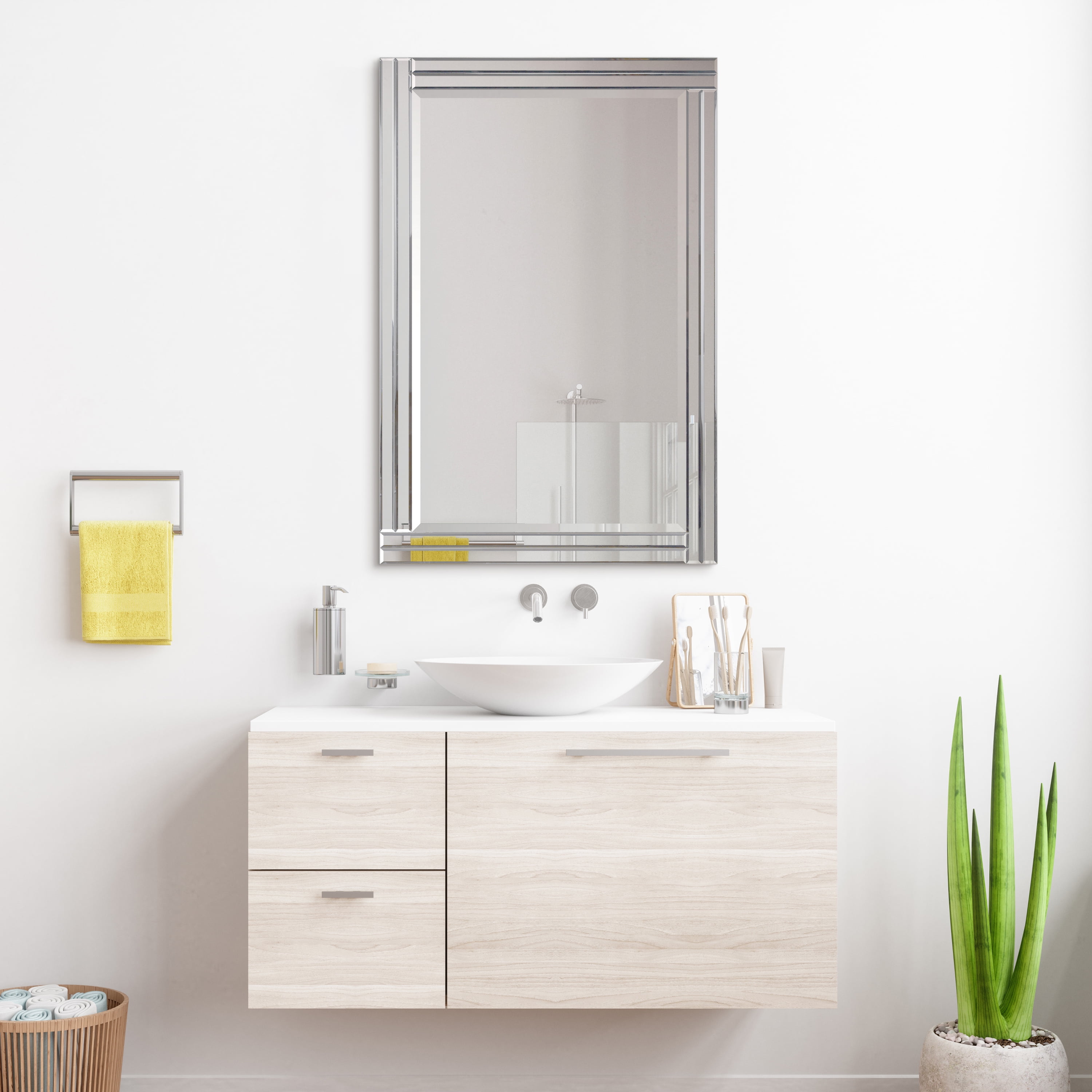 Sleek contemporary rectangle wall mirror Features a dimensional beveled-mirror “step” frame Uniquely framed with a beveled mirror Comes ready to hang on wall Great for Bathroom mirror, Vanity mirror, Living Room mirror or Bedroom mirror Solid wood frame covered with beveled clear mirror panels, 1″-beveled center mirror Rectangular wall mirror