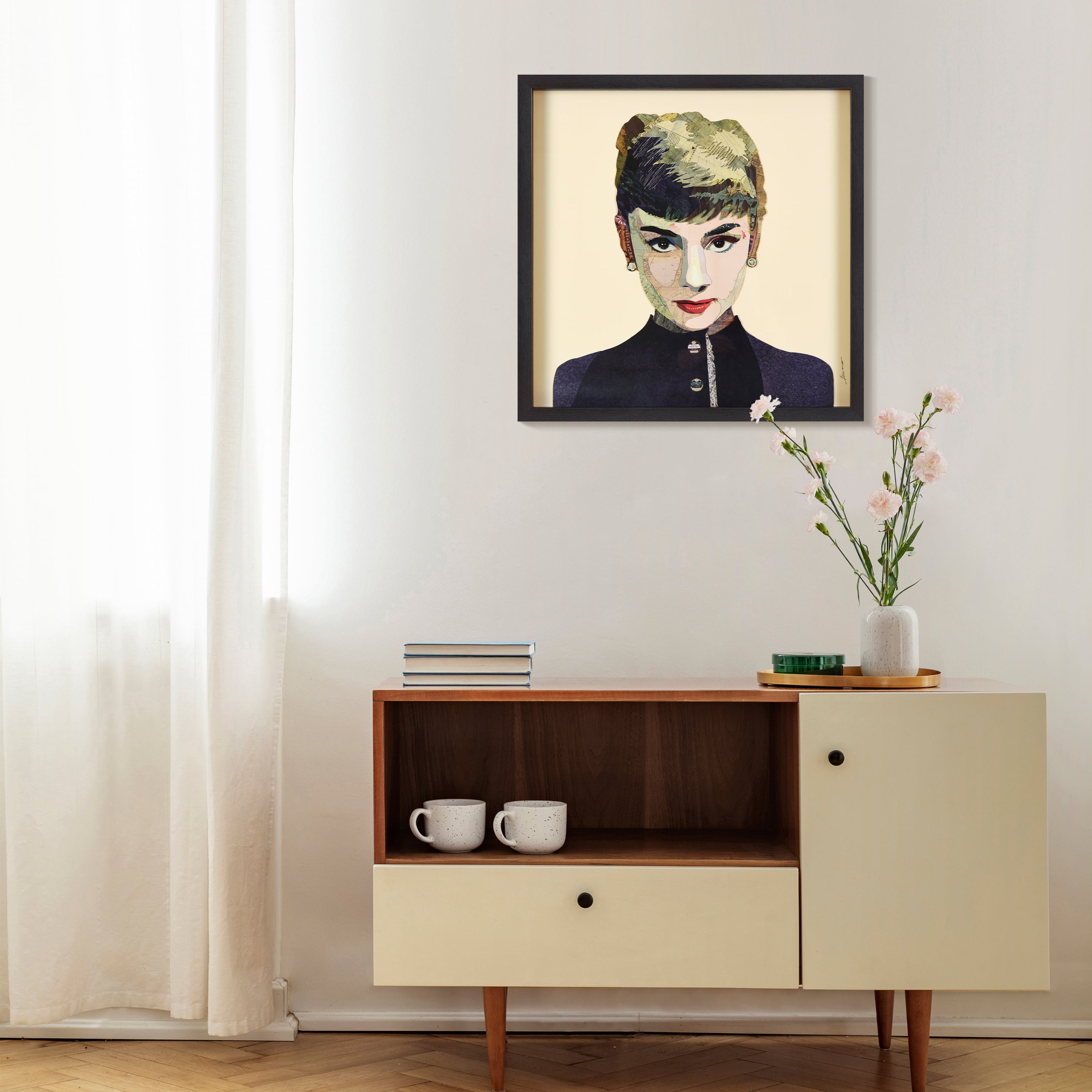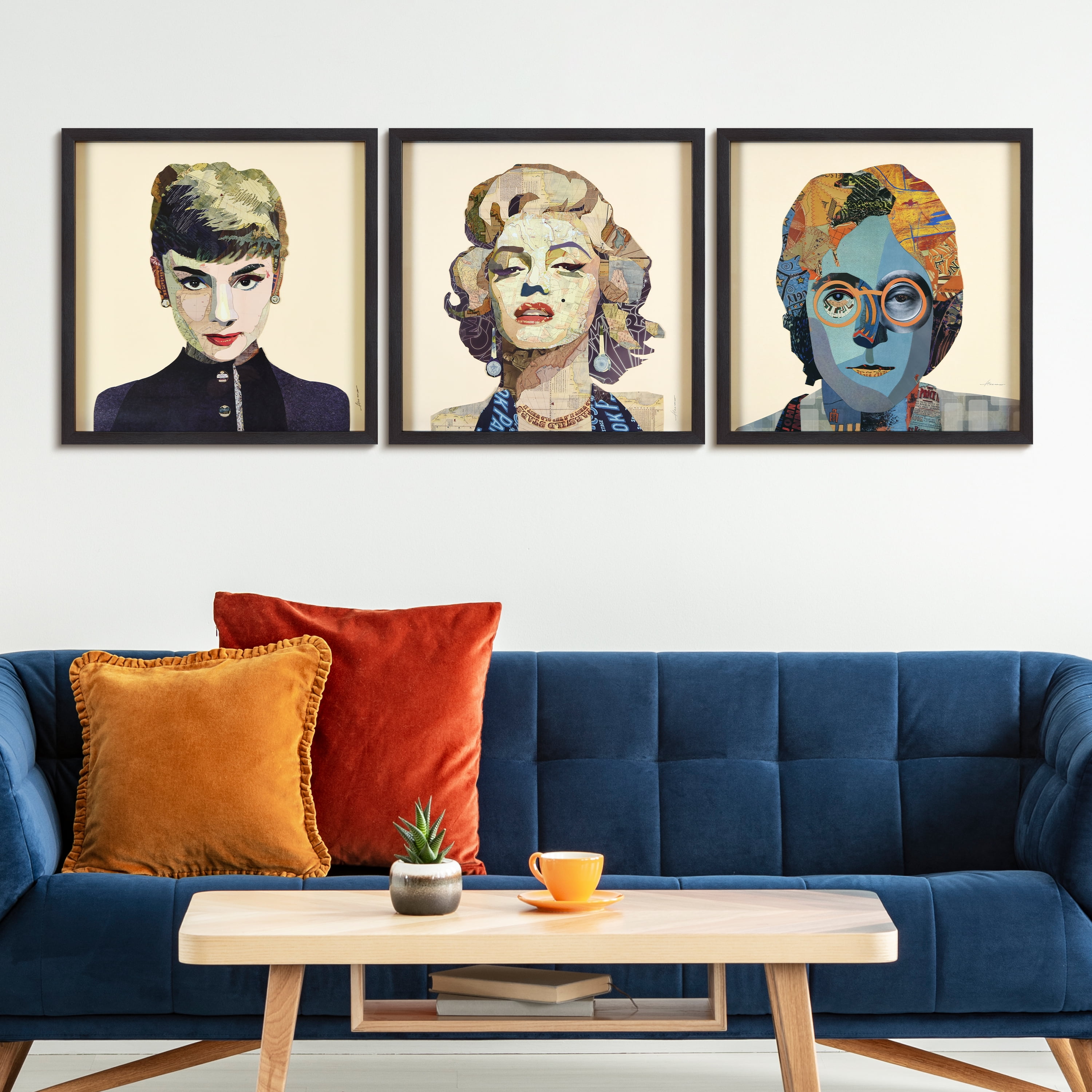 Triptych Set – Although Marilyn Monroe’s life may have been like a candle in the wind, her legacy in film and legend will live forever. This beautiful piece will look right at home in a collection of Hollywood memorabilia, as well as any modern art collection.In this gorgeous Alex Zeng work of art, we get a look at the stunning Audrey Hepburn. Born in Brussels, Belgium and later moving to London during World War 2, she later went to ballet school and became a model. Discovered by a producer, she went on to star in many major motion pictures. Even in the form of a blue and yellow collage, there’s no mistaking the famous, and indeed iconic, face of John Lennon. Complete with circular glasses and slight, knowing smile, this image manages to capture John in two distinct ways. Not only is his face represented very cleverly by intersecting shapes, including an image of his actual eye, but also something in the bold, psychedelic colors captures a little of his energetic creativity.