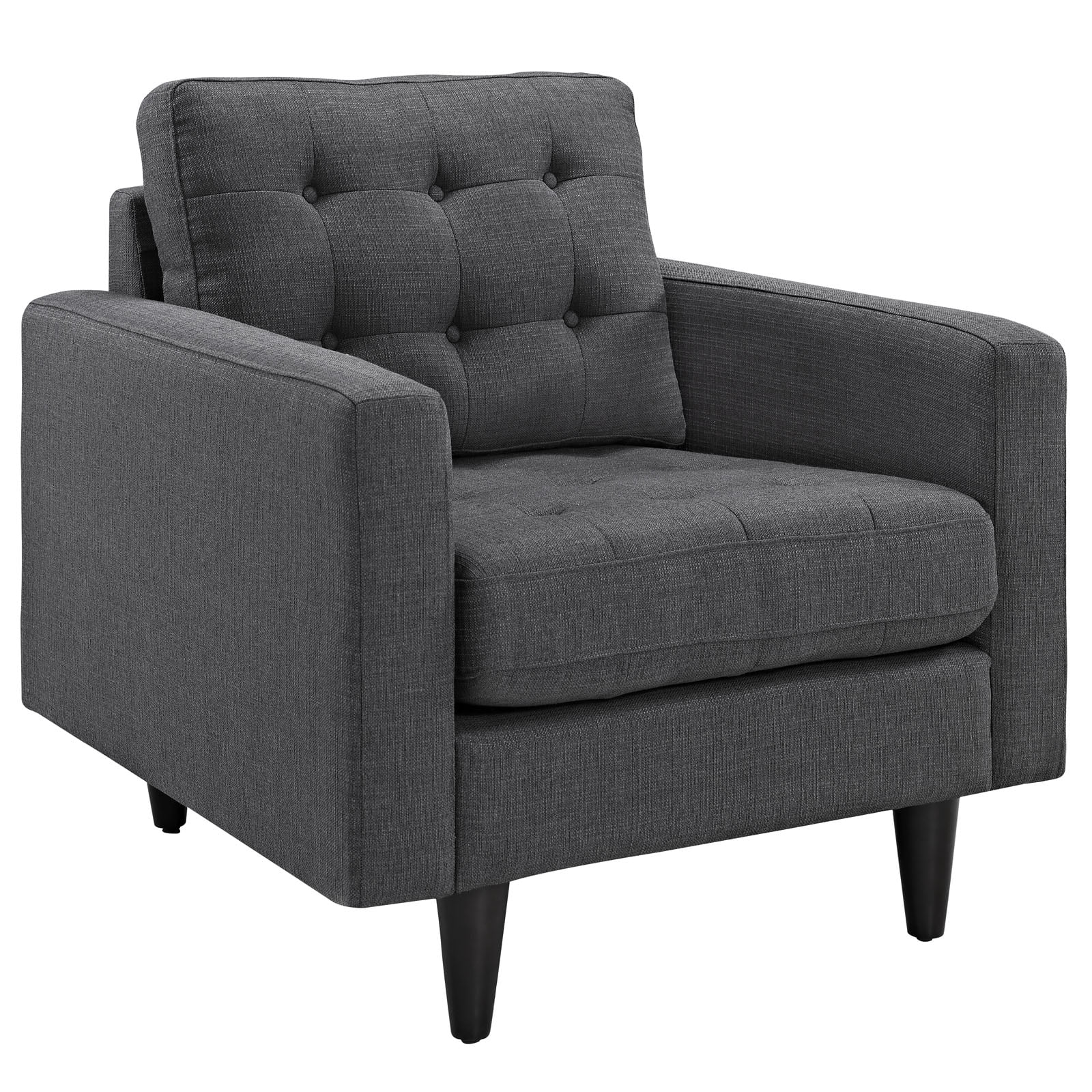 Modern armchair Deeply tufted buttons Polyester upholstery Solid wooden legs Glides to prevent scratching.