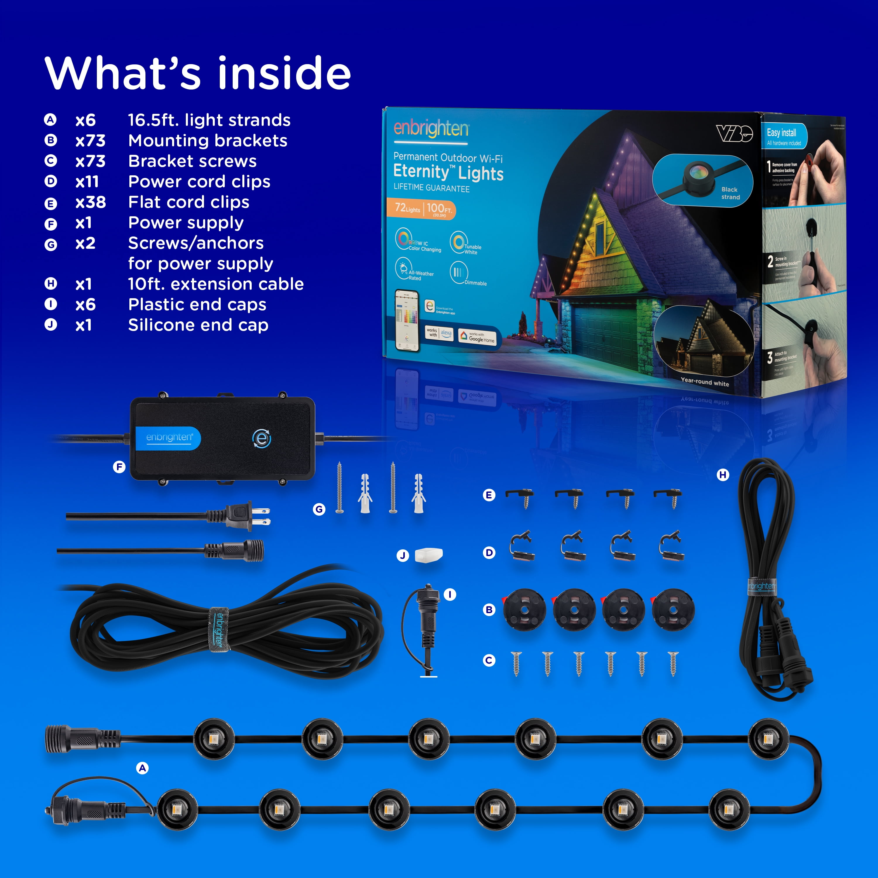 Lighting Meets Lifestyle — RGBWIC LEDs provide dedicated adjustable white light to perfectly match your home’s exterior lighting and the full spectrum of true, rich colors All-in-One Kit — Six 16.5ft. black strands, 72 total LEDs, patent-pending mounting brackets with 3M VHB tape, cord clips, screws, power supply and 10ft. extension cable are included to enjoy straight out of the box Smart App — Pair to your 2.4GHz Wi-Fi through the Enbrighten app to accentuate your home with millions of color combinations, modes and effects plus schedules, automations and individual LED control create unique outdoor holiday décor or accent lighting Lifetime DIY Installation — Simply snap the lights into the mounting brackets, which secure permanently with screws as well as high-quality tape, and link, flex or cut strands to create the layout of your dreams; 200ft. maximum length Ultimate Permanent Lights — These premium LEDs are created to last; the entire system meets ETL and NEC requirements for outdoor lighting, and its all-weather rating with -4F to 131F operating temperature ensures year-round enjoyment
