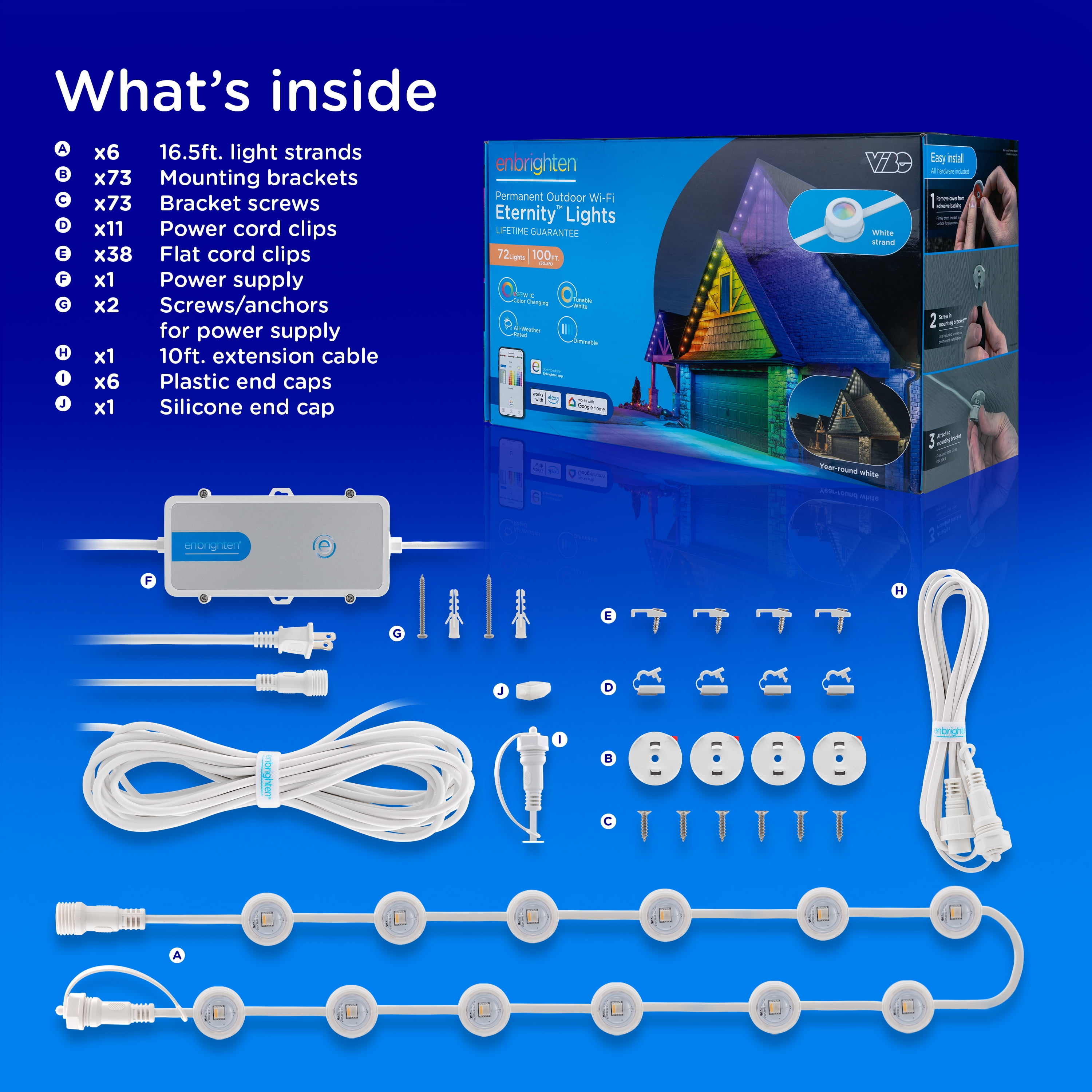 Lighting Meets Lifestyle — RGBWIC LEDs provide dedicated adjustable white light to perfectly match your home’s exterior lighting and the full spectrum of true, rich colors All-in-One Kit — Six 16.5ft. white strands, 72 total LEDs, patent-pending mounting brackets with 3M VHB tape, cord clips, screws, power supply and 10ft. extension cable are included to enjoy straight out of the box Smart App — Pair to your 2.4GHz Wi-Fi through the Enbrighten app to accentuate your home with millions of color combinations, modes and effects plus schedules, automations and individual LED control create unique outdoor holiday décor or accent lighting Lifetime DIY Installation — Simply snap the lights into the mounting brackets, which secure permanently with screws as well as high-quality tape, and link, flex or cut strands to create the layout of your dreams; 200ft. maximum length Ultimate Permanent Lights — These premium LEDs are created to last; the entire system meets ETL and NEC requirements for outdoor lighting, and its all-weather rating with -4F to 131F operating temperature ensures year-round enjoyment
