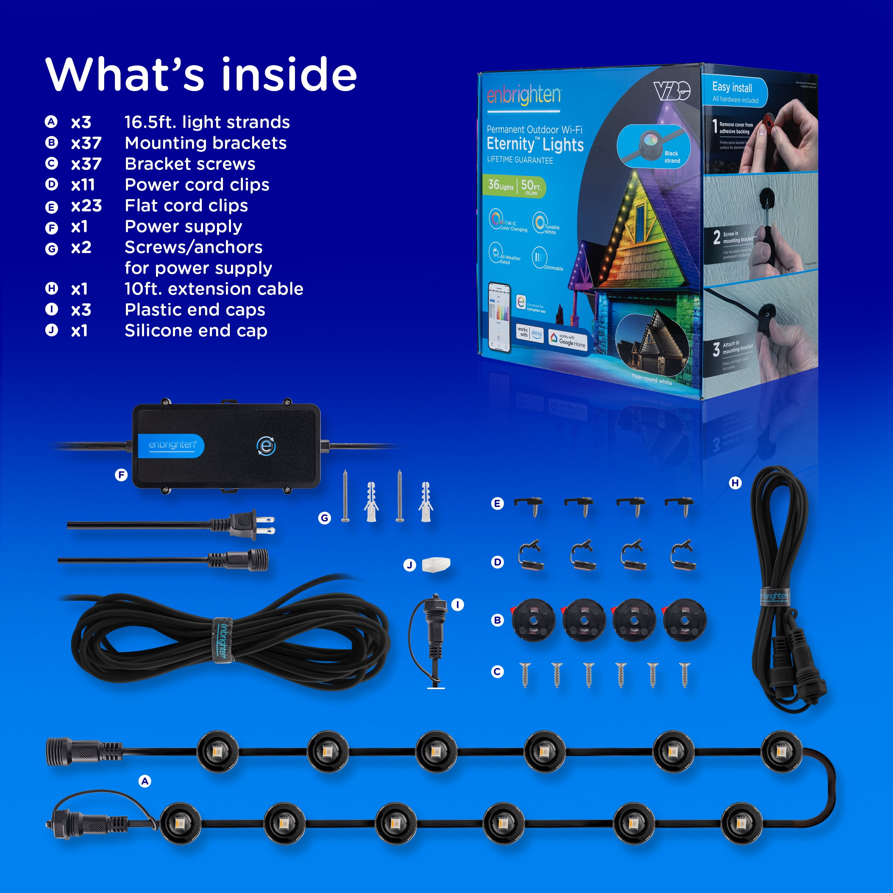 Lighting Meets Lifestyle — RGBWIC LEDs provide dedicated adjustable white light to perfectly match your home’s exterior lighting and the full spectrum of true, rich colors All-in-One Kit — Three 16.5ft. black strands, 36 total LEDs, patent-pending mounting brackets with 3M VHB tape, cord clips, screws, power supply and 10ft. extension cable are included to enjoy straight out of the box Smart App — Pair to your 2.4GHz Wi-Fi through the Enbrighten app to accentuate your home with millions of color combinations, modes and effects plus schedules, automations and individual LED control create unique outdoor holiday décor or accent lighting Lifetime DIY Installation — Simply snap the lights into the mounting brackets, which secure permanently with screws as well as high-quality tape, and link, flex or cut strands to create the layout of your dreams; 200ft. maximum length Ultimate Permanent Lights — These premium LEDs are created to last; the entire system meets ETL and NEC requirements for outdoor lighting, and its all-weather rating with -4F to 131F operating temperature ensures year-round enjoyment