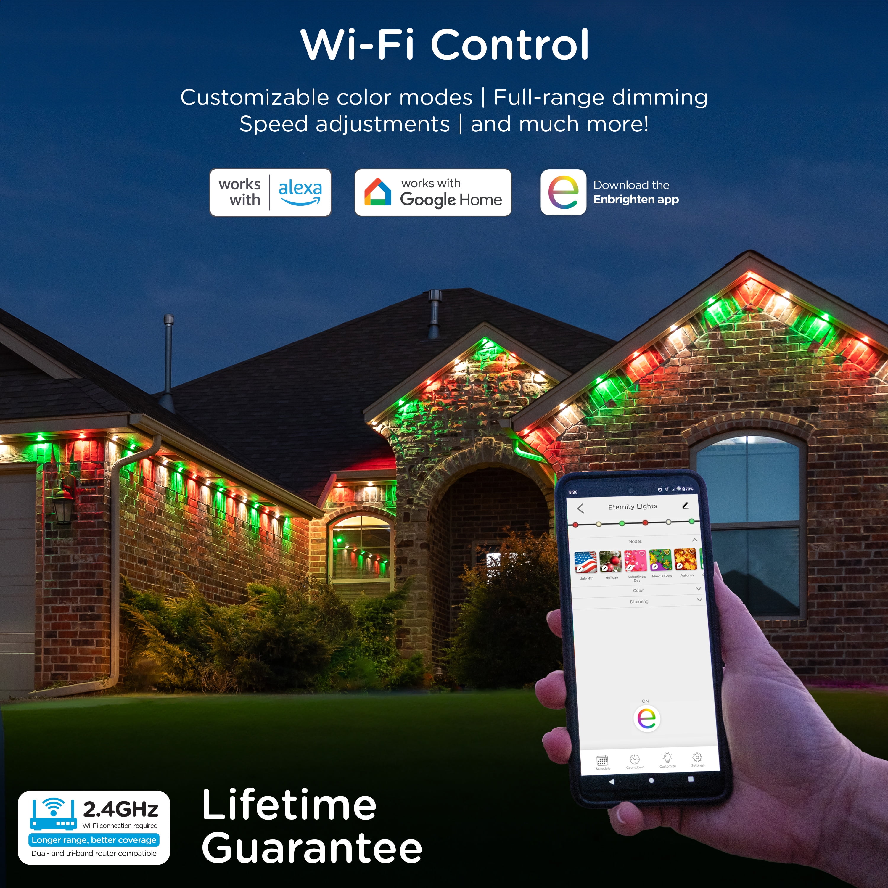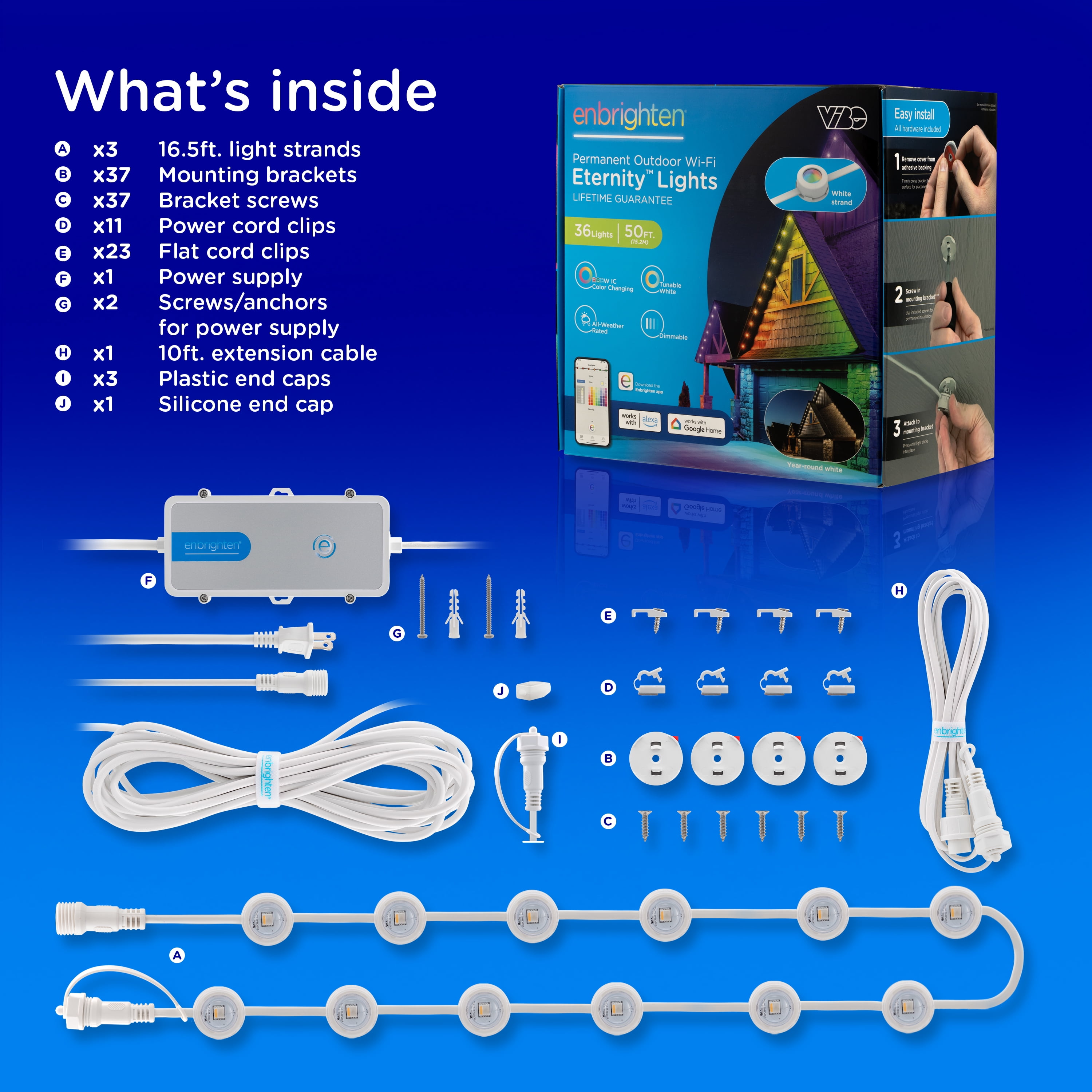 Lighting Meets Lifestyle — RGBWIC LEDs provide dedicated adjustable white light to perfectly match your home’s exterior lighting and the full spectrum of true, rich colors All-in-One Kit — Three 16.5ft. white strands, 36 total LEDs, patent-pending mounting brackets with 3M VHB tape, cord clips, screws, power supply and 10ft. extension cable are included to enjoy straight out of the box Smart App — Pair to your 2.4GHz Wi-Fi through the Enbrighten app to accentuate your home with millions of color combinations, modes and effects plus schedules, automations and individual LED control create unique outdoor holiday décor or accent lighting Lifetime DIY Installation — Simply snap the lights into the mounting brackets, which secure permanently with screws as well as high-quality tape, and link, flex or cut strands to create the layout of your dreams; 200ft. maximum length Ultimate Permanent Lights — These premium LEDs are created to last; the entire system meets ETL and NEC requirements for outdoor lighting, and its all-weather rating with -4F to 131F operating temperature ensures year-round enjoyment