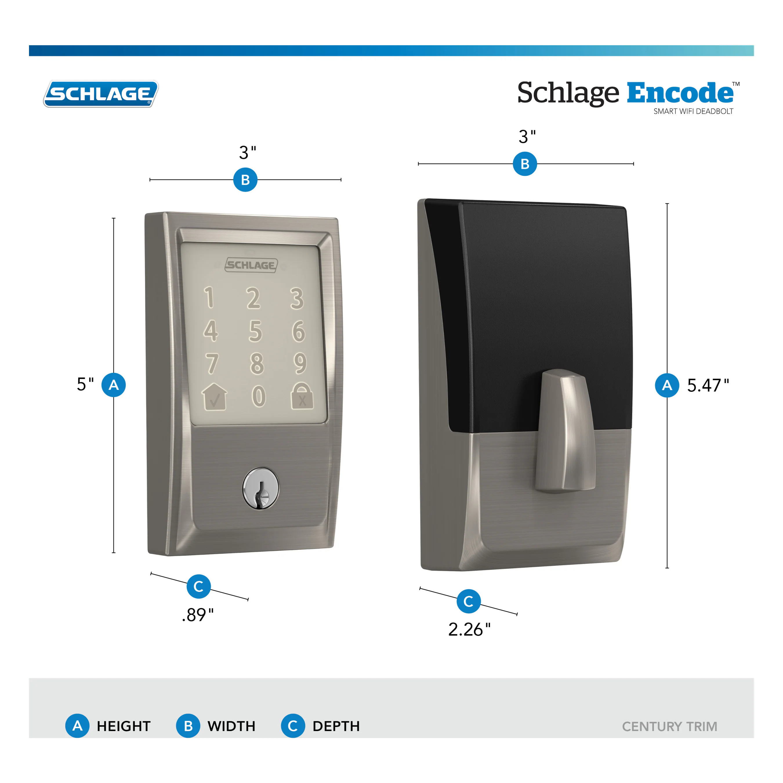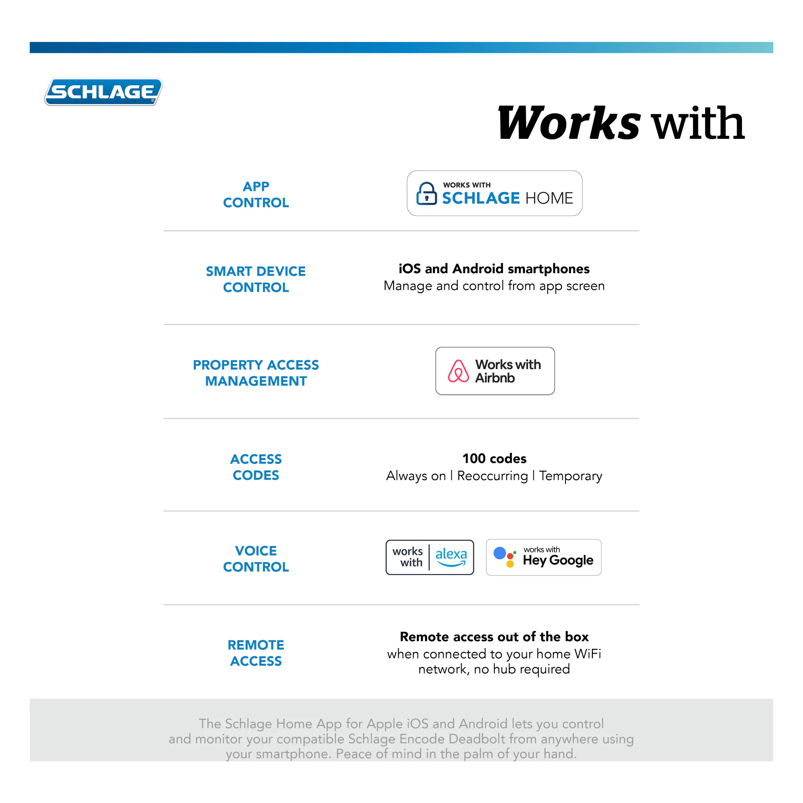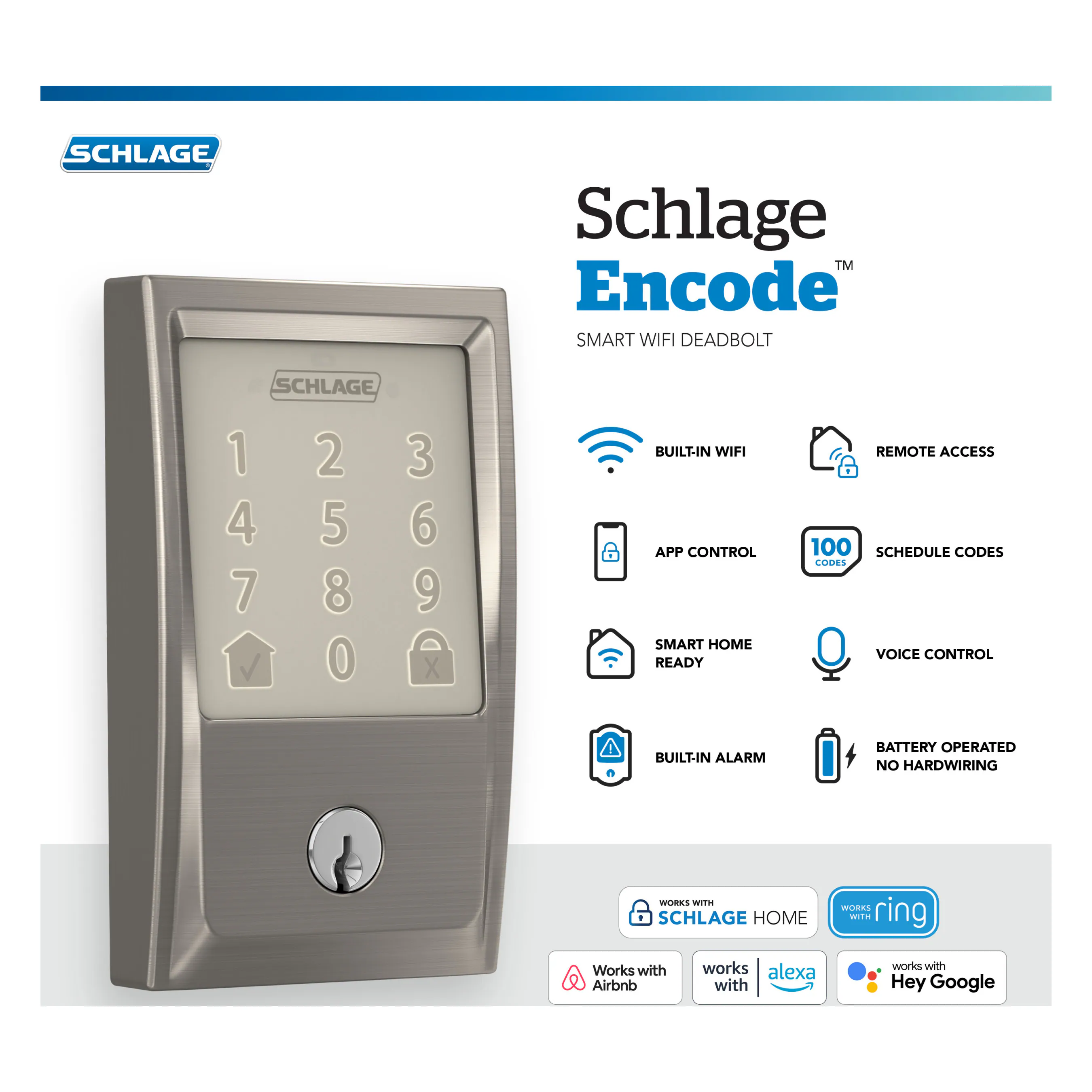 The Schlage Encode™ Smart WiFi Deadbolt offers peace of mind from anywhere by allowing you to remotely manage your lock via the Schlage Home app. Seamlessly control and monitor your home from anywhere when connected to your home’s WiFi network and paired with the Schlage Home app, no additional accessories needed. Conveniently schedule up to 100 access codes for keyless entry, view lock history, receive push notifications, pair with Amazon Alexa and Google Assistant for hands-free control, and so much more. This innovative smart lock is available in a variety of styles and finishes that pair perfectly with Schlage interior door hardware, creating a cohesive look throughout the home. The Schlage Encode™ Smart WiFi Deadbolt offers the advanced features of secure encryption and built-in alarm technology. It is certified highest in Security, Durability, and Finish by BHMA industry experts and backed by a century of trusted innovation and security from Schlage.