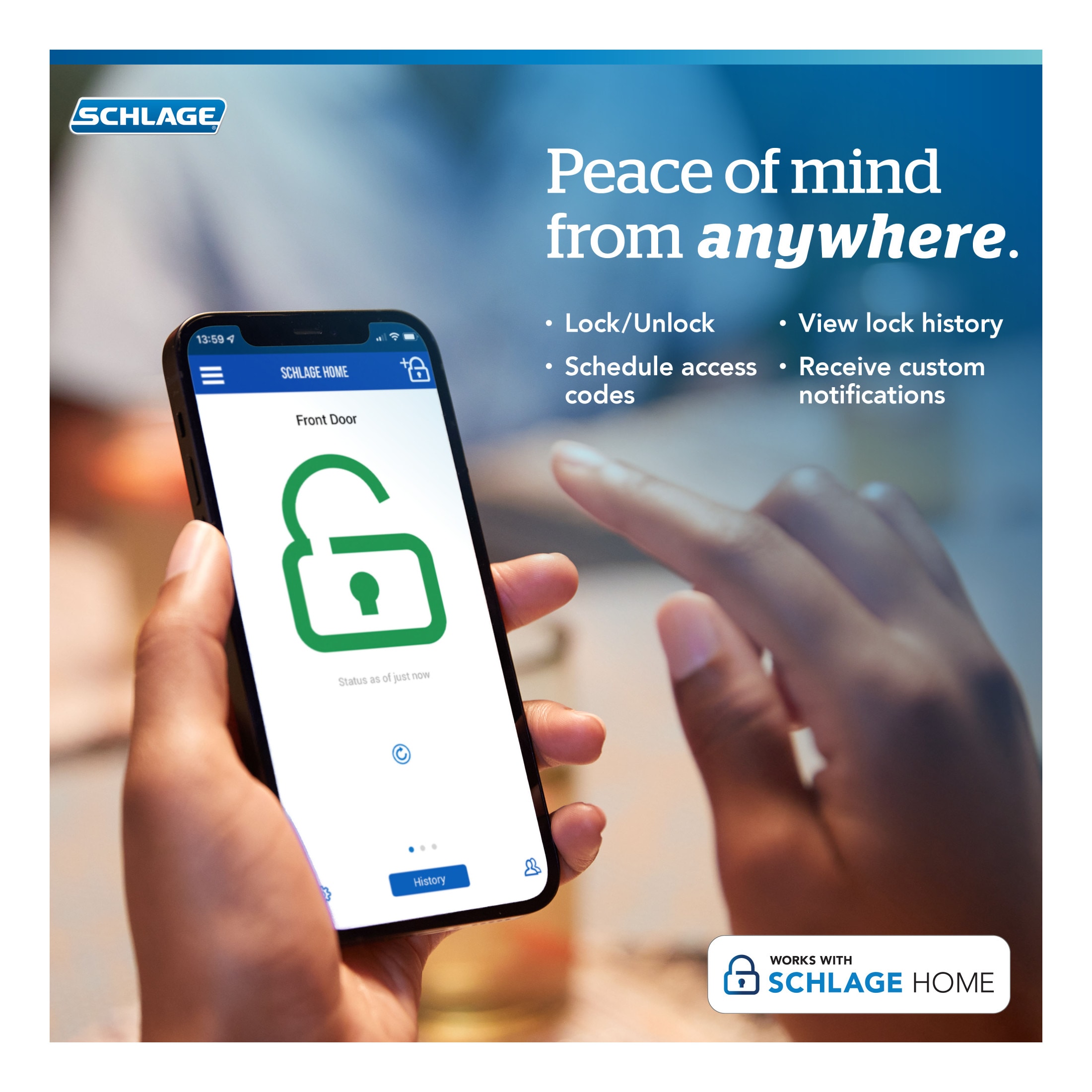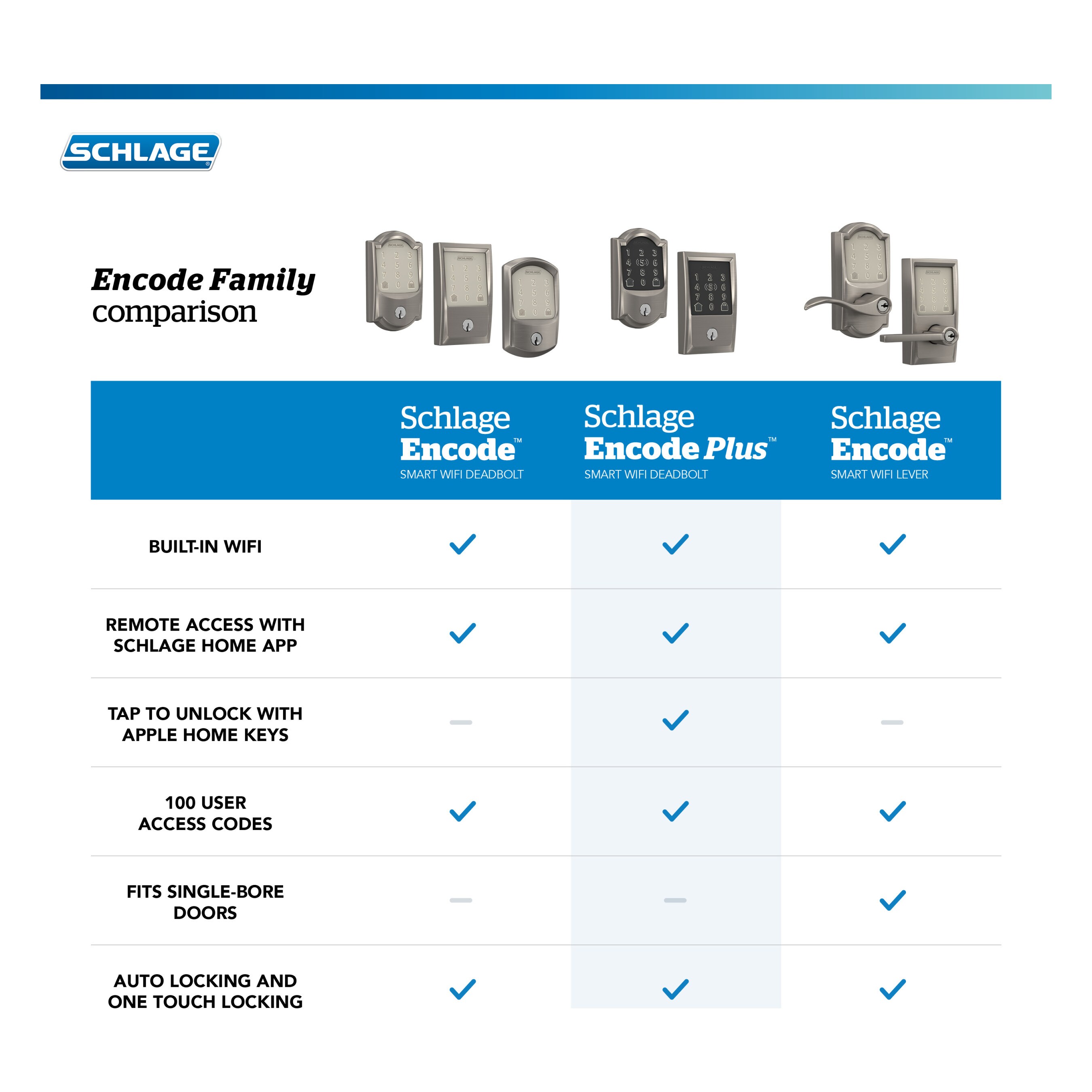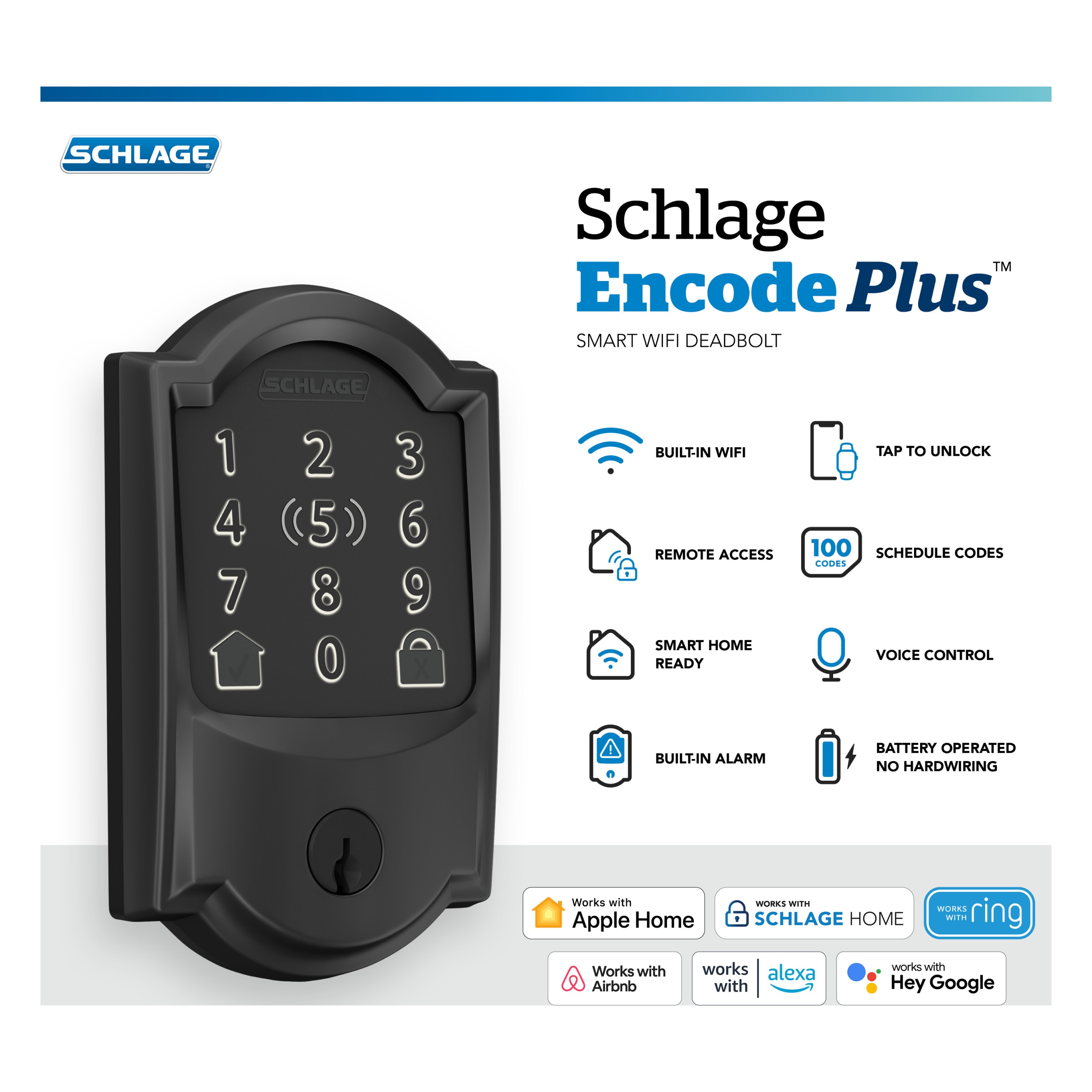 Built on a century of industry-leading innovation and trusted security, the Schlage Encode Plus Smart WiFi Deadbolt is changing the way you protect what matters most. Built-in WiFi and secure encryption help you control and monitor your home from anywhere, no additional accessories needed. This innovative smart lock provides secure, seamless access when paired to the Schlage Home app and connected to your home’s WiFi network. Conveniently schedule up to 100 access codes, view lock history, receive push notifications, pair with Amazon Alexa and Google Assistant for hands-free control, and so much more. It also works with Apple HomeKit and Apple home keys. With home keys, you can simply tap to lock or unlock using your iPhone or Apple Watch for easy and secure access to your home. Built smart and tough, the Schlage Encode Plus deadbolt is certified highest in Security, Durability, and Finish by industry experts.