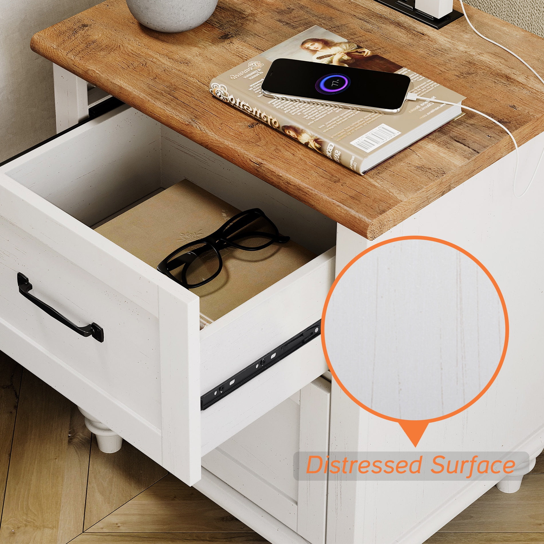 Charging Function: With 2 standard AC outlets and 2 USB ports. You could charge mobile phone, table lamp and other device conveniently. Power cable length: 6.5 ft. Plus, the distance between the bottom plate and the floor is large enough so that the robot vacuum cleaner can pass freely. Morden Style: Featured with rustic white wood body, oak table top and special gourd-shaped legs which looks modern and elegant. Well matches with your farmhouse style home decor and bring you fashional and cozy lifestyle. Multi Functionality: Waking up in the middle of night? Turn on your lamp on the table top, take your eye mask out of the drawer, and take a book from the open shelf to read. Then, fall back to sleep with peace of mind! Humanized Detail:With arc-shaped edges of top plate instead of normal sharp corner, it protects your family members well, especially for kids. Secured by anti-dropping device to reduce tip-over accident for more safety. The distance under the nightstand is high enough for robot vacuum cleaner pass freely. Premium Material : Crafted from thickened premium MDF board that is safe and environmentally friendly, which will allow you sleep peacefully. High quality waterproof surface treatment, easy to clean and maintain, durable. Provide a long service life with excellent wear resistance which be more stable and durable than others on the market. One-Year Warranty& Easy to Assemble: You don’t even have to worry about the assembly because this bedside table comes with clear instructions and numbered parts for zero hassle!