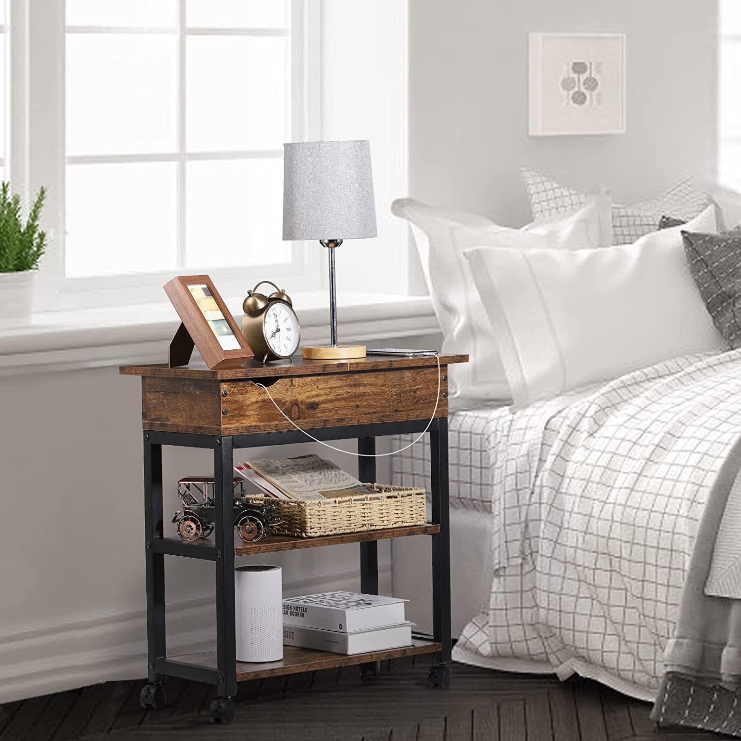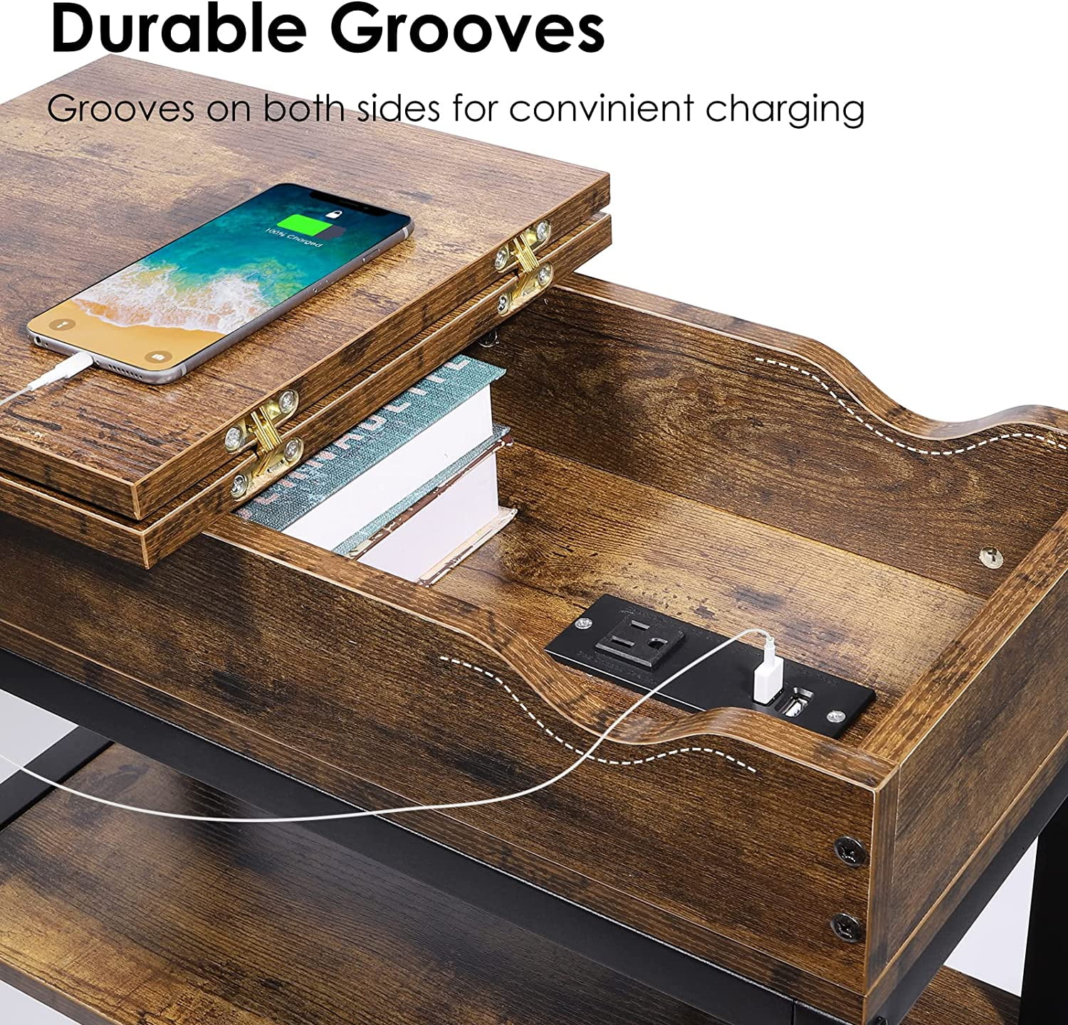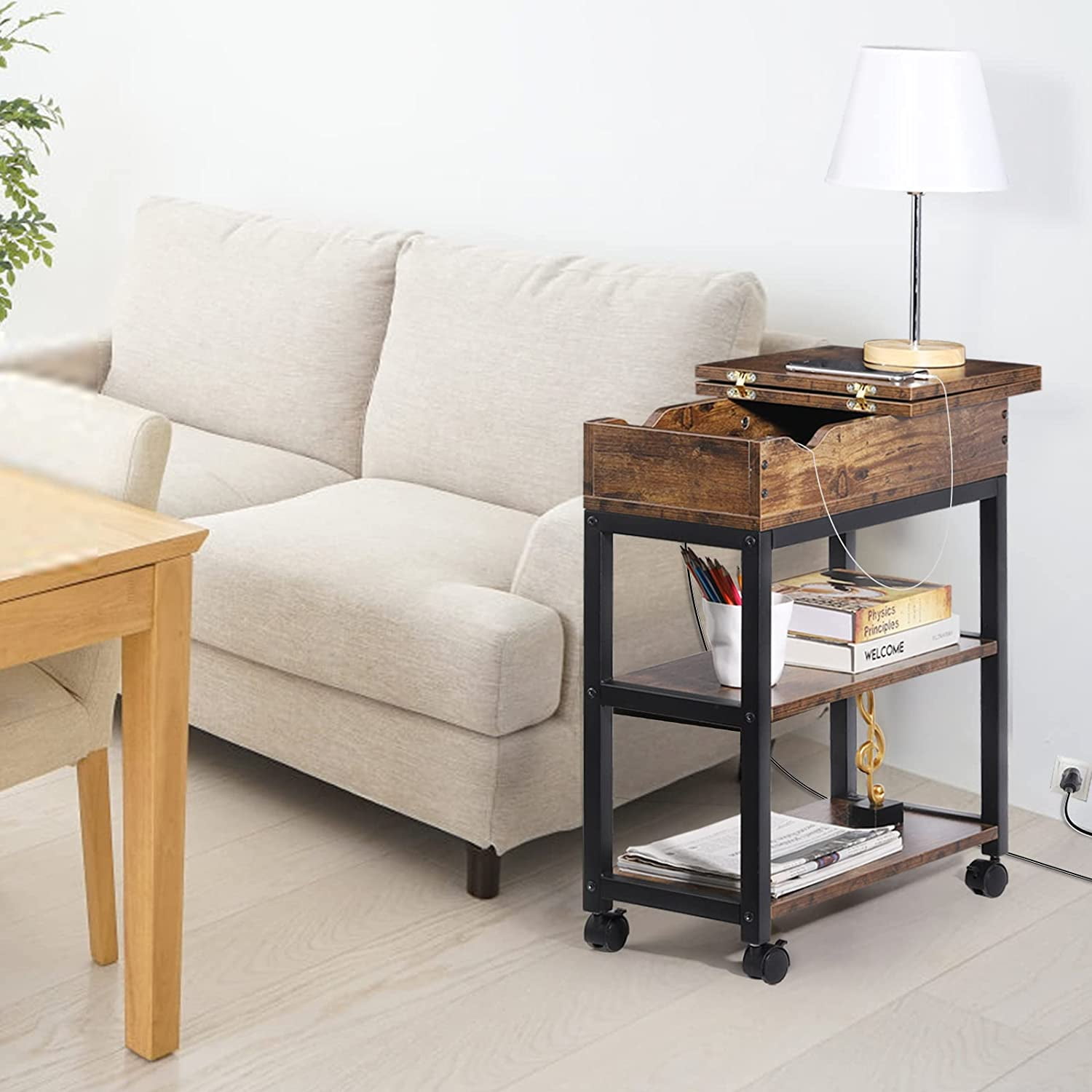 The Oumilen rectangle flip top side table with charging station features a modern and convenient design equipped 2 USB charging ports and 2 AC power outlets, which will allow you to charge phones, tablet, kindle, speaker and more mobile devices at any time. Designed with 3 tiers, this end table will provide you with more space to storage small items. To meet your diverse needs, this end table equipped with 4 feet pads, 4 360-degree rotating wheels, you can change the feet as your preferences. The table top is designed with a large flip table part, so you can tuck away and take out small items easily.