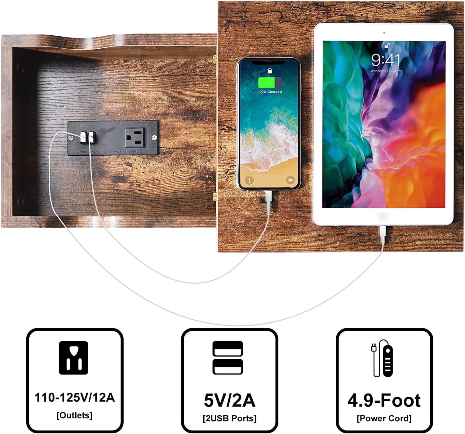 [End Table with Charging Station] The modern charging station includes 3-prong AC outlets and two USB ports, which can easily charge your phone, tablet, etc. 4.9ft long power supply cord allows you to move this end table freely. [Multipurpose Side Table] Sofa side table with a drawer and 2 shelves offer you ample space to storage. Flip top drawer for concealed storage for open display on which you can place your phone and adapters. Great for living room, bedroom home, office and small spaces. [Sturdy Construction] Made of premium particleboard and robust steel frame, providing great stability and durability, which make the bearing capacity up to 220 lb. Also equipped with 4 rollers and 4 adjustable feet, you can choose according to your needs. [Easy to Assemble] The living room table comes with all tools needed, you can definitely complete the installation easily and smoothly by following clear and detailed instruction. Product dimensions: 23.62″L x 11.81″W x 23.62″H [Rustic Style & Vintage Design] The matte black metal frame represents the industrial style, while the brown wood panel represents the retro design, a a perfect pick for your bedroom, living room, home office, it can be used as a bedside table, couch table.