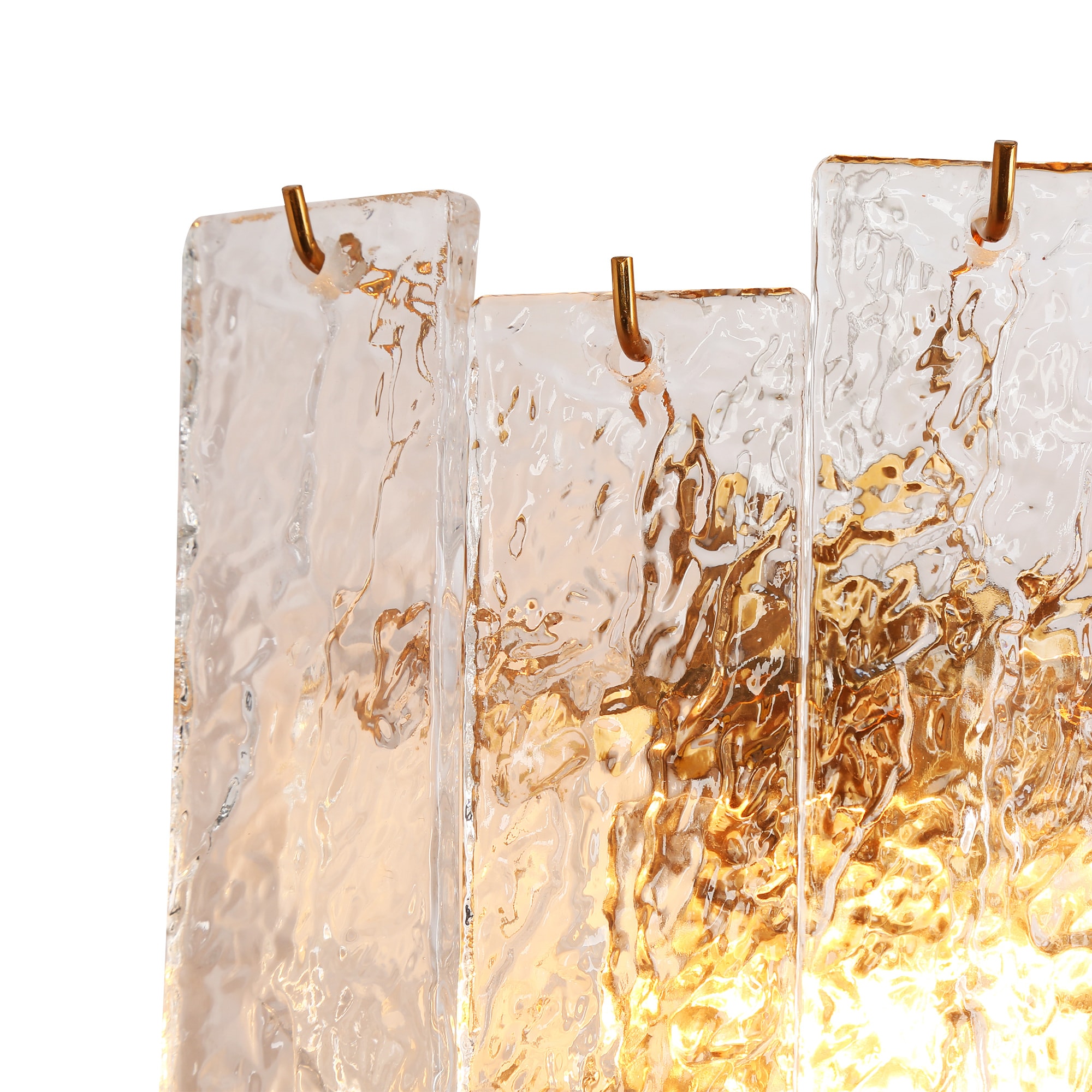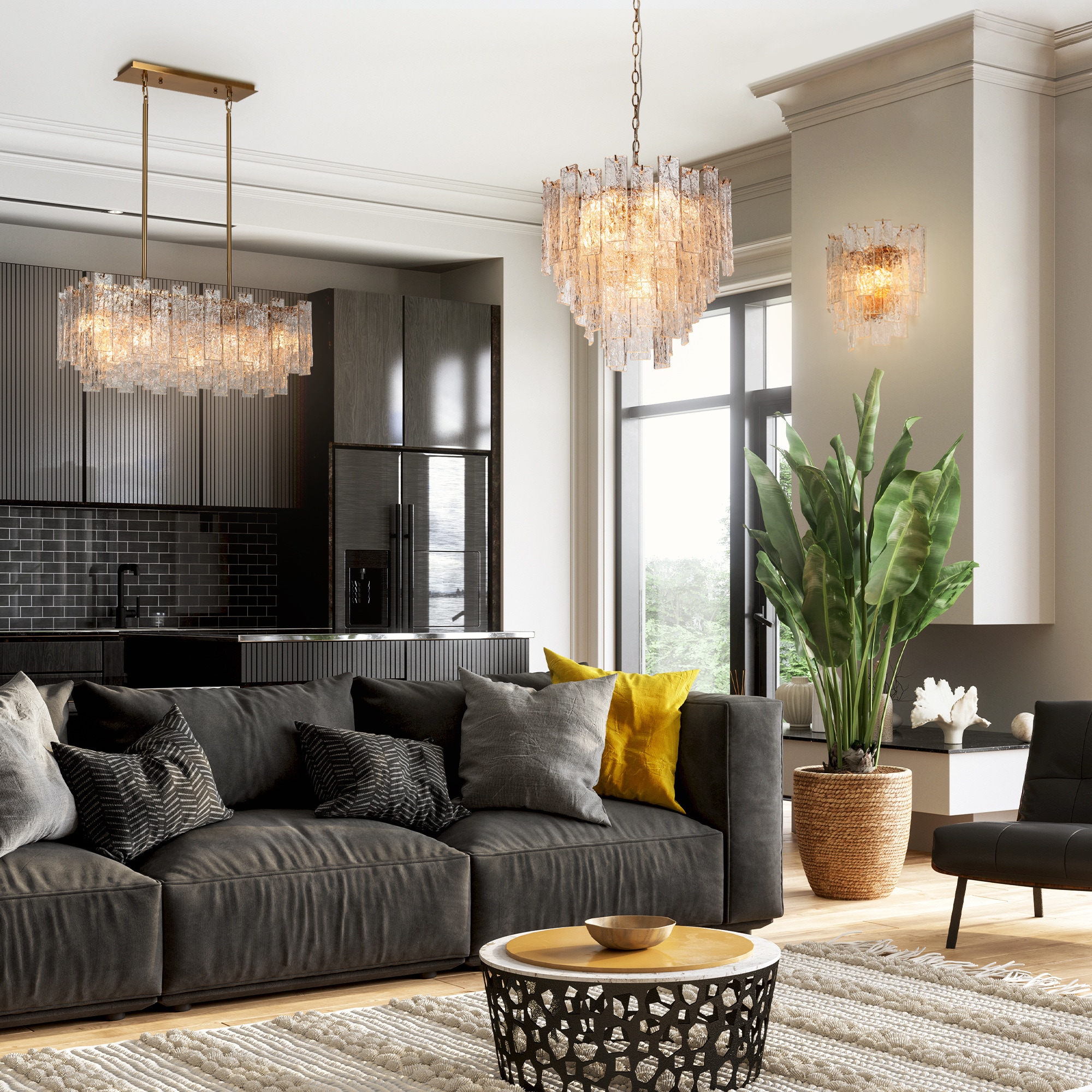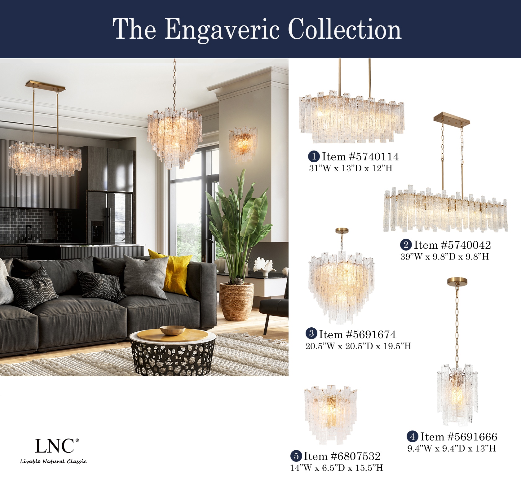 The Engaveric Collection evokes a stunning ice sculpture in crystal, featuring Glacier Crystal Glass panels that capture the essence of frozen beauty. The flat geometric panels of textured glass hang in linear architectural tiers, accented with icicle strip crystal glass that adds a unique touch of elegance. The frosted panes lend the light a soft, diffused glow, while the glittering finishes enhance the overall brilliance. This linear pendant light is perfect for kitchen islands, dining areas, or living rooms, offering a blend of sophistication and functionality. Its sleek design, paired with gold accents, makes it a striking addition to a variety of interior styles.