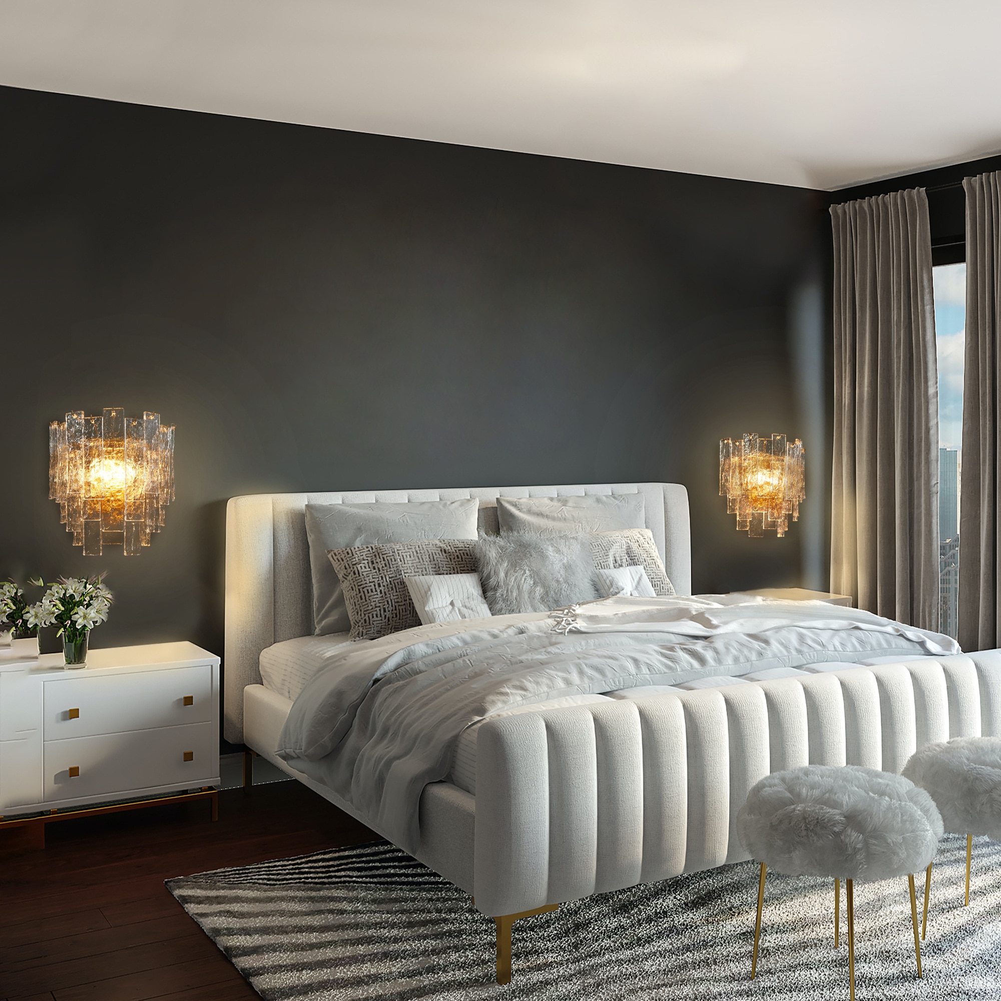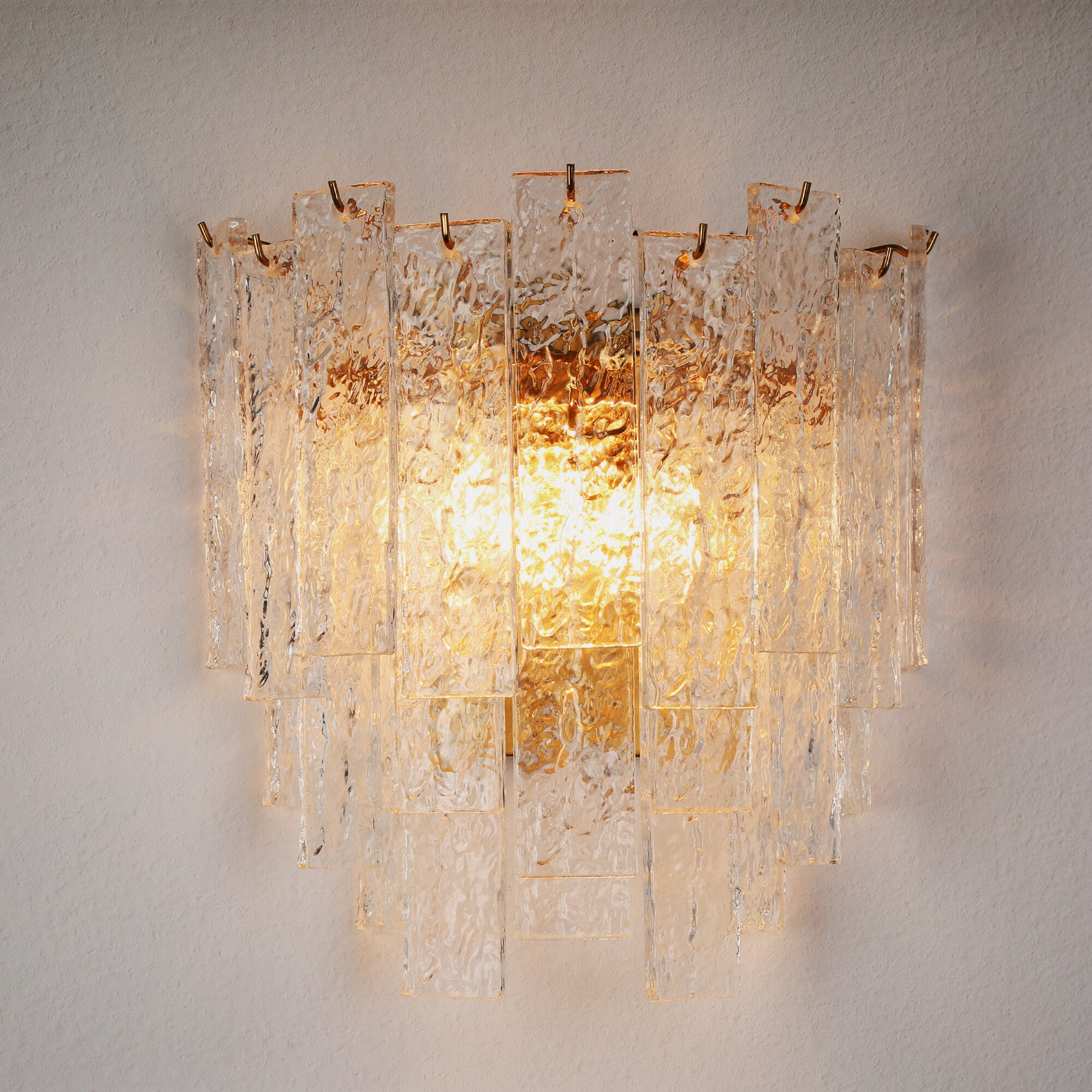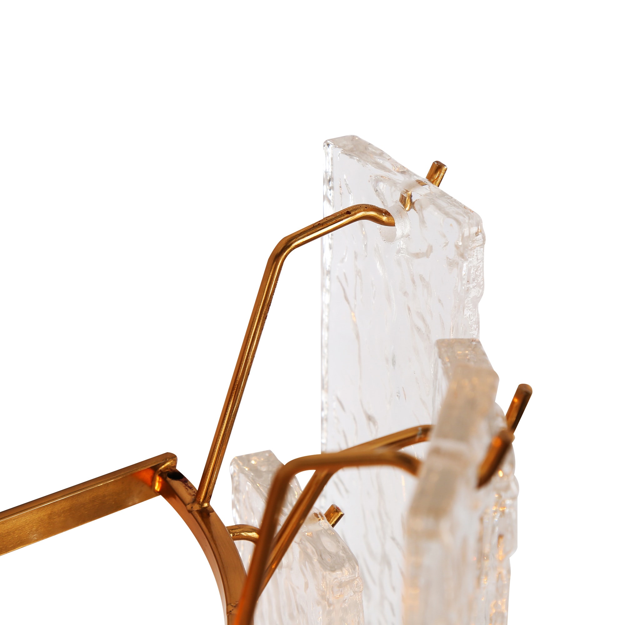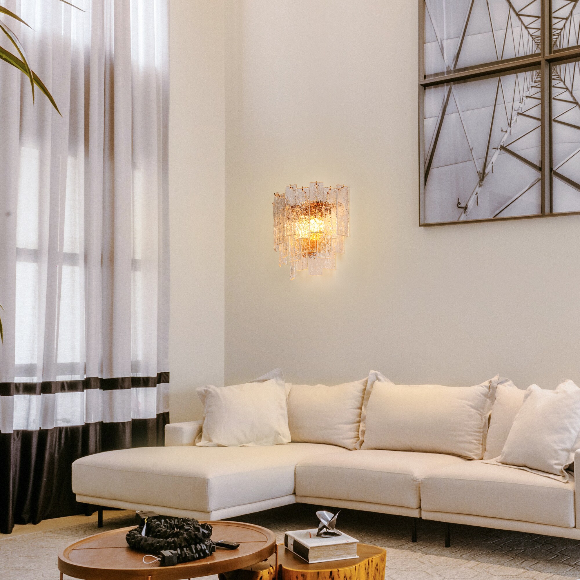 The Engaveric Collection evokes a stunning ice sculpture in crystal, featuring Glacier Crystal Glass panels that capture the essence of frozen beauty. The flat geometric panels of textured glass hang in linear architectural tiers, accented with icicle strip crystal glass that adds a unique touch of elegance. The frosted panes lend the light a soft, diffused glow, while the glittering finishes enhance the overall brilliance. This linear pendant light is perfect for kitchen islands, dining areas, or living rooms, offering a blend of sophistication and functionality. Its sleek design, paired with gold accents, makes it a striking addition to a variety of interior styles.