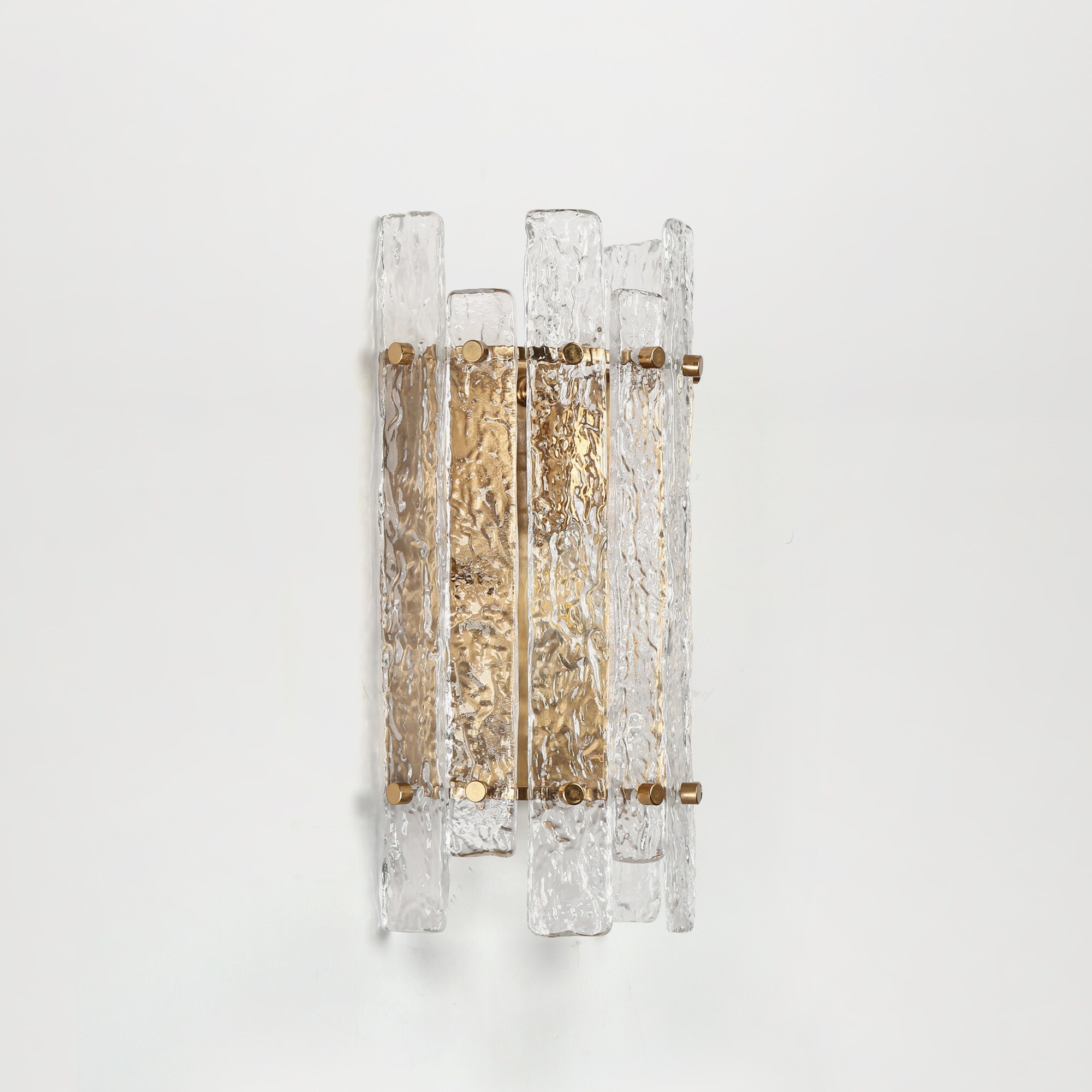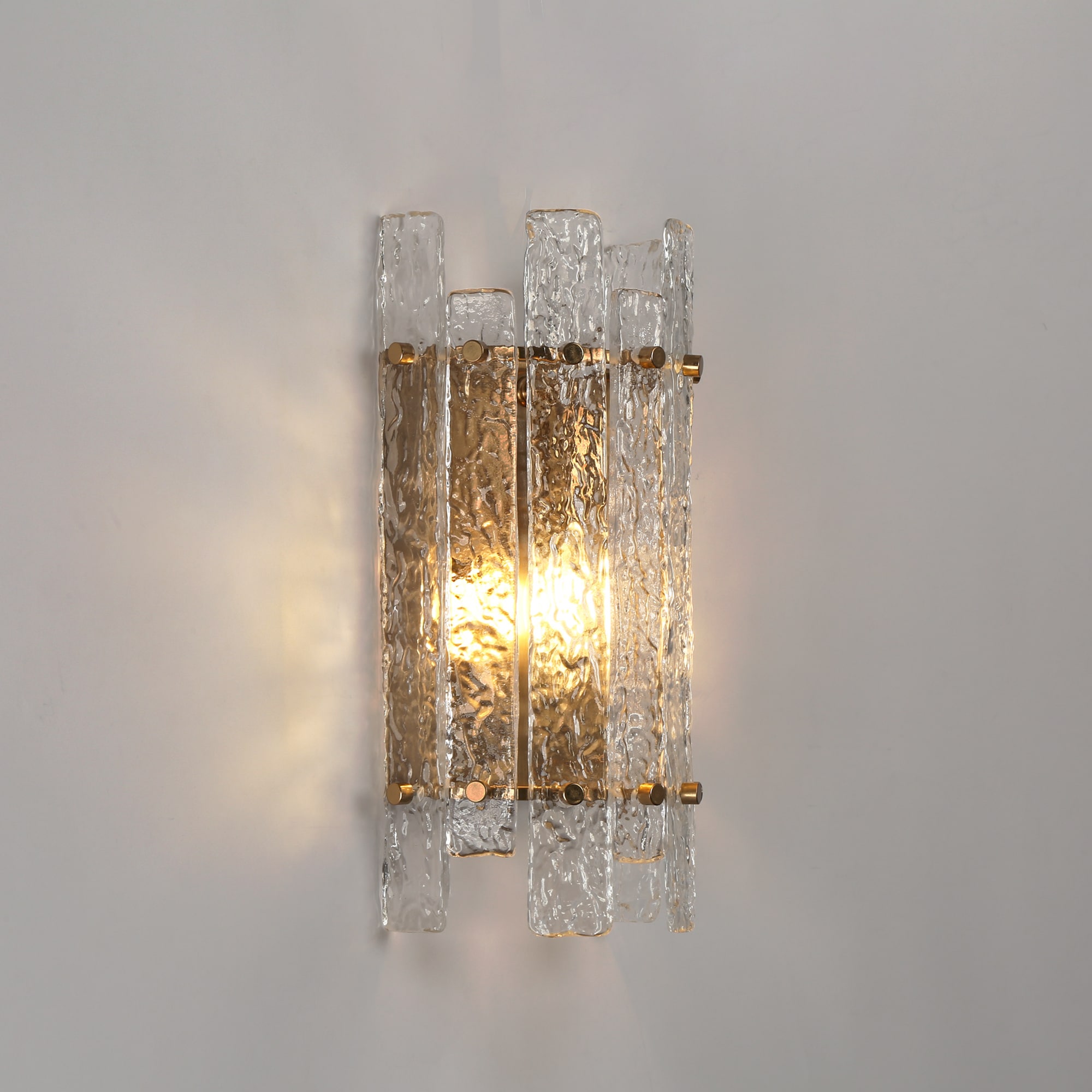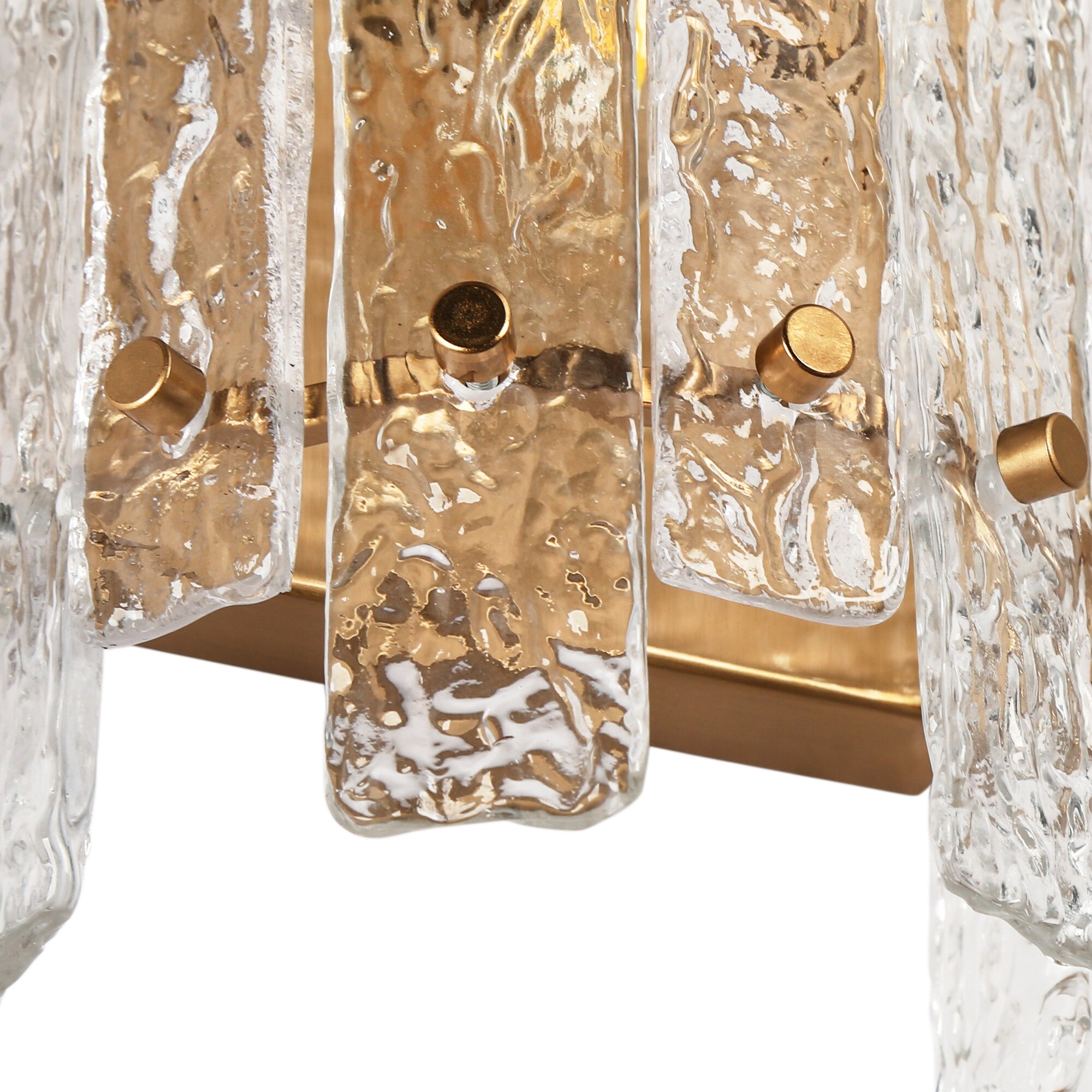 Elevate your interior with this luxurious wall sconce, a perfect fusion of glamour and sophistication. Designed to complement modern and contemporary spaces, this exquisite gold-finished fixture features ice-textured glass panels, creating a mesmerizing interplay of light and shadow. Whether placed in an entryway, living room, bedroom, or hallway, it adds an elegant touch while casting a warm, inviting glow. The refined electroplated gold-tone iron frame exudes a timeless charm, while the glacier-like glass brings an artistic, high-end aesthetic. When illuminated, the textured glass refracts light beautifully, producing a captivating halo effect that enhances the ambiance. Transform your space into a luxurious retreat with this glam-inspired wall sconce—perfect for bathrooms, vanity areas, bedrooms, and more!