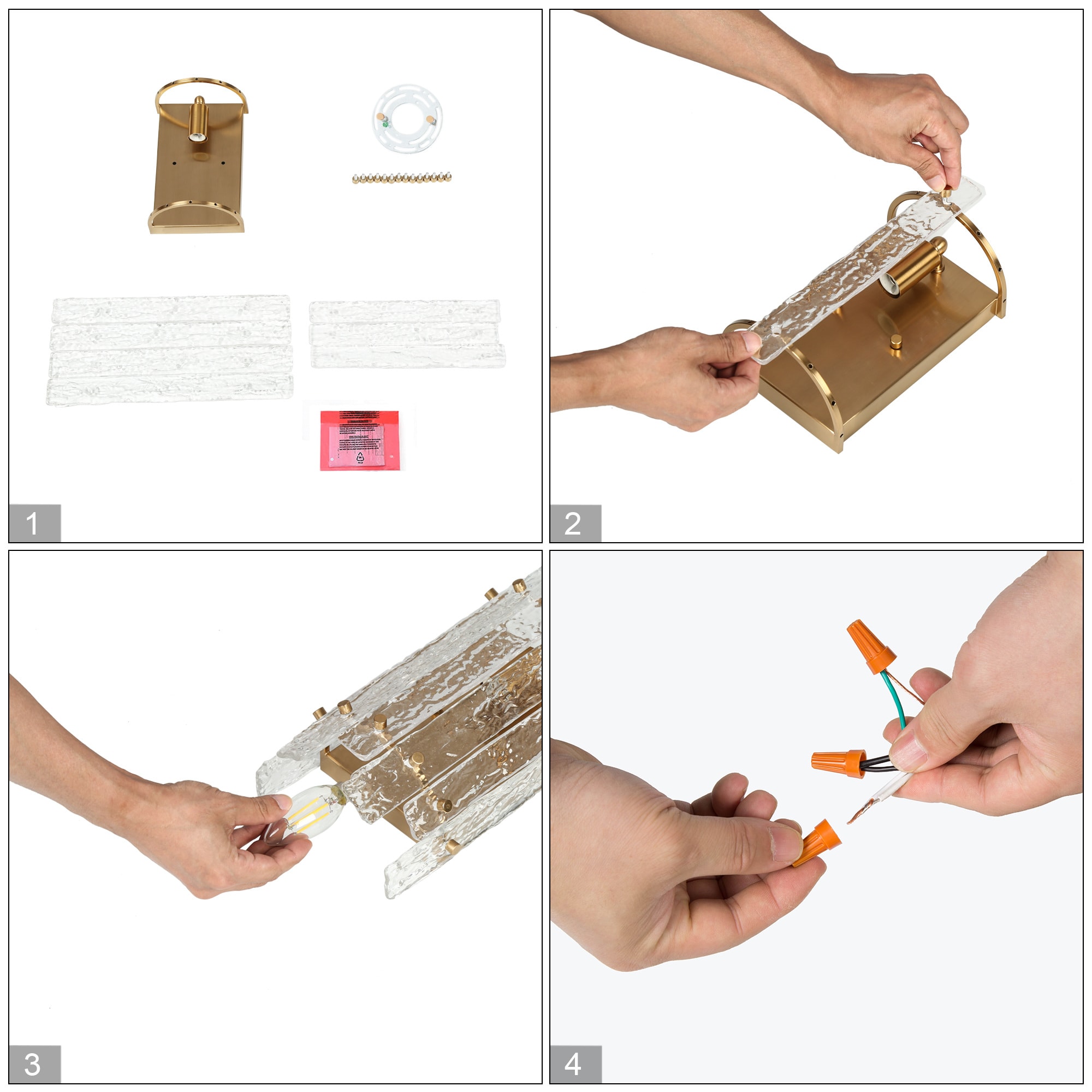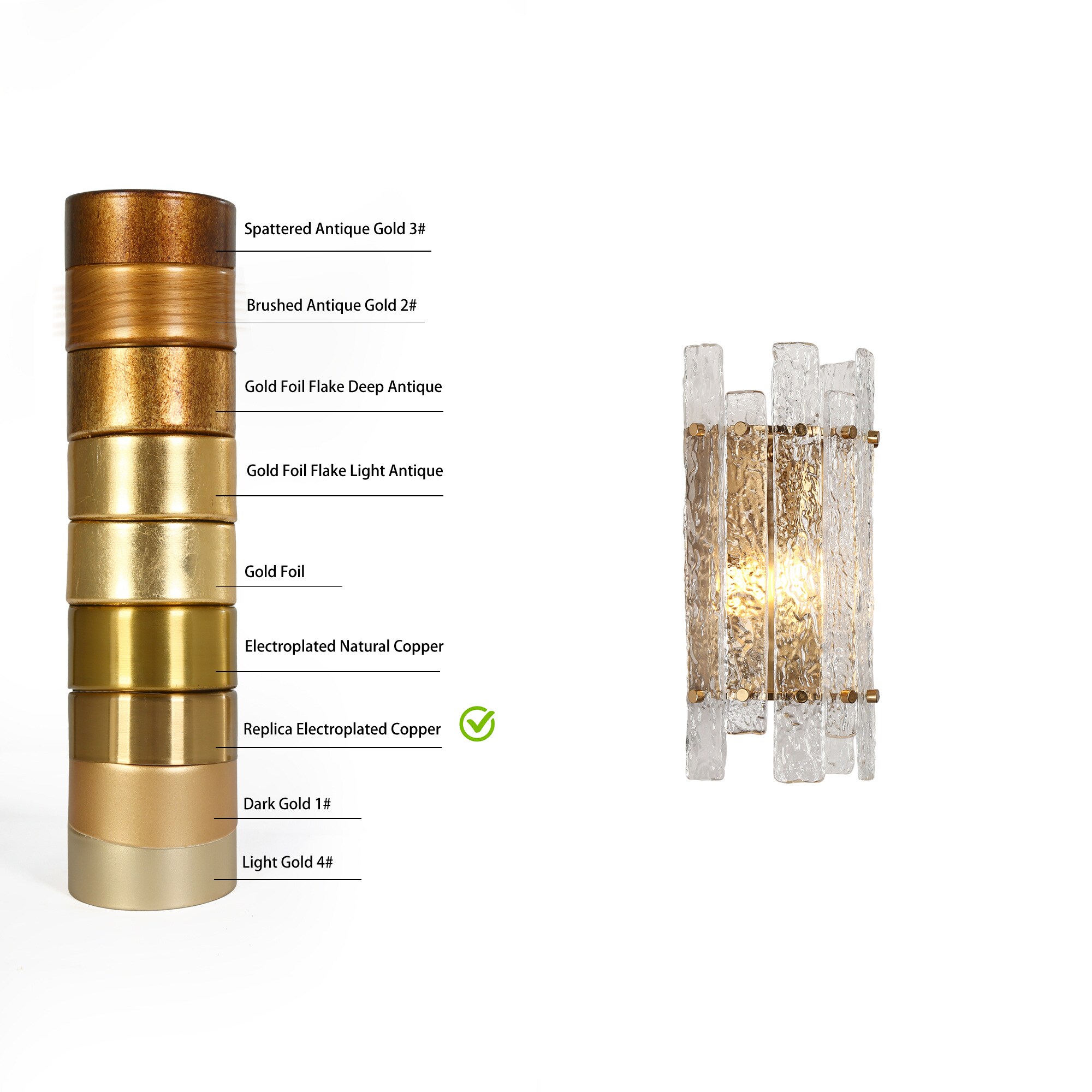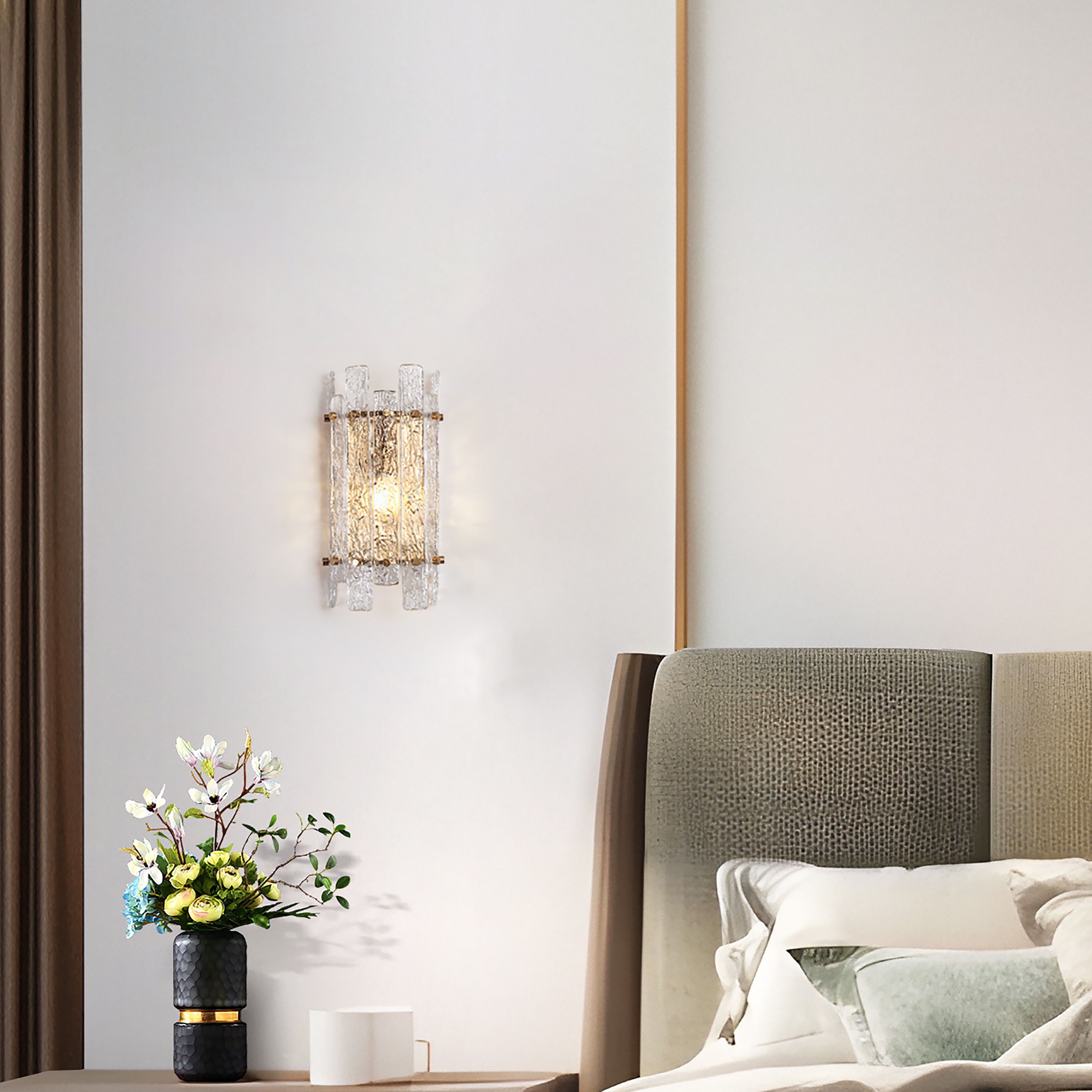 Elevate your interior with this luxurious wall sconce, a perfect fusion of glamour and sophistication. Designed to complement modern and contemporary spaces, this exquisite gold-finished fixture features ice-textured glass panels, creating a mesmerizing interplay of light and shadow. Whether placed in an entryway, living room, bedroom, or hallway, it adds an elegant touch while casting a warm, inviting glow. The refined electroplated gold-tone iron frame exudes a timeless charm, while the glacier-like glass brings an artistic, high-end aesthetic. When illuminated, the textured glass refracts light beautifully, producing a captivating halo effect that enhances the ambiance. Transform your space into a luxurious retreat with this glam-inspired wall sconce—perfect for bathrooms, vanity areas, bedrooms, and more!