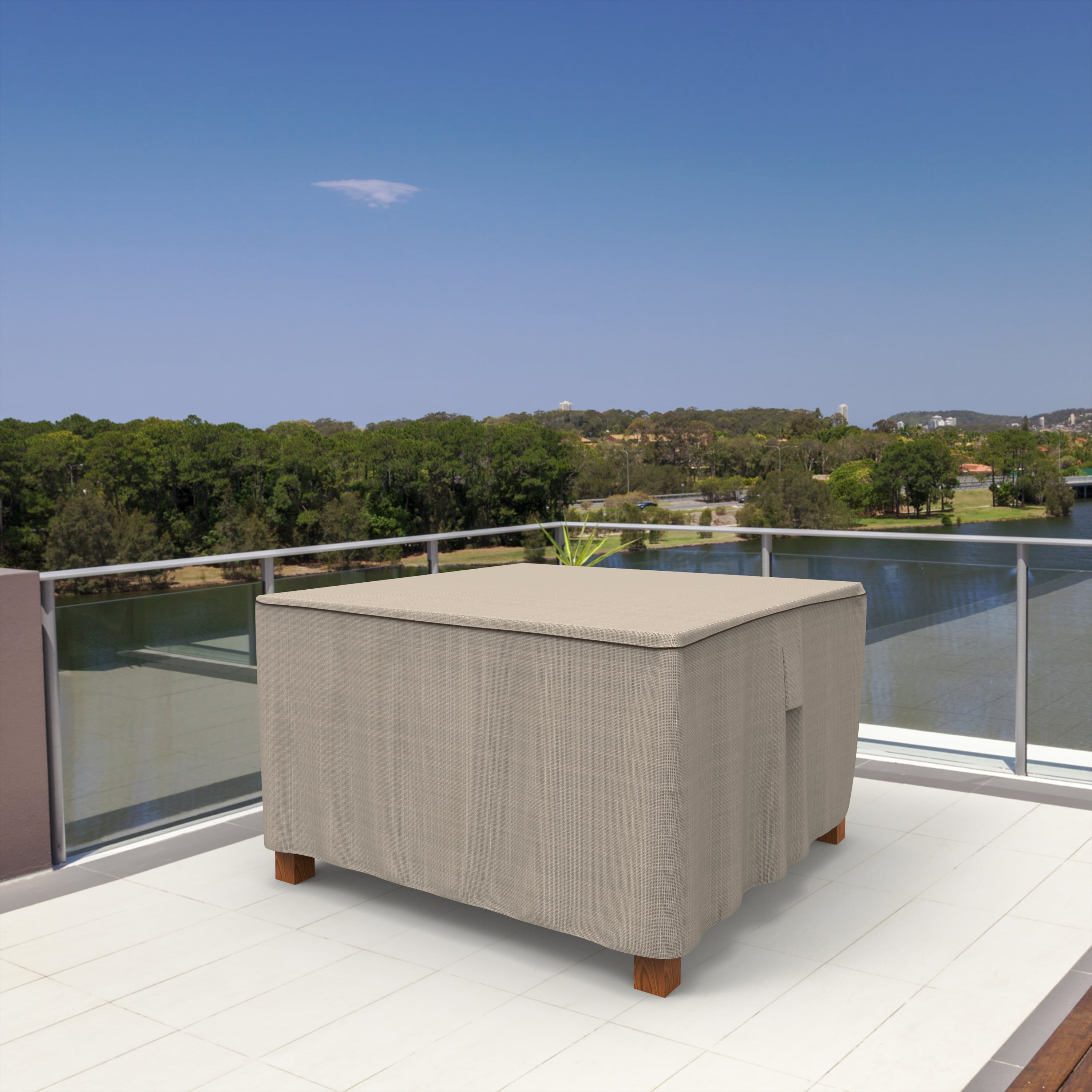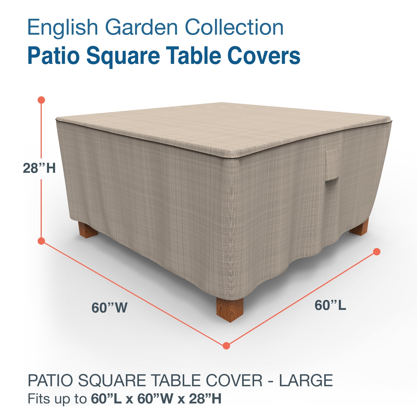 This square patio table cover measures 28″ High x 60″ Long x 60″ Wide This waterproof square patio table cover made from brown and beige, heavy duty 600 denier Polyester This heavy duty square patio table cover provides long-lasting all weather protection to your patio table This outdoor patio furniture cover is 100% waterproof and UV Resistant Features ultrasonically welded seams Budge cover is fully breathable to prevent build-up of condensation
