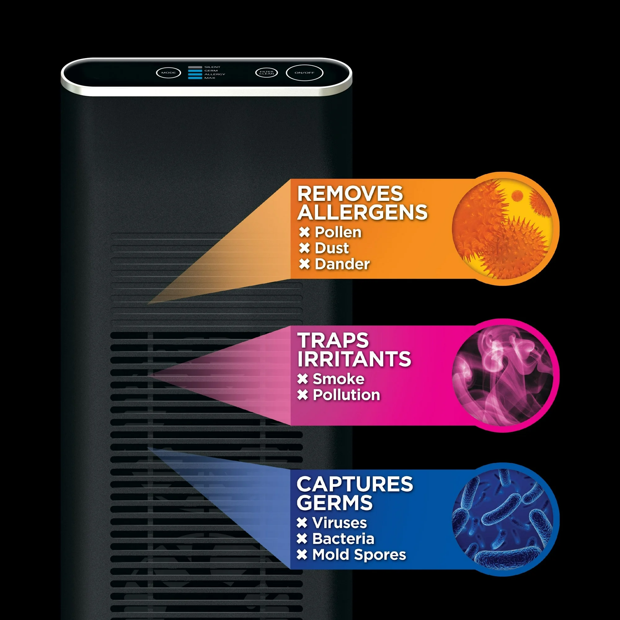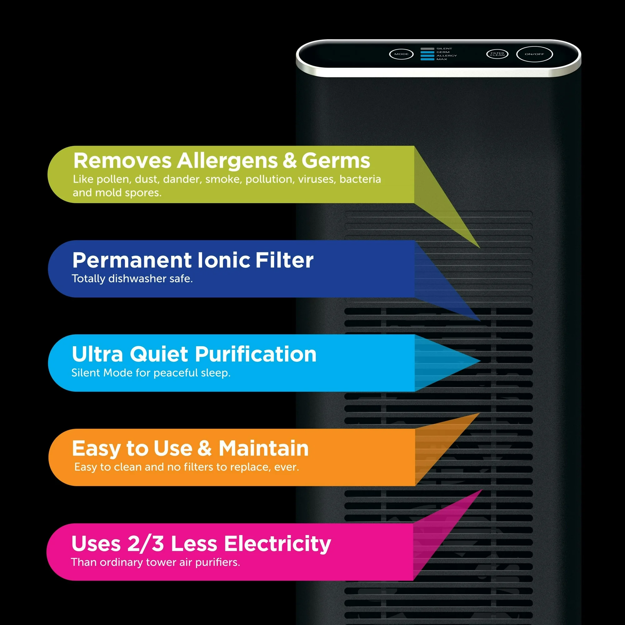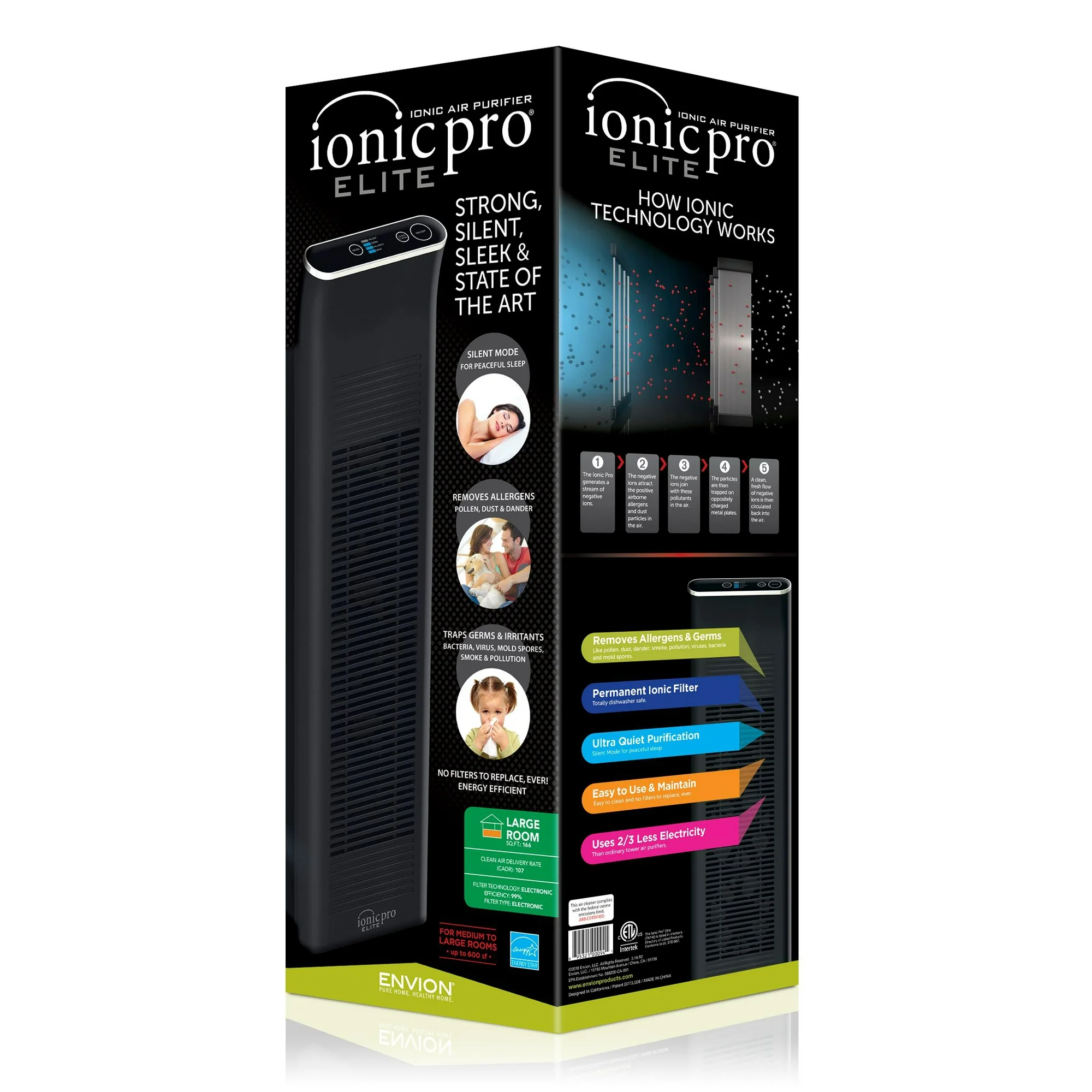 Family-oriented products that seamlessly blend into your home environment and work in the background Our Ionic line of home air purifiers come in Black Our goal is to ensure you have a healthy home filled with healthy air Our Ionic Blade filters ensure the air your family breathes is free of allergens, pollutants, irritants, germs, and toxins. All our Ionic Pro products are built for maximum effectiveness and operate with completely silence, so you can go about your normal routine without distractions The Ionic line includes models for a wide variety of needs. Each silently reduces cold & flu viruses, mold spores, and even staph and strep bacteria. All at a price that won’t bust your budget. 265 sq ft Electrostatic filter Contaminants removed: Dust