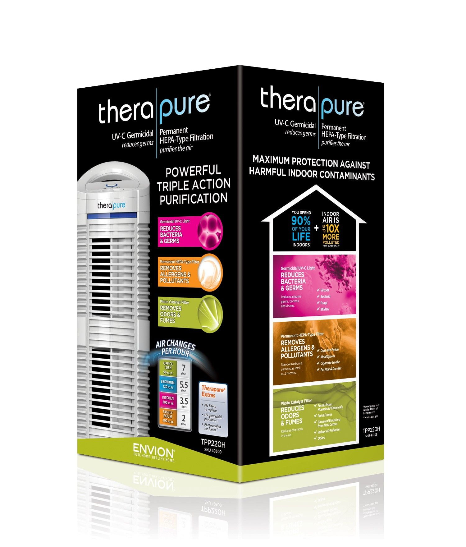 Envion Therapure 220H UV Germicidal, HEPA Style Air Purifier, 3-Speed, White Capacity to clean 208-square ft. room 3x per hour Permanent, easy-to-clean HEPA type filter captures particles as small as .03 microns UV light helps reduce airborne germs Photo-Catalyst Filter reduces harmful chemicals in the air Silent for easy sleeping Photo catalyst filter that doesn’t need to be replaced Three-speed fan Vacuums out and detoxifies air For small to medium spaces Perfect for urban living spaces with high pollution CADR: Pollen – 86, Dust – 80, Smoke – 83 3-speed fan setting lets you select the desired cleaning level No replacement filters needed. Simply vacuum out filters Low power consumption and energy efficient Great for homes with pets and other allergens These Hidden Airborne Polluters Can Make Your Family Sick: Each day, we inhale over 3000 gallons of air. The air we breathe circulates throughout our entire body, including our heart, lungs, kidneys and liver. When you breathe polluted air, you’re introducing toxins into every cell of your body. Symptoms of indoor air pollution include nasal congestion, fatigue, sneezing, wheezing, irritability, itchy throat, nose, or skin. Also, dry or watery eyes, hives, coughing – even stomach aches. These are some of the most common indoor contaminants, all of which can be removed or significantly reduced with the Therapure TPP220 Air Purifier. • CHEMICAL GASSES: Most house paint, carpeting and furniture, upholstery and flooring outgas toxic VOCs, or Volatile Organic Compounds, right into our living space. • PETS: Dogs and cats bring odors and germs from outdoors into the house. They also release airborne dander, a known allergen, from their hair and skin. • ALLERGIES: Hay fever caused by pollen particles in the air in spring and fall can cause irritation to the eyes and could lead to asthma or respiratory problems in susceptible adults and children. • GERMS and VIRUSES: A sick person does not need to be coughing or sneezing to get you sick. Airborne flu and other viruses float throughout the air just through normal breathing. • MOLD SPORES, MILDEW AND BACTERIA: All of these thrive in damp and humid areas, such as bathrooms, kitchens and laundry rooms. They can cause severe breathing difficulties if inhaled. • CREATURES: Dust mites and their droppings move through the air in your home and can cause respiratory issues and skin allergies. • COOKING: Non-stick cookware gives off invisible gasses that can kill small birds. Pungent cooking odors such as curry, onions and strong spices can last for days. Take a look at all Envion Air Purifiers for all your air cleaning, purifying detoxification needs: including Ionic Pro, Therapure, and Allergy Pro models Visit for more information and other product offerings.