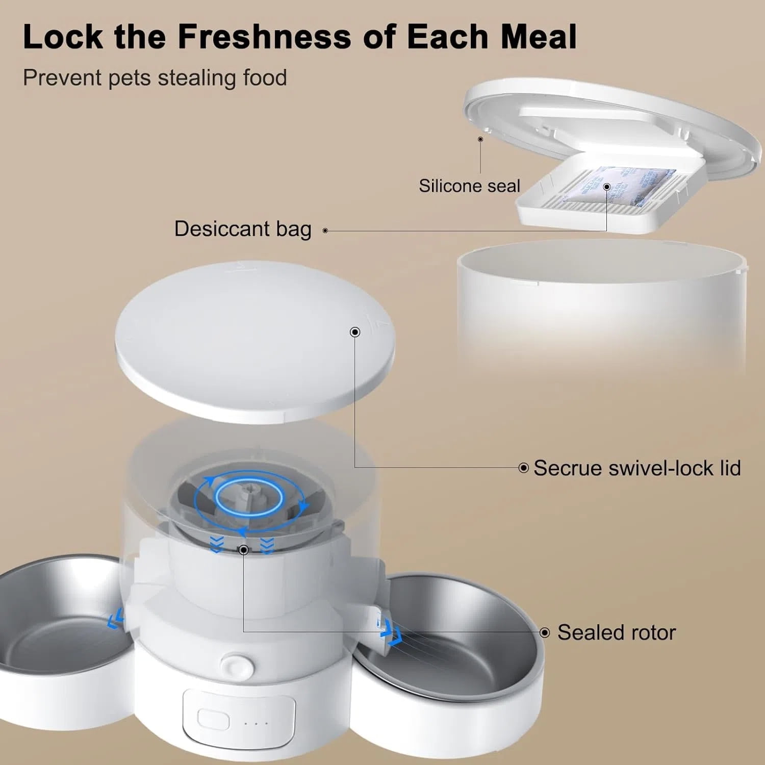 Our automatic cat food dispenser boasts a built-in desiccant bag and a secure sealing strip, effectively preserving the freshness and crunchiness of your pet’s food. Additionally, a desiccant bag within the lid serves to dehumidify and thwart moisture intrusion. The innovative sealed revolving door design automatically shuts the feeding port after each meal, providing a barrier against ants and insects.