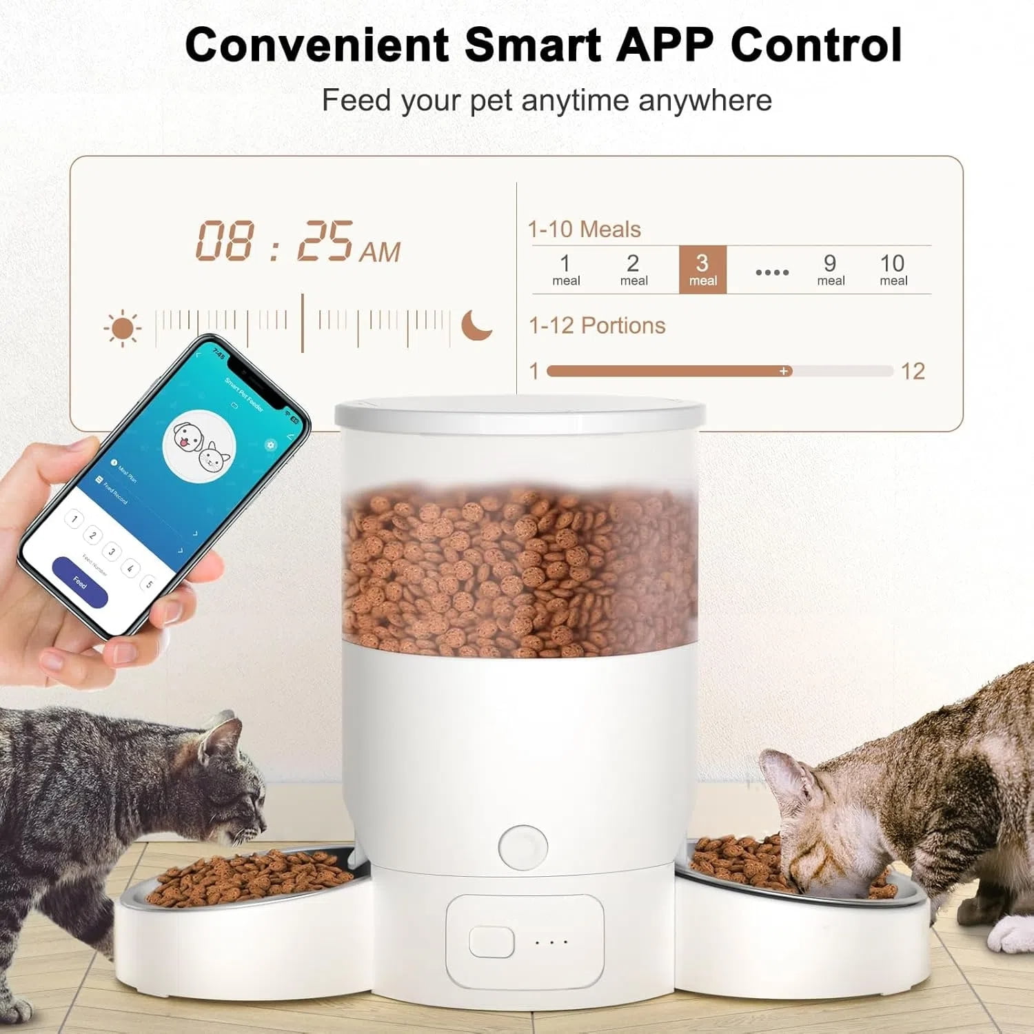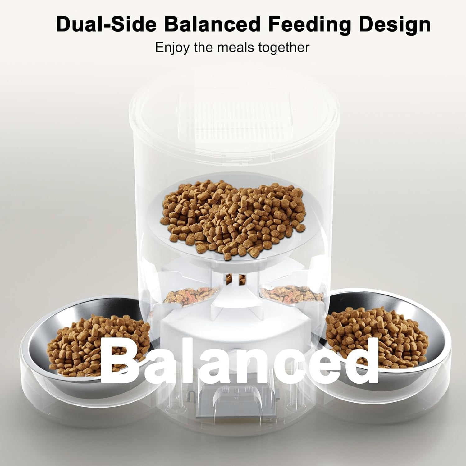 Brand: Mgaxyff. The Dual Cat WIFI Automatic Feeder ensures even distribution of pet food on both sides, eliminating any uneven feeding. Its dual feeding system creates a peaceful dining atmosphere for your pets, eliminating food competition concerns.