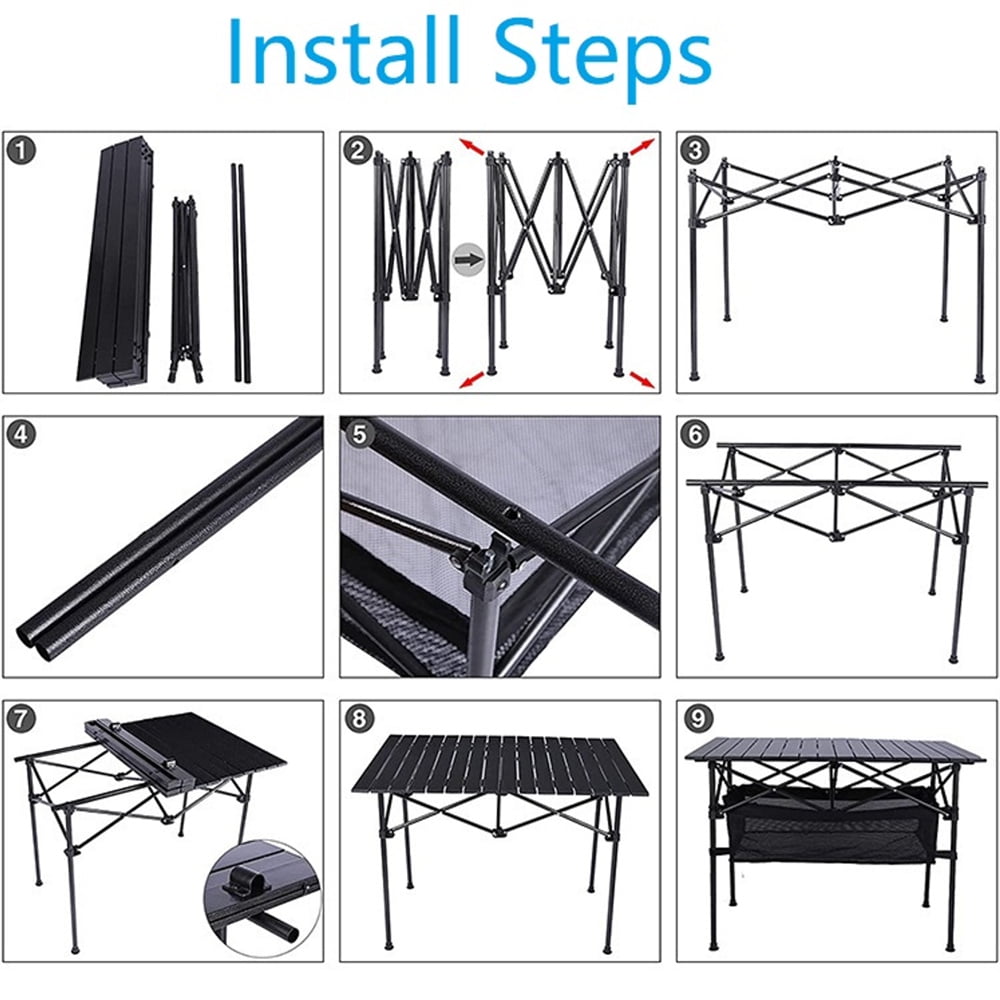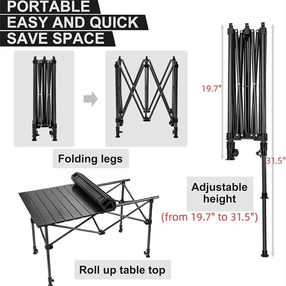 WATERPROOF & HEAT-RESISTANT Our Portable Camping Table has a special process to make its table top color lasting forever, any oil stains will not be absorbed, you can directly clean it with water or soap. (TIPS: Soap does NOT damage the appearance or lifetime) Waterproof, heat-resistant and scratch-resistant(matte texture design) features make this Folding Camp Table look as well as new even if you use it in a rainy, snowy forest. LIGHTWEIGHT ENOUGH This Camping Table is made of Carbon Steel, it’s only 11.57 lbs; The folding size of this Compact Folding Camping Table with carry bag is only (27.95 x 8.66 x 6.3) in. The desktop and Frame are foldable and easy to store it in your beach cart, kayak or canoe, you can easily carry it for camping, hiking, fishing, backyard, picnics, BBQ, party and indoor. DURABLE & STURDY Each table top part of the roll up Camping Table is connected with strengthened double hinge to make it high elasticity and very tight; Portable Camping Table have a unique non-slip foot cover design with extra stability on any flat ground; The four-legged triangular structure frame make the Folding Camping Table support up to 220 lbs. LARGE MESH STORAGE The Folding Camping Table is a product that combines beauty, portability and practicality. UNFOLDING SIZE: 47.24″ x 21.56″ x (19.7 to 31.5)” offers enough seating room for 4-6 people. Mesh pockets provide large space to store snacks, magazines or supplies, etc. It can be quickly removed from all four legs when you don’t need it. NO TOOLS NEEDED! The Collapsible Camping Table is made up by two parts: Table top with unique hinge design & Triangular structure Steel frame table legs. You need to open the pop-up triangular frame legs of the Folding Camping Table first, then press the table top firmly into the Triangular frame’s groove, you can enjoy your leisure time. It’s that simple! You can assemble it in seconds or even with one hand! Specification: Item Type: Outdoor Folding Table Material: Carbon Steel Tabletop Size: 47.24″ x 21.65″(LxW) Adjustable Height: from 19.7″ to 31.5″ Color: Black Weight Capacity: 220 lbs Feature: adjustable height, foldable, portable, waterproof, heat-resistant, sturdy, lightweight Package List: 1 x Folding Table Stand 1 x Folding Table 4 x Steel Tubes 1 x Storage Mesh Net 1 x Carrying Bag