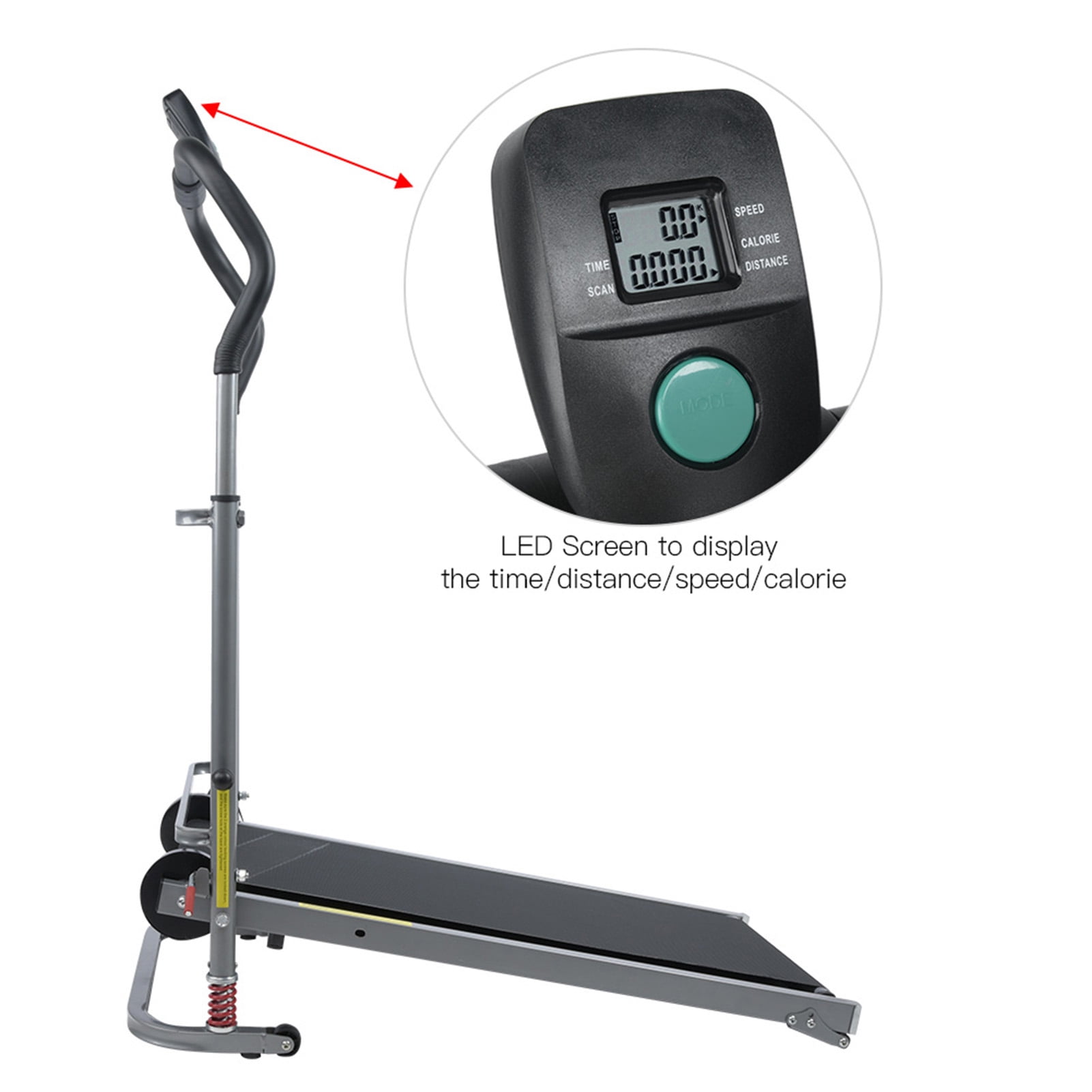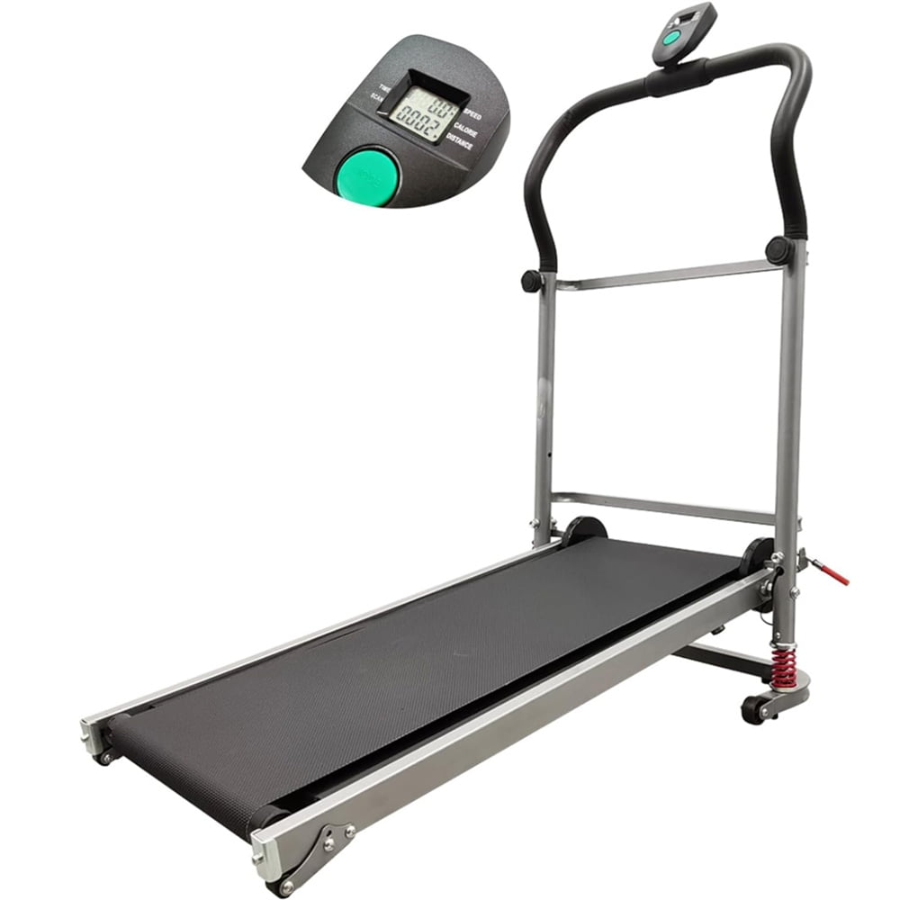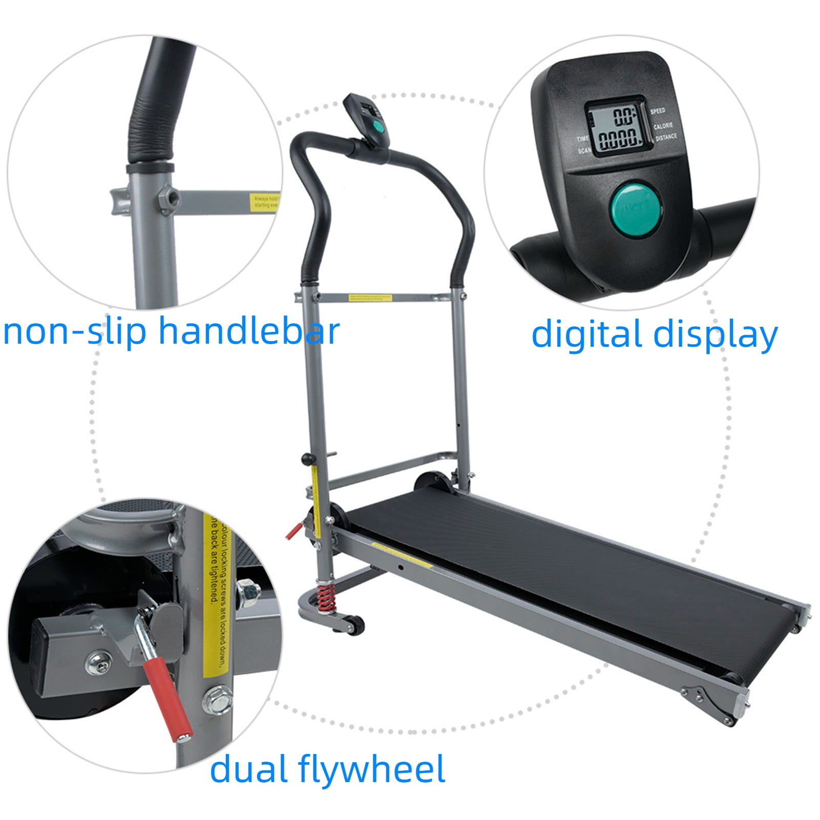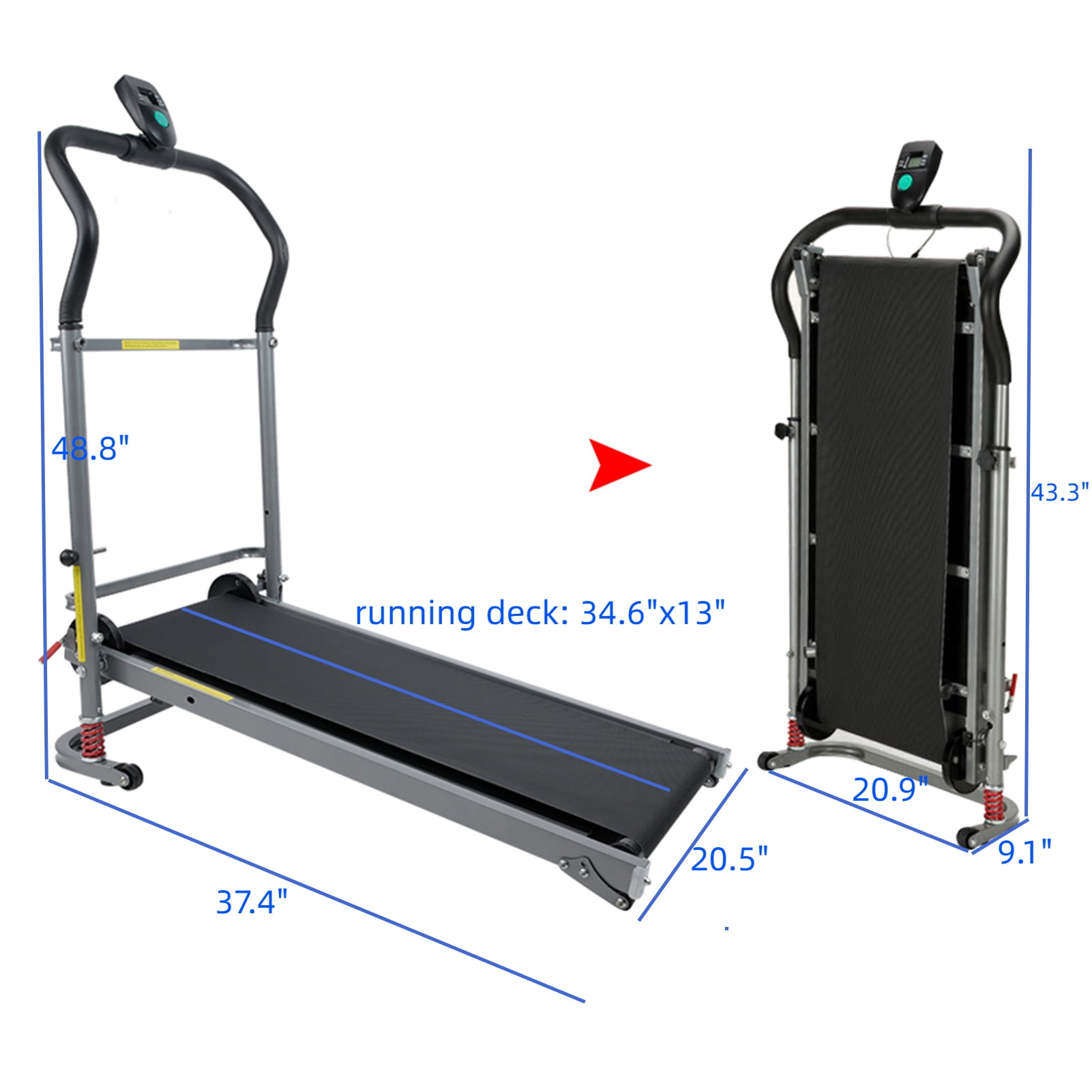 Begin your fitness journey and start walking on the manual walking treadmill. Improve health as you walk on the treadmill that requires no plugs or electricity. Simply get on and go! Hold onto the soft foam hand grips which allow you to maintain balance as you walk on the slight fixed incline. The incline helps move the treadmill as you walk while also giving you a subtle challenge during walking. The compact walking treadmill is excellent for small studios or apartments. Unfolded size: 37.4″L x 20.5″W x 48.8″H. The small treadmill with transport wheels can be easily folded and rolled away into a closet or from room to room. Folded size: 43.3″L x 20.9″W x 9.1″H. The benefits of walking include increased blood circulation, strengthening of bones and muscles, and an improvement in balance, mood, and coordination. After you complete your cardio session, simply step off using the non-slip, gripped side railings. Keep track of all your fitness progress with the digital monitor. The fitness monitor tracks time, speed, calorie burn, steps, and scan. The sturdy frame supports a maximum weight of 242 lbs. Health and wellness are just steps away with this Manual Walking Treadmill. EXCELLENT CARDIO BENEFITS This affordable treadmill will help you start your fitness journey! Walking can significantly improve mental and physical health. The compact design of the treadmill will get you into shape regardless of home size. COMPACT AND ERGONOMIC This compact, lightweight treadmill is excellent for small spaces. The running belt is 34.6″ x 13″. This treadmill is durable and can withstand power walking or light jogging. DIGITAL MONITOR Track fitness progress on the easy-to-read digital monitor. The monitor displays time, speed, distance, calories. NON-ELECTRIC This space-saving treadmill machine requires no electric outlet and remains low maintenance. Easy folding functionality and transportation wheels allow easy mobility and storage. NON-SLIP RUNNING BELT Feel safe and secure on the smooth belt. The maximum user weight is 242 lbs. Specification: Item Type: Manual Treadmill (NON-ELECTRIC) Unfolded Size: 37.4″L x 20.5″W x 48.8″H Folded Size: 43.3″L x 20.9″W x 9.1″H Running BELT Size: 34.6″ x 13″ Maximum Weight Capacity: 242 lbs Material: Steel Battery: 1 x AA Battery(Not Included) Product Weight: 36.26 lbs Digital Display: display time/distance/speed/calories burned with 2 Different Inclines: 3° and 7° Shock Absorbing design to protect your knees during exercise. The Armrest Height is Adjustable with Dual Flywheels with Transport wheels Package List: 1 x Treadmill 2 x Screw 2 x Screwdriver 2 x Latch 1 x Oil 15g 1 x Manual Note: This product is not electric, and the instrument panel does not have the battery.